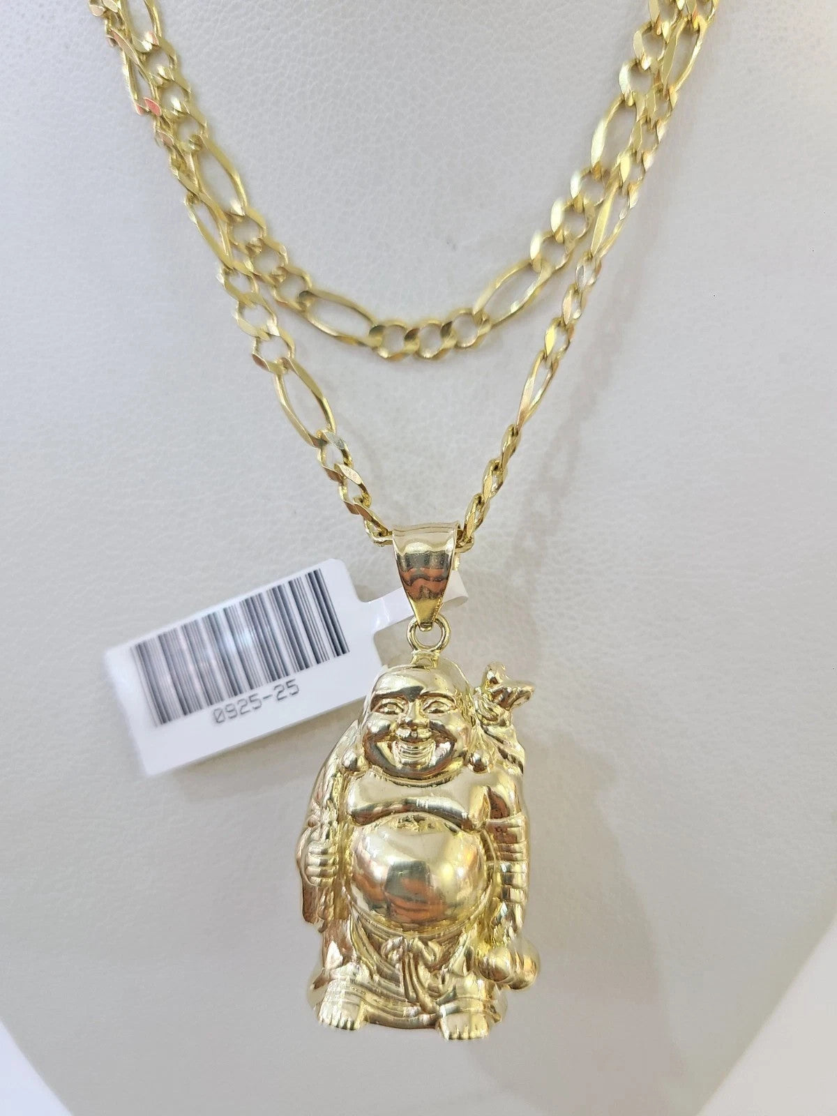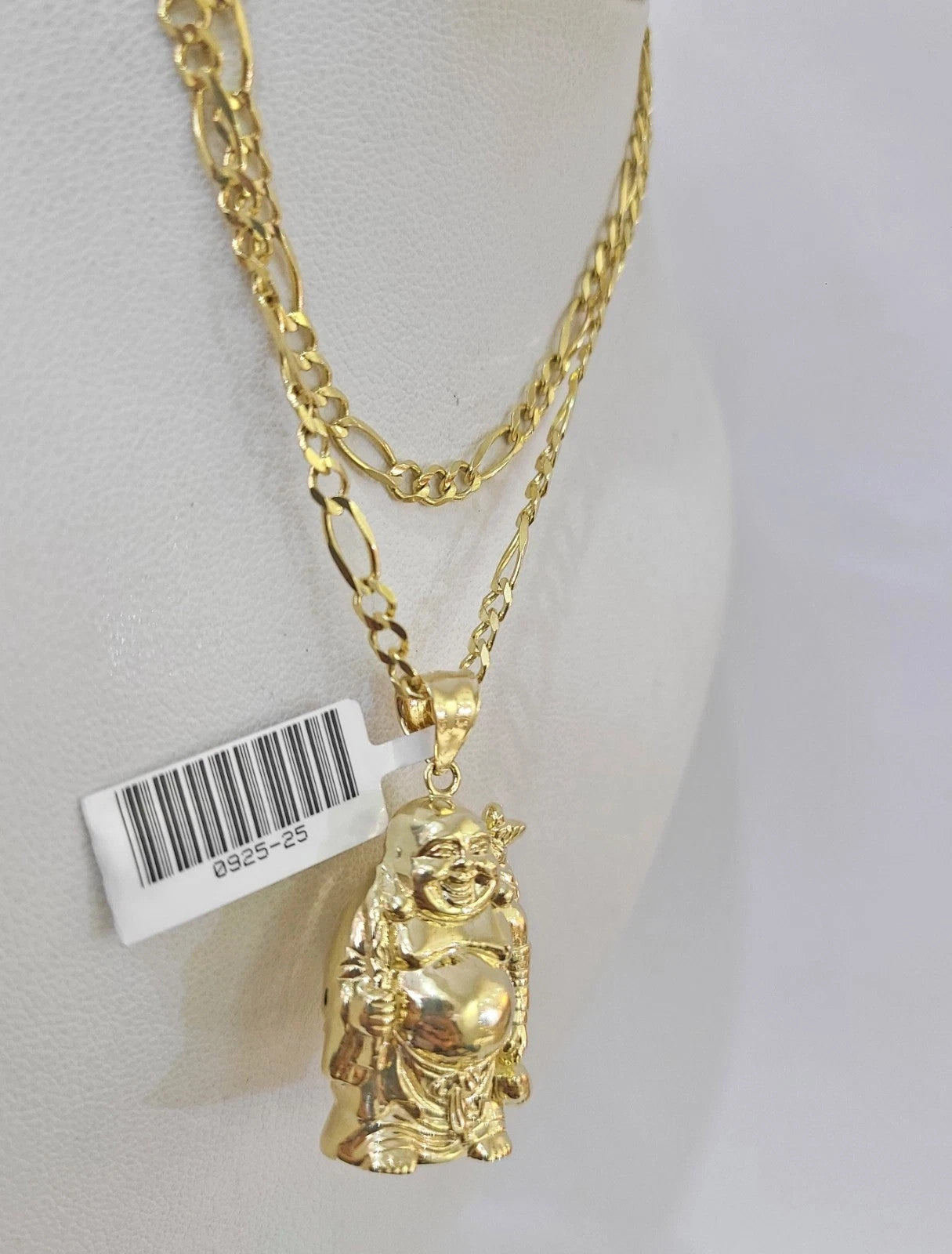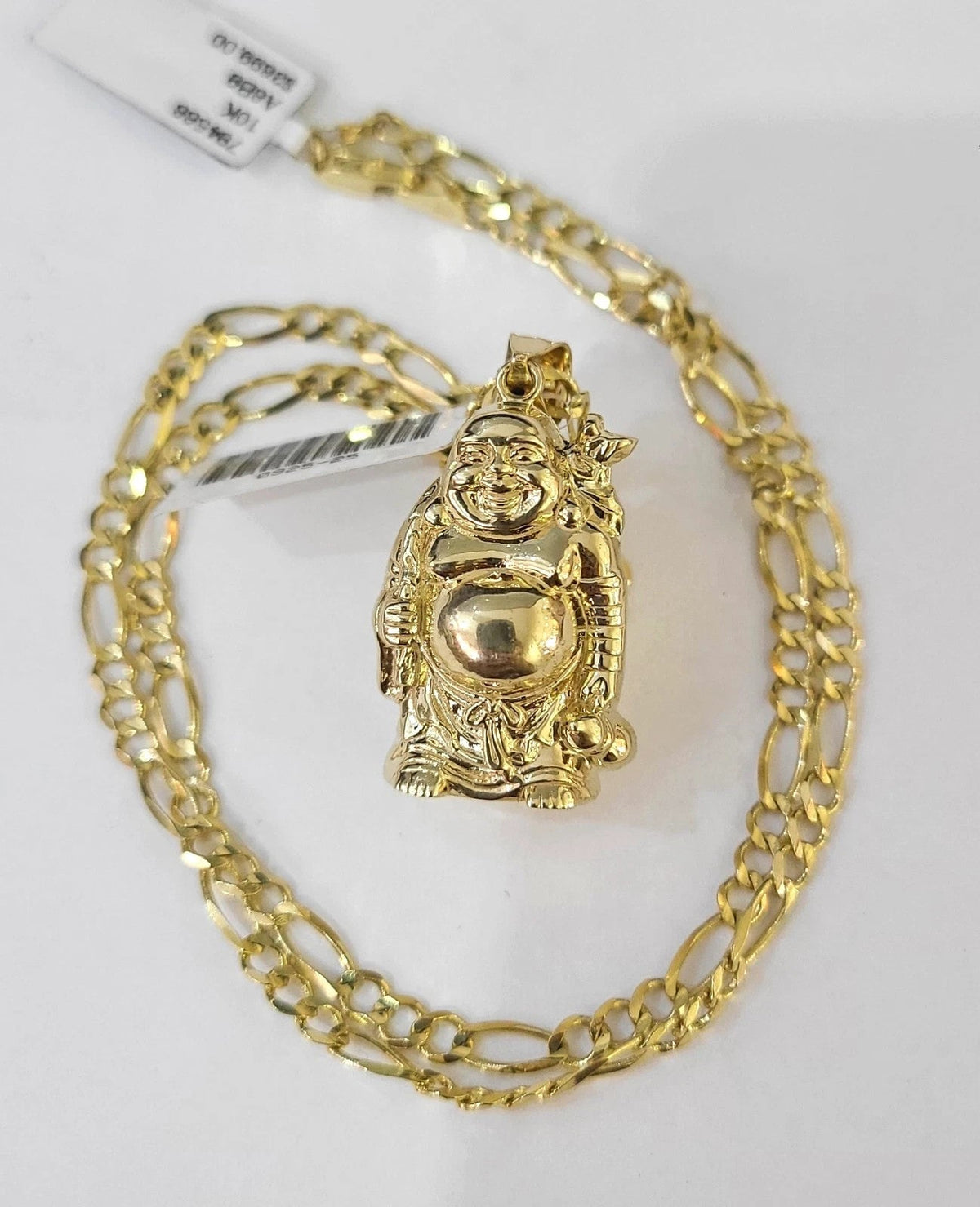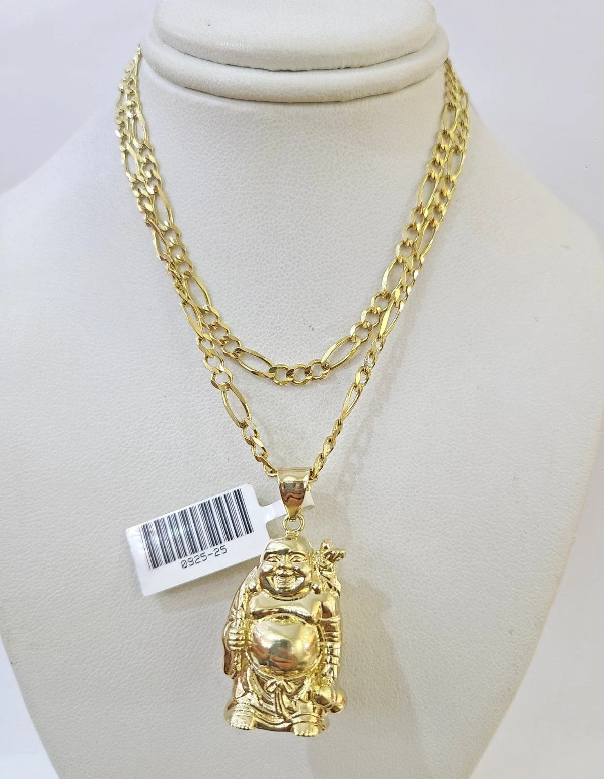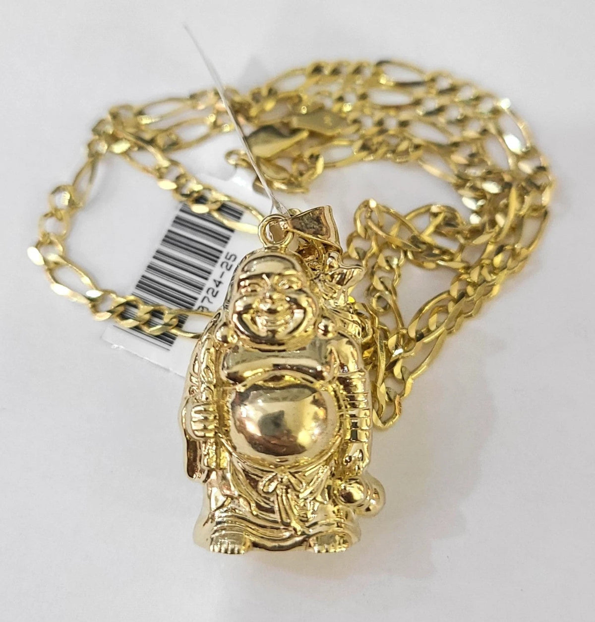 10k Figaro Chain Laughing Buddha Pendant Charm Gold 3mm 20-28 inch SET Necklace