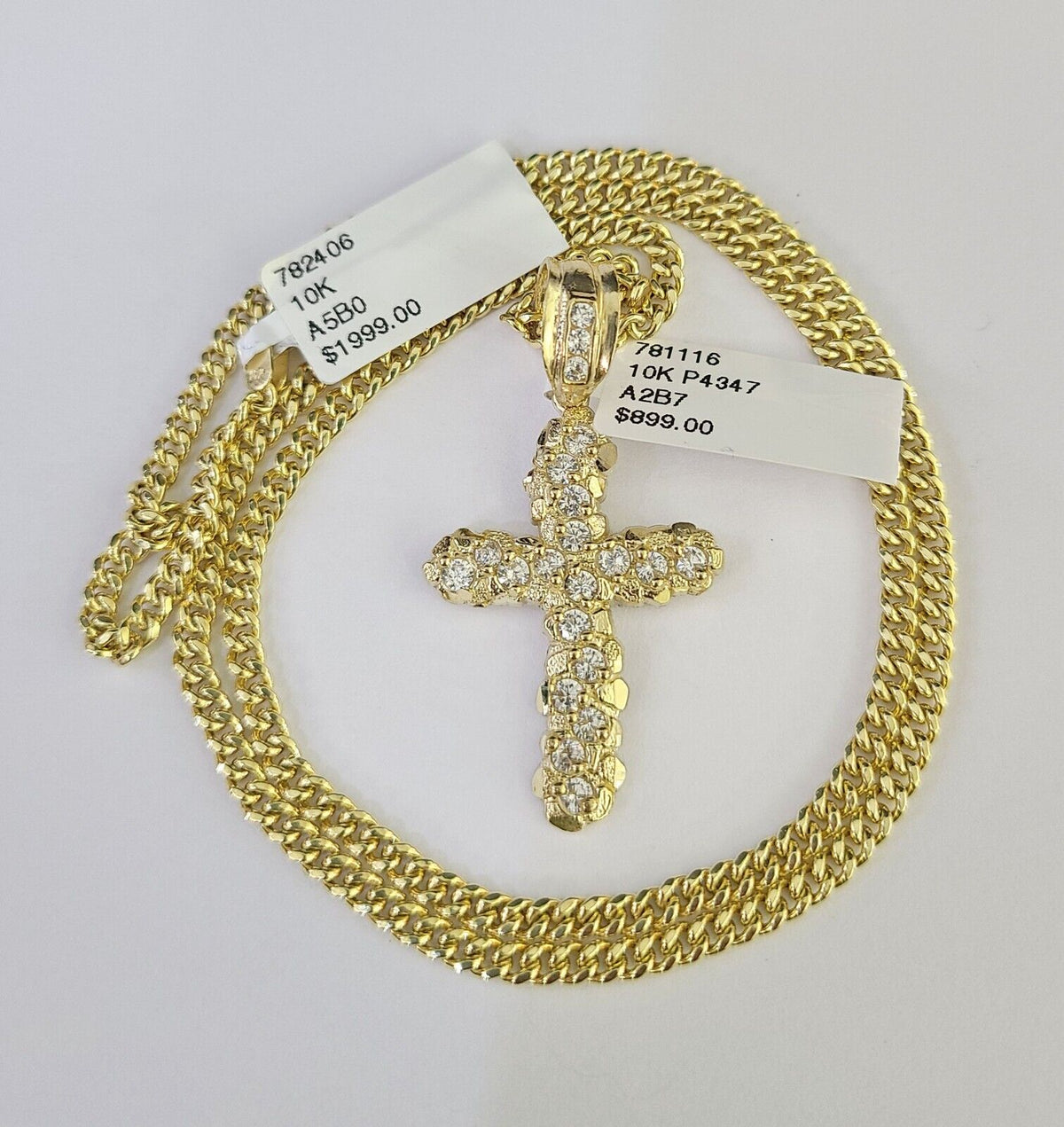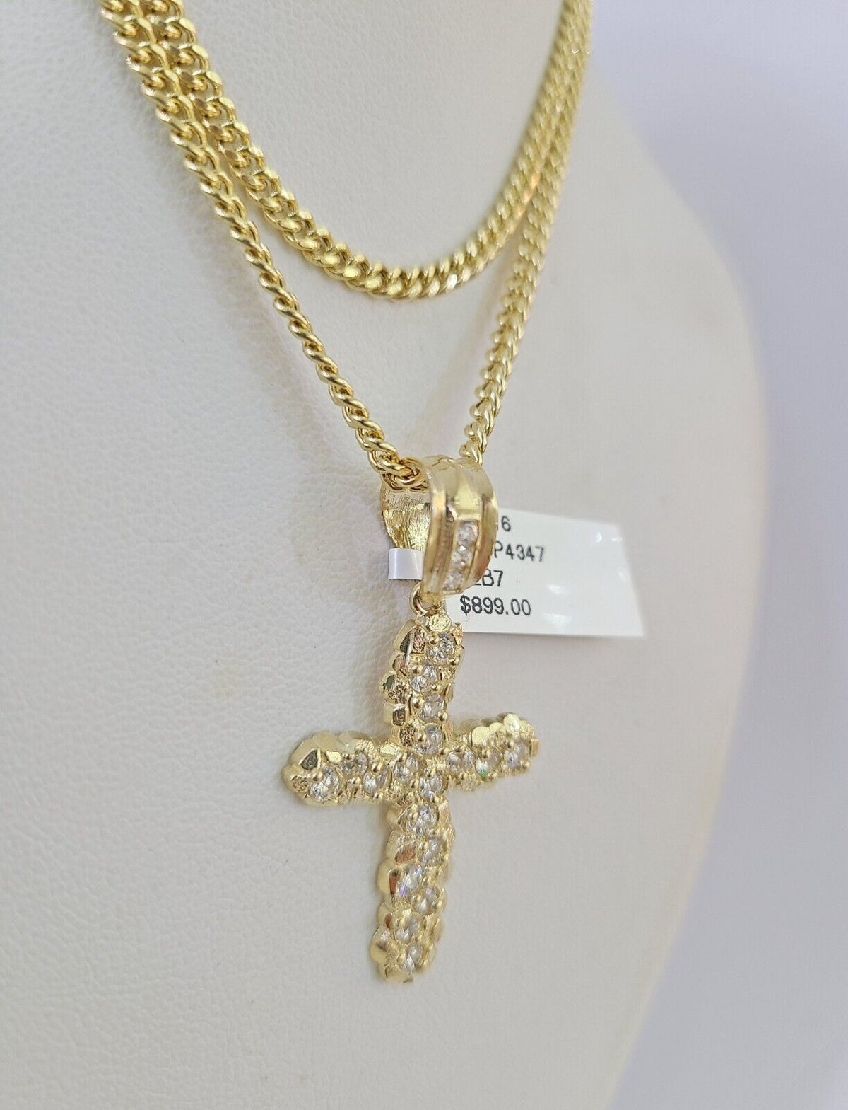 10K Gold Miami Cuban Chain Jesus Cross 18"-28" 3mm Pendant Necklace SET Charm