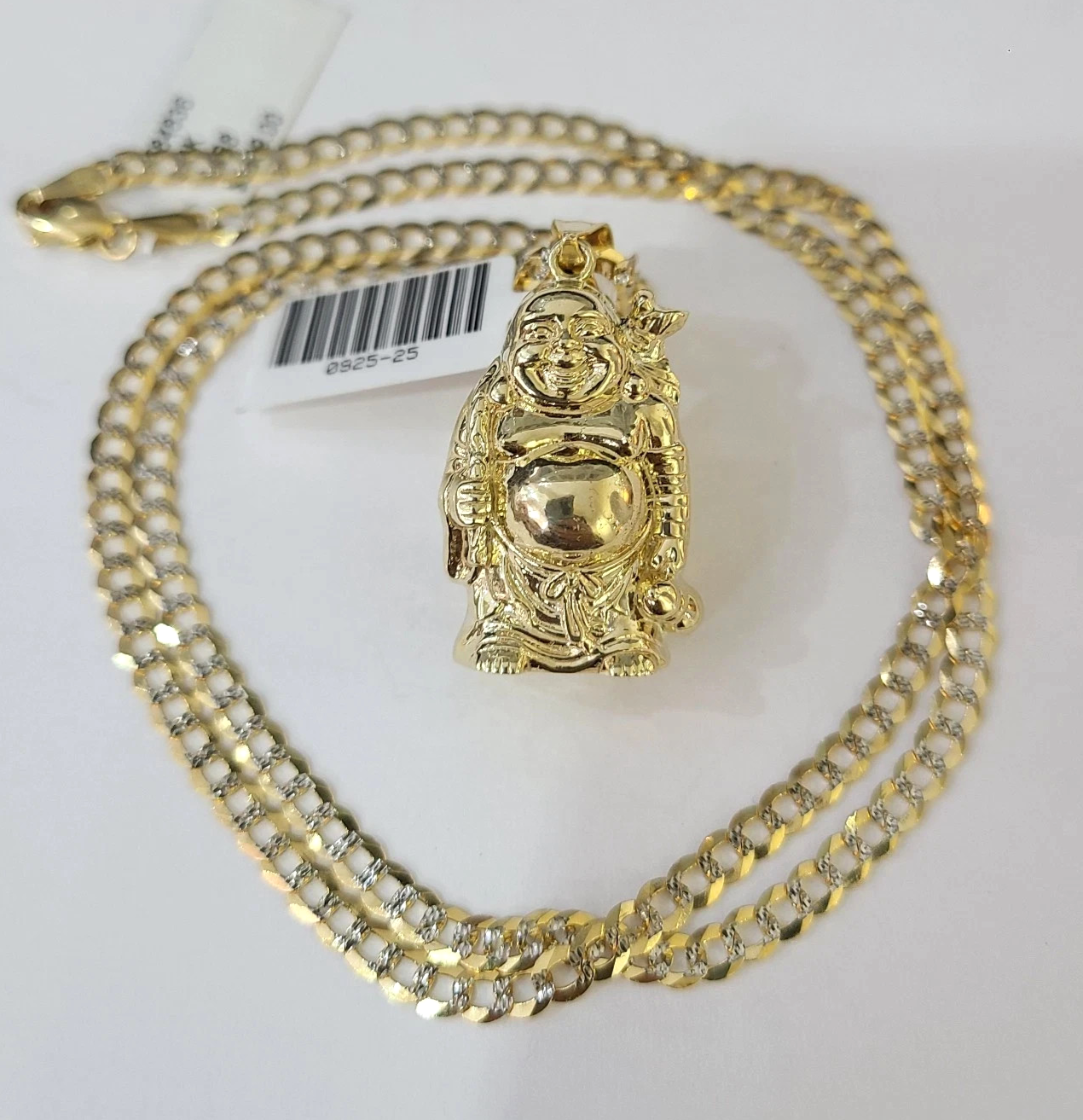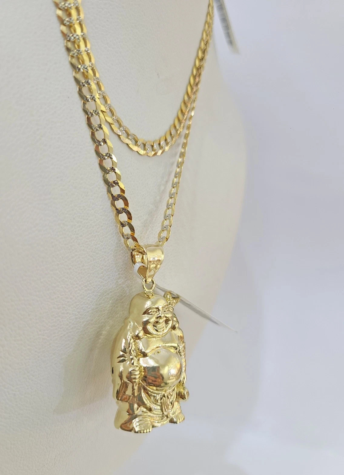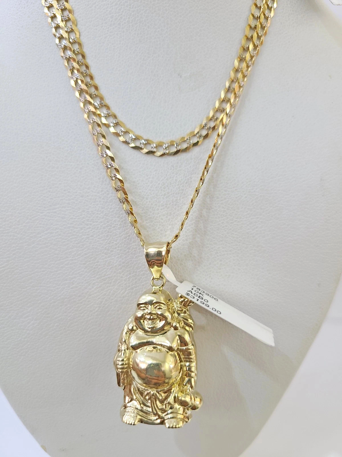 10k Gold Solid Cuban Curb Chain Laughing Buddha Pendant Charm 3mm Necklace - 22 inch with charm