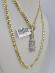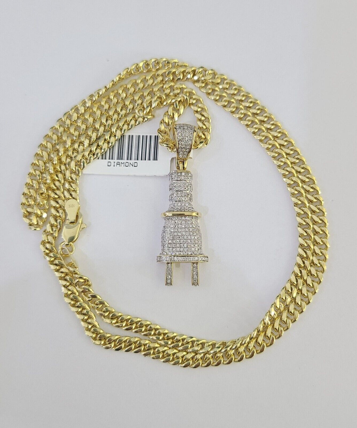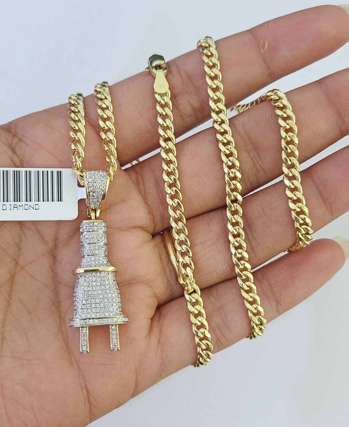 10k Miami Cuban Chain Plug Socket Charm Diamond Set 4.5mm 20"-28" Necklace Gold - With 20 Inch Chain & Charm