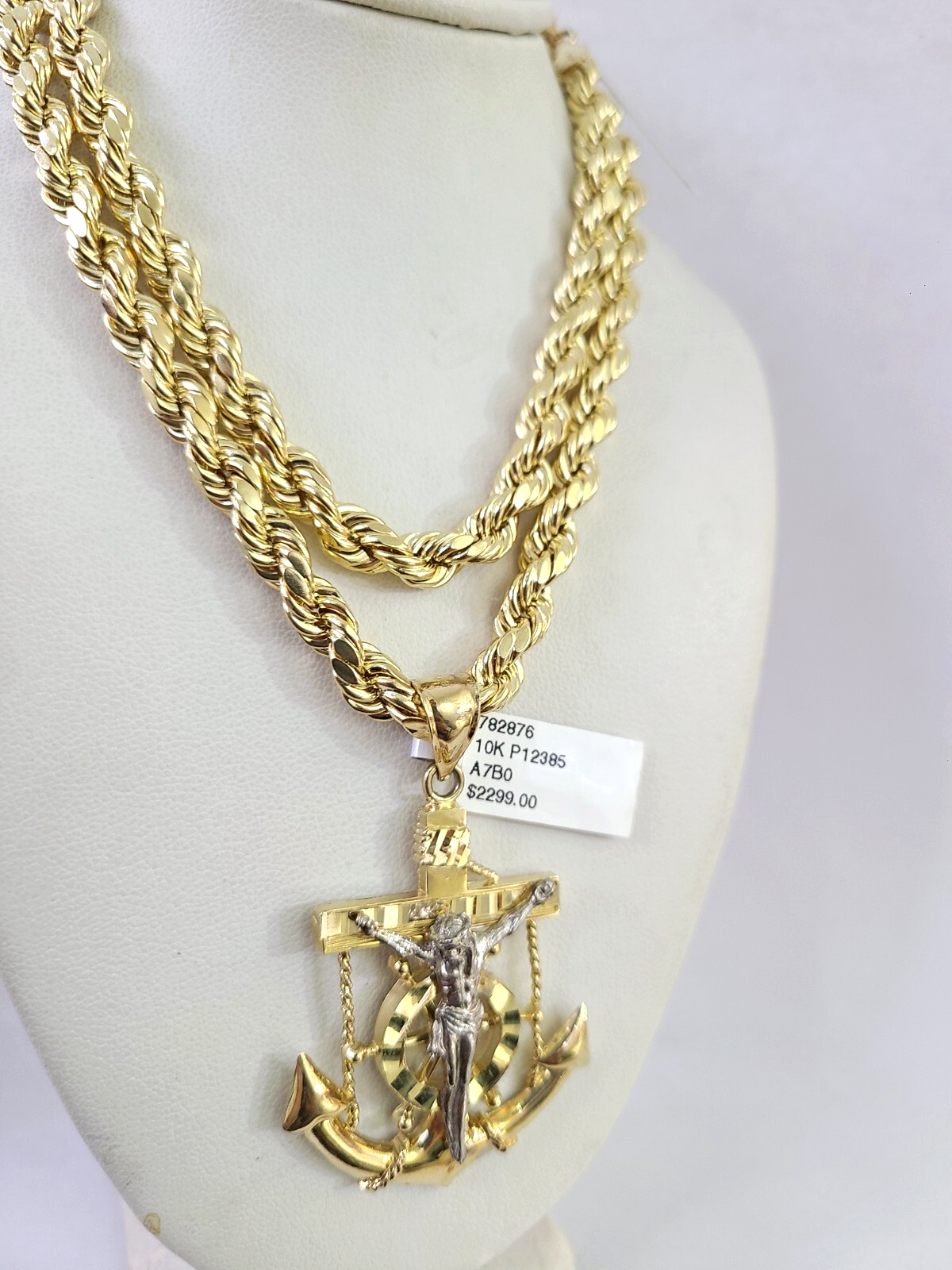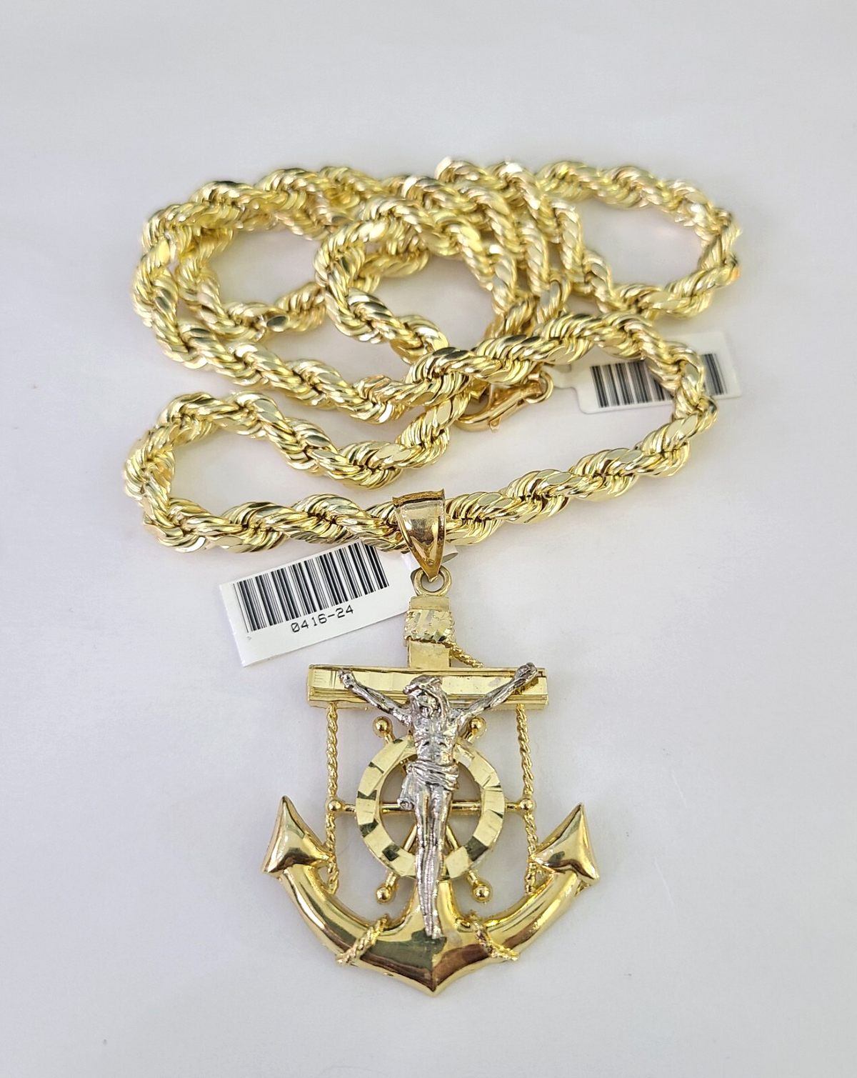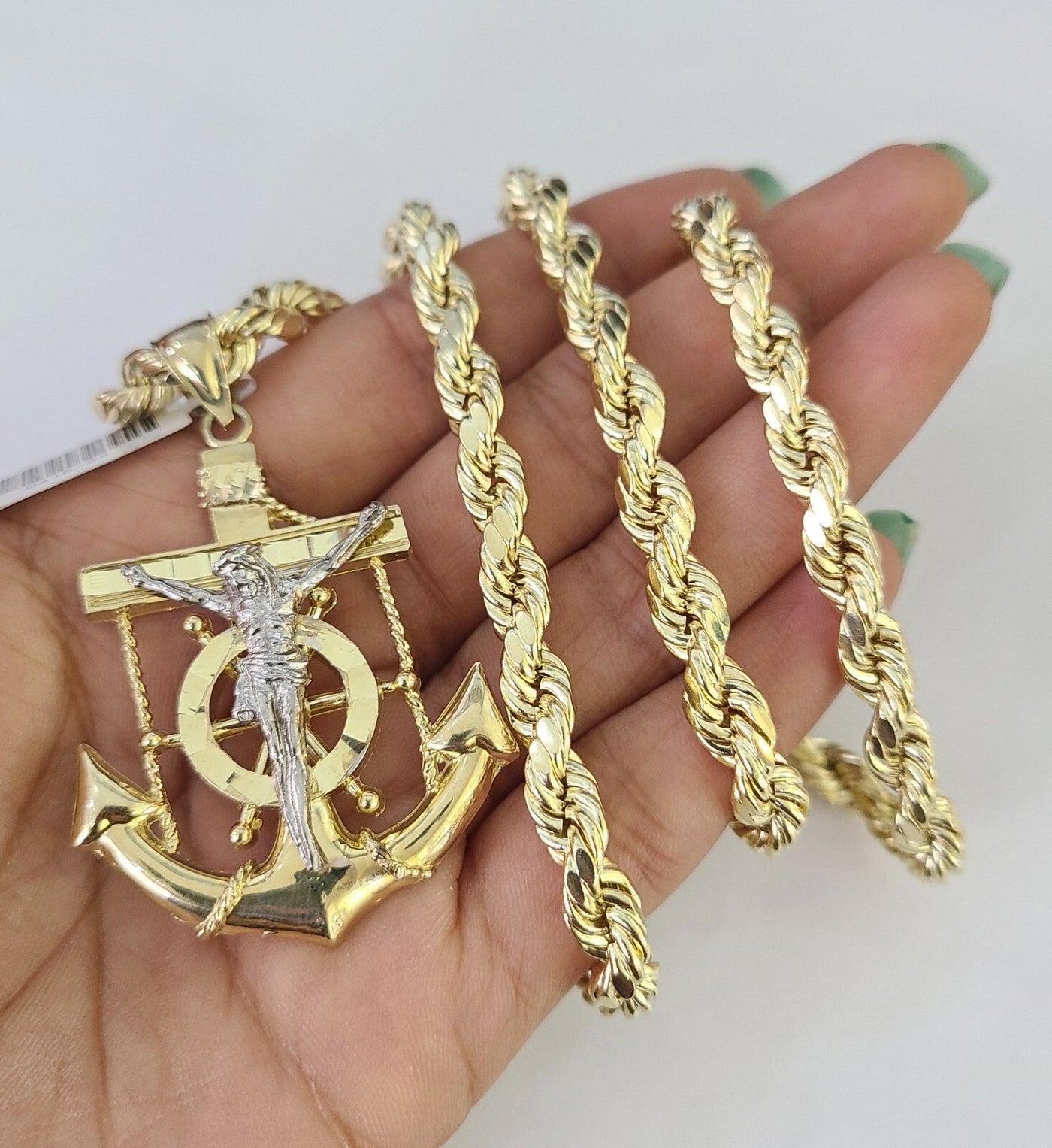 10k Rope Chain Jesus Anchor Charm Pendant Gold 18"-30'' Inch 7mm Necklace - 22 inch with charm