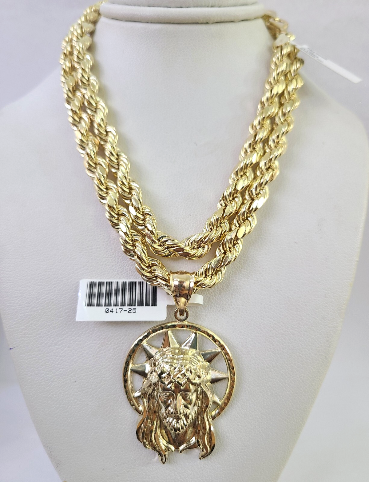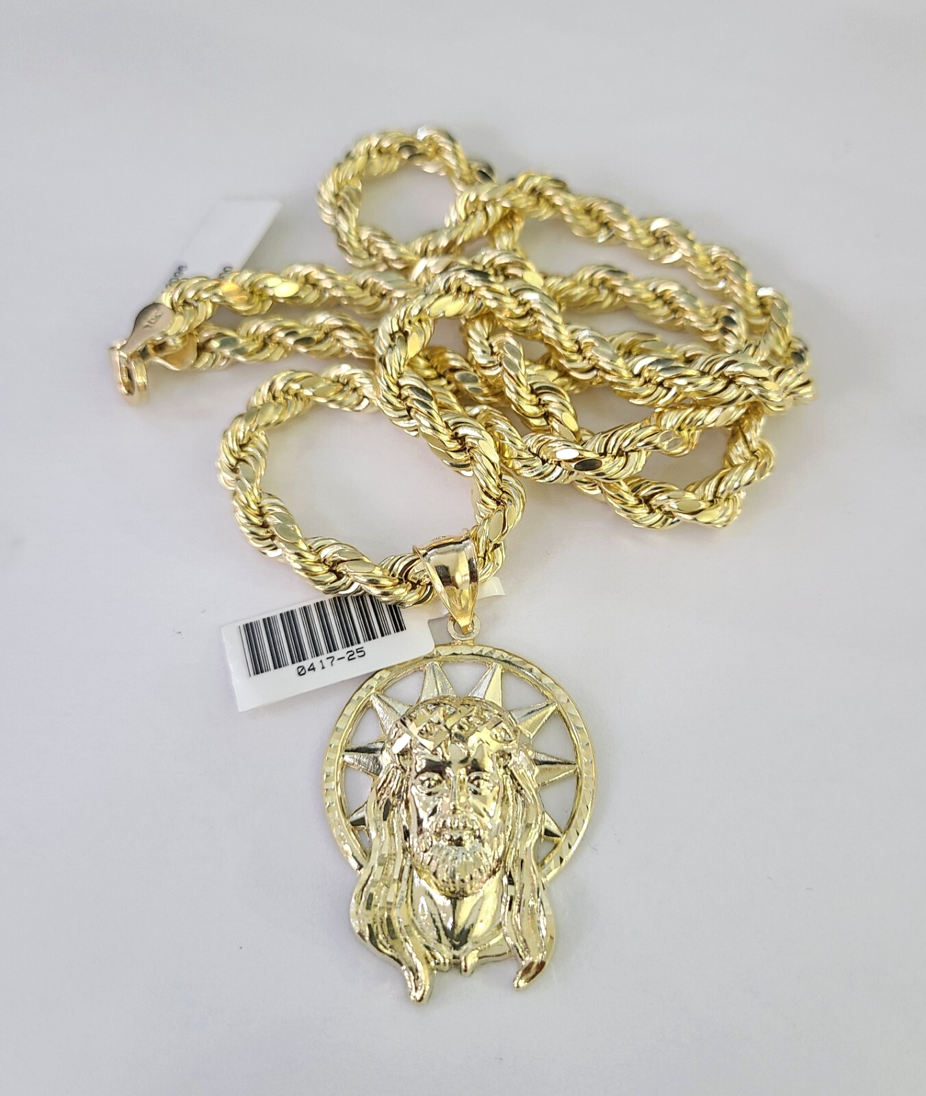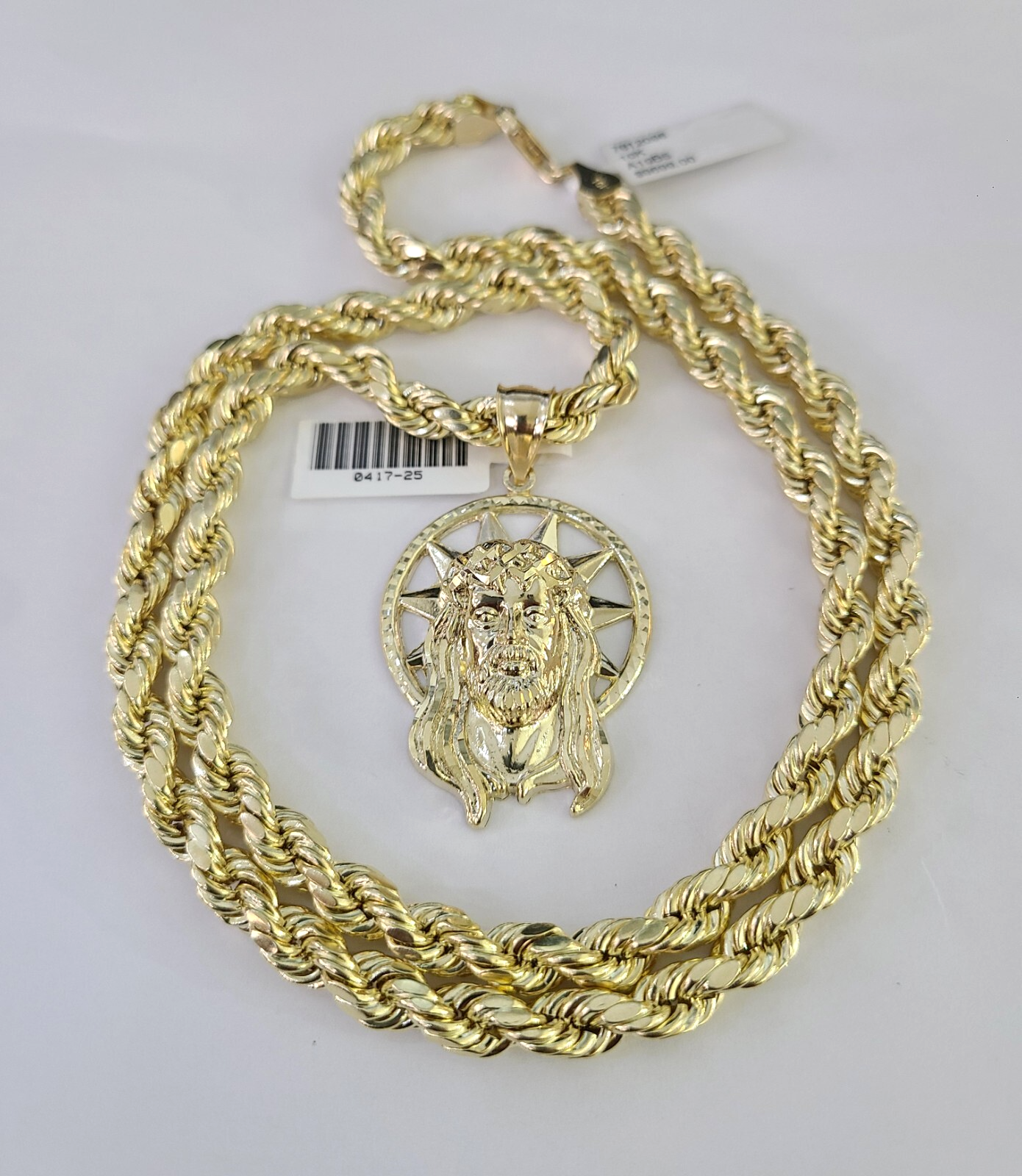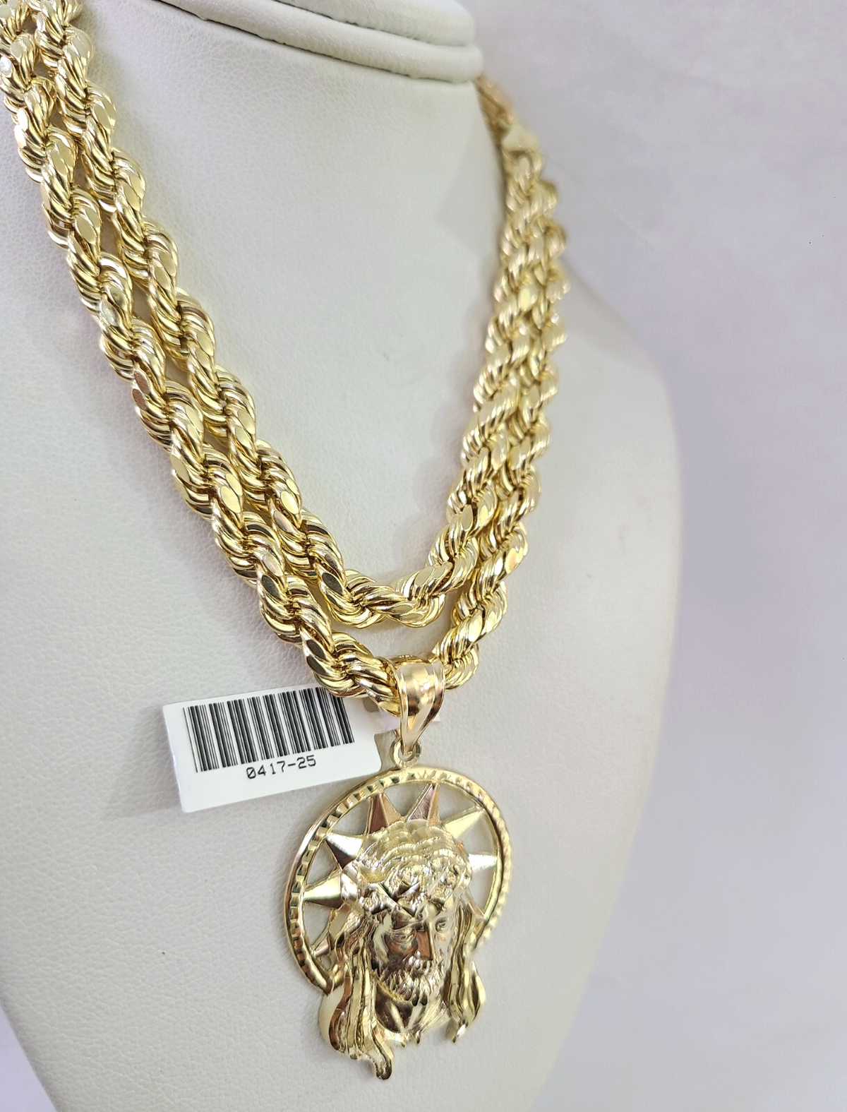 10k Rope Chain Jesus Head Charm Pendant Gold 18"-30'' Inch 7mm Necklace - 22 inch with charm