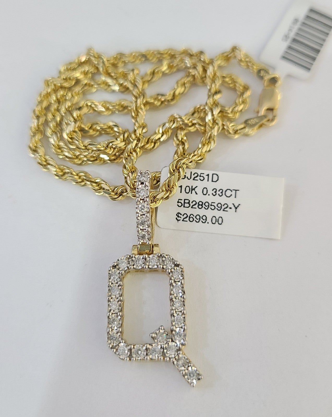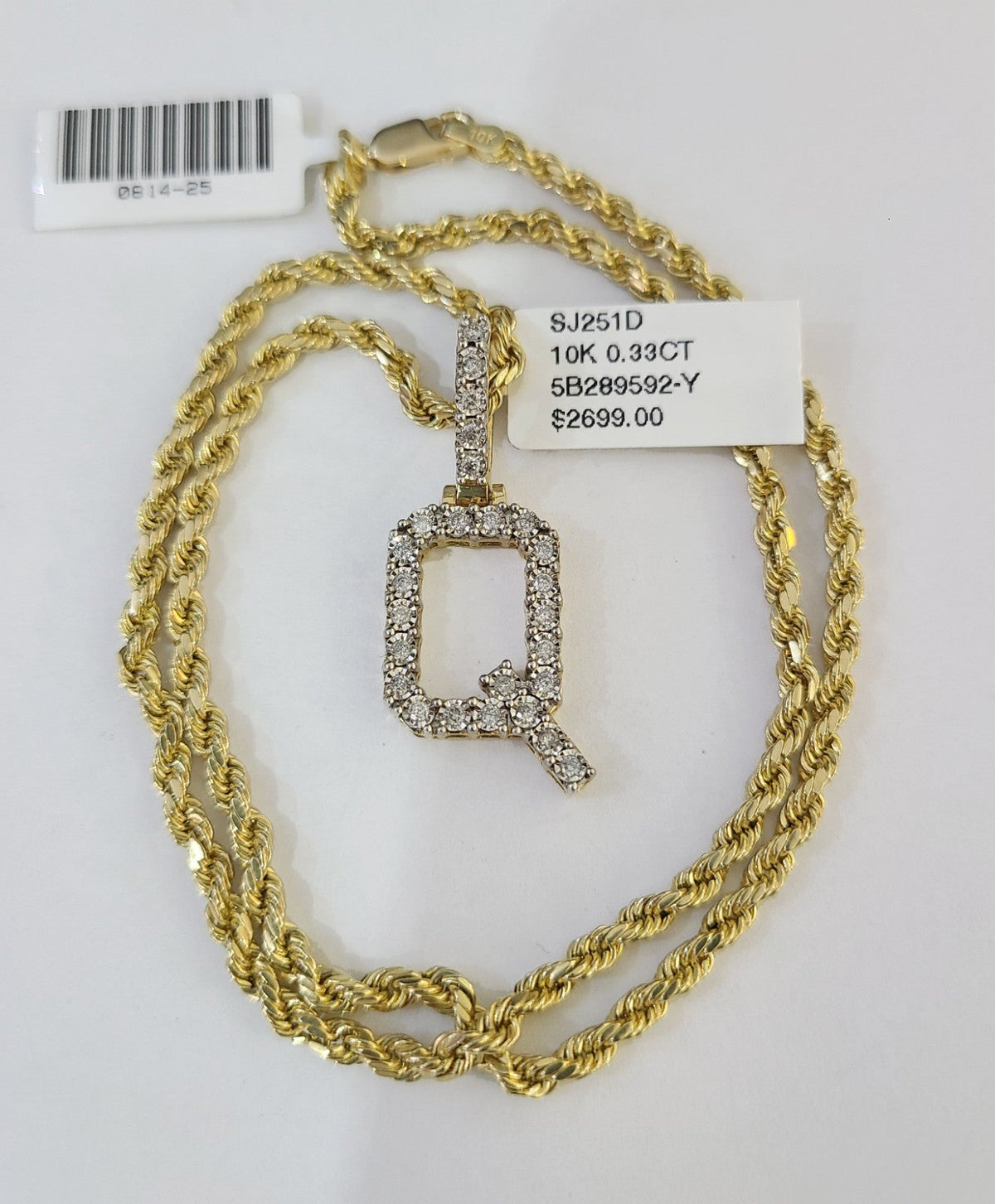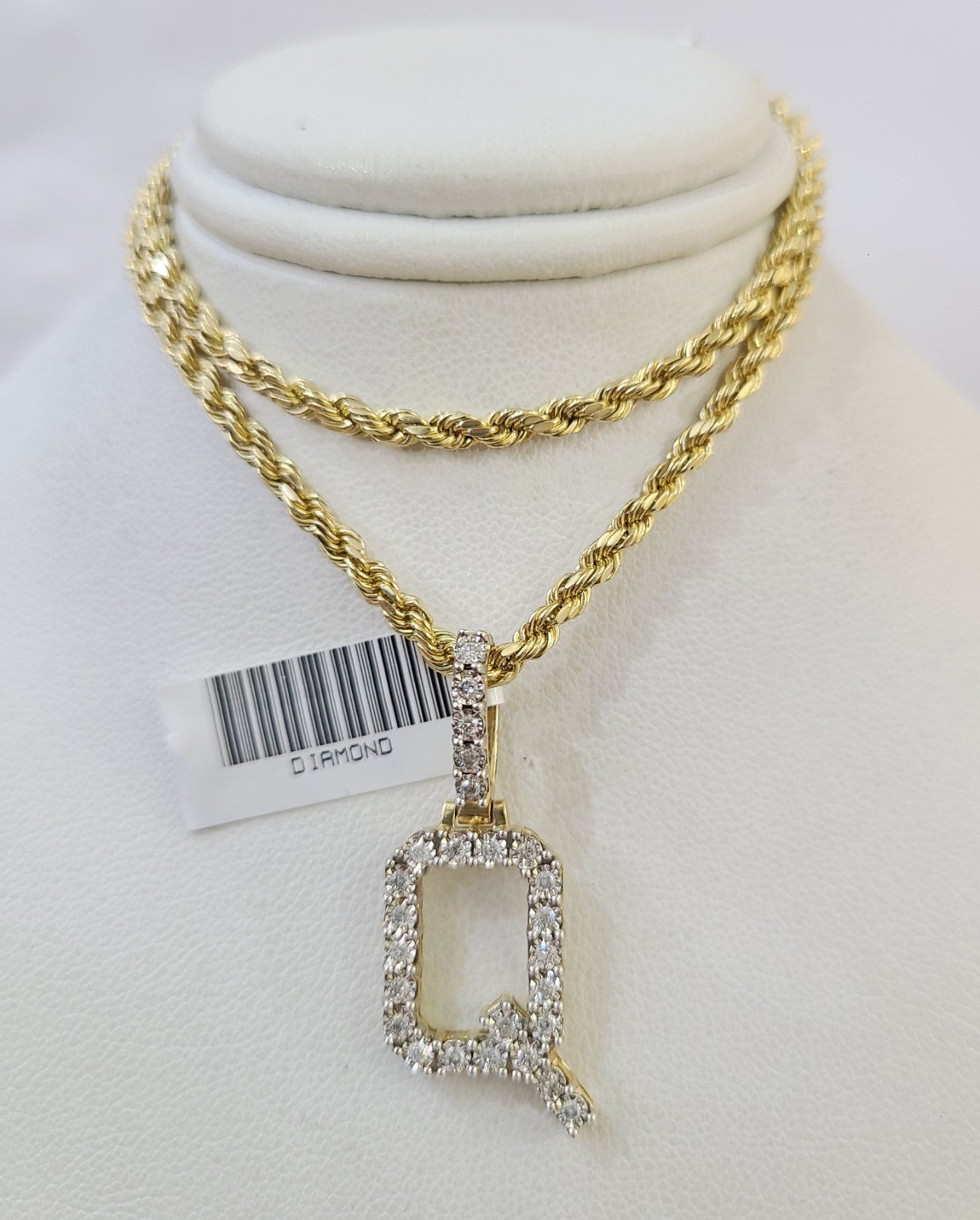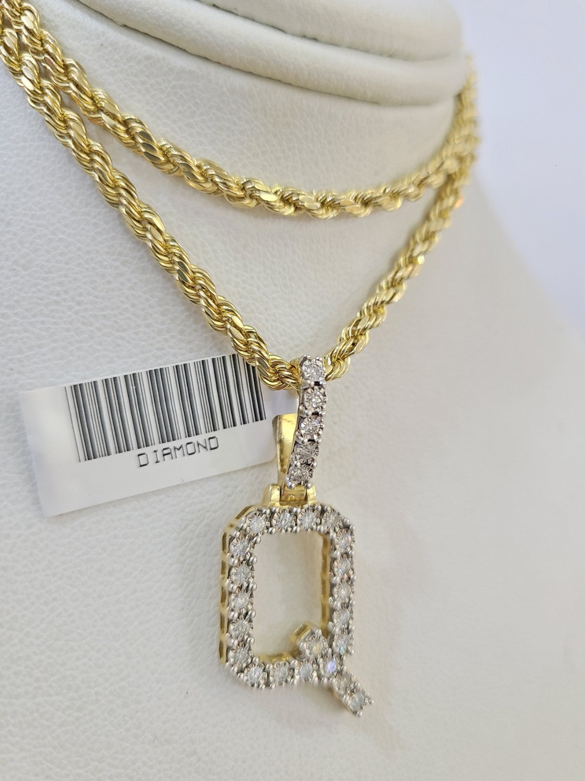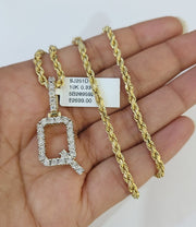 10k Rope Chain Q Diamond Initial Charm Necklace Pendant Set 2mm 18"-24" Gold - 22 inch with charm