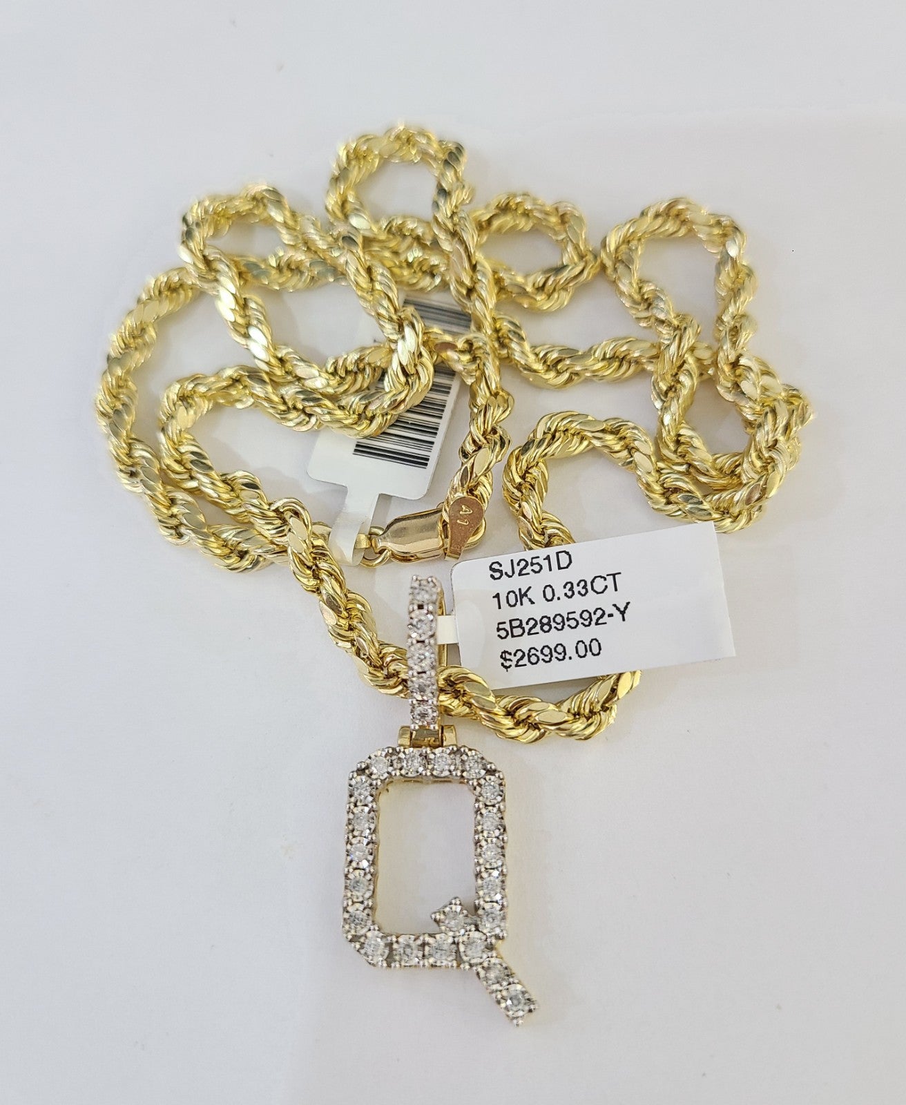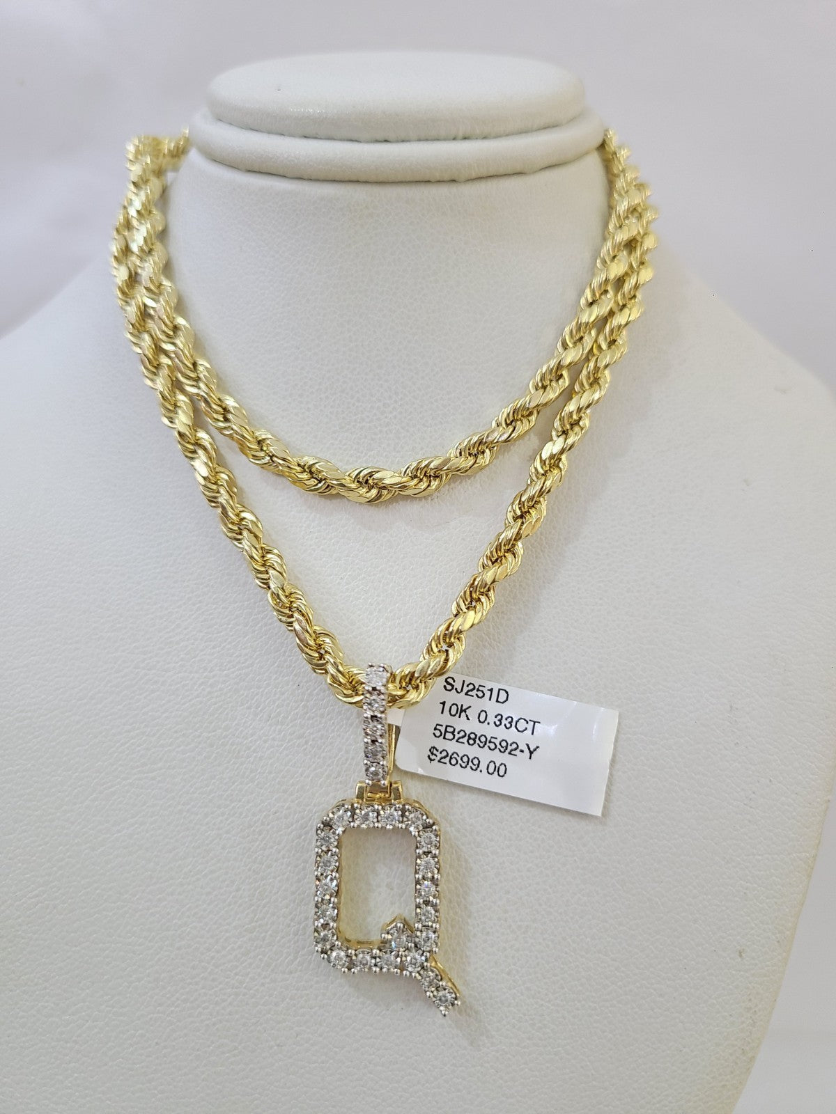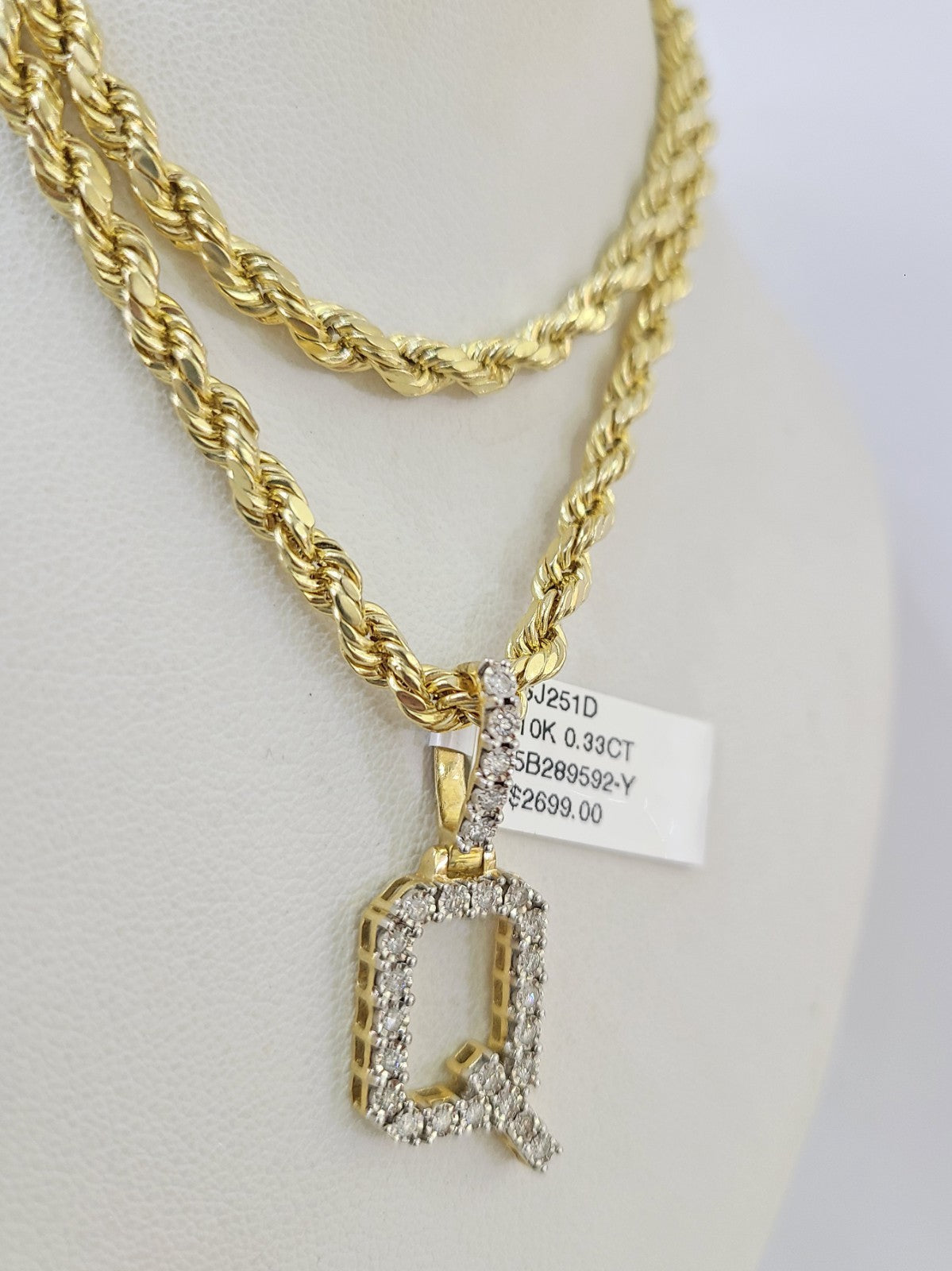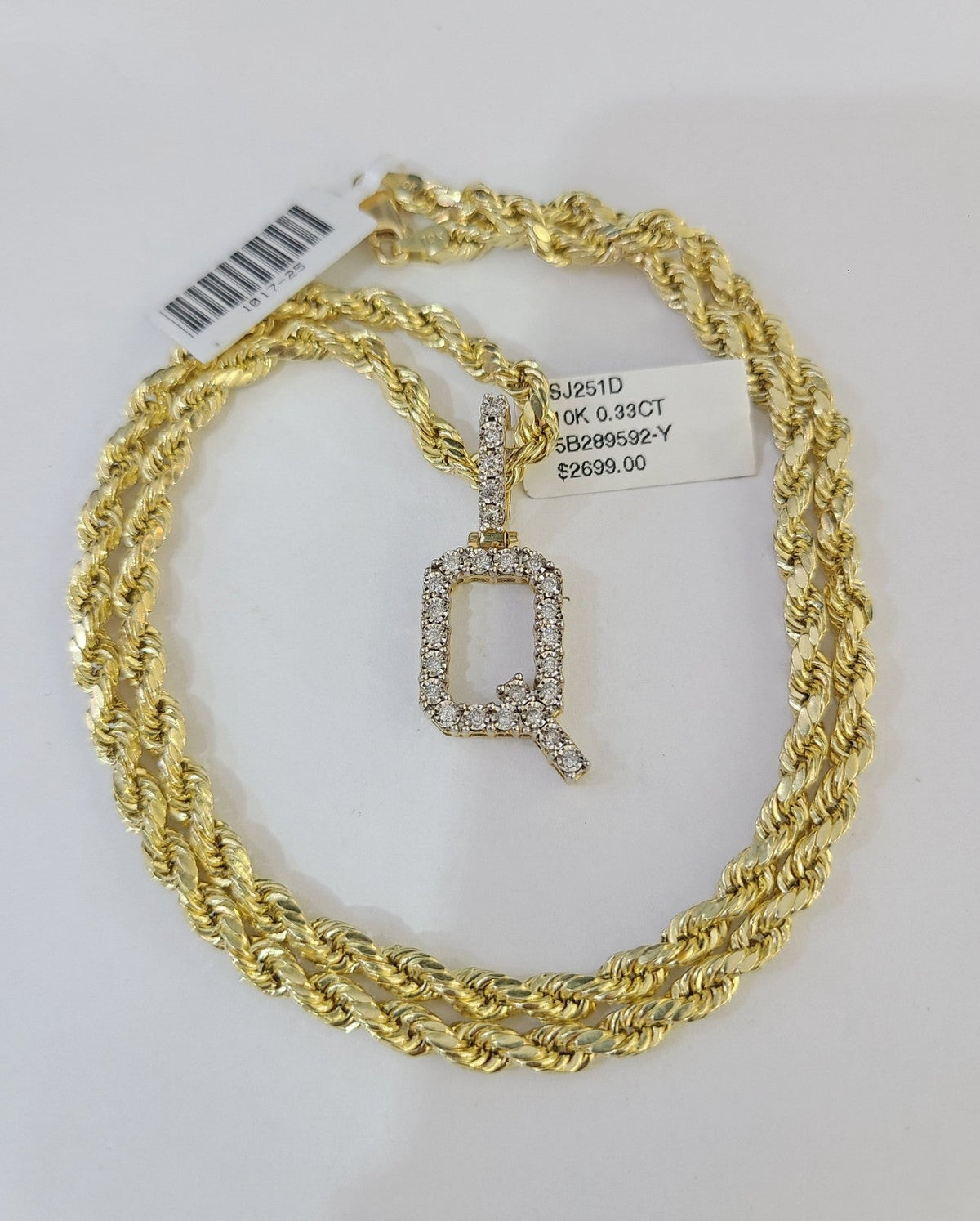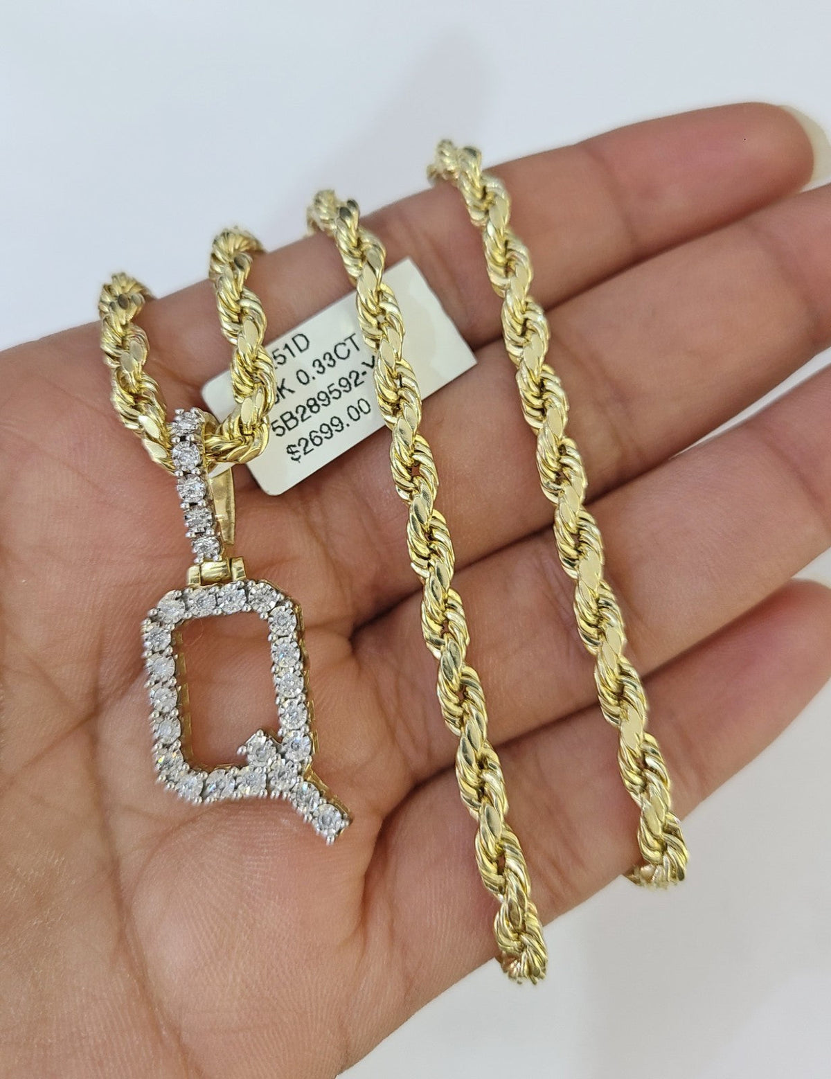 10k Rope Chain Q Diamond Initial Charm Necklace Pendant Set 4mm 20"-30" Gold - 22 inch with charm