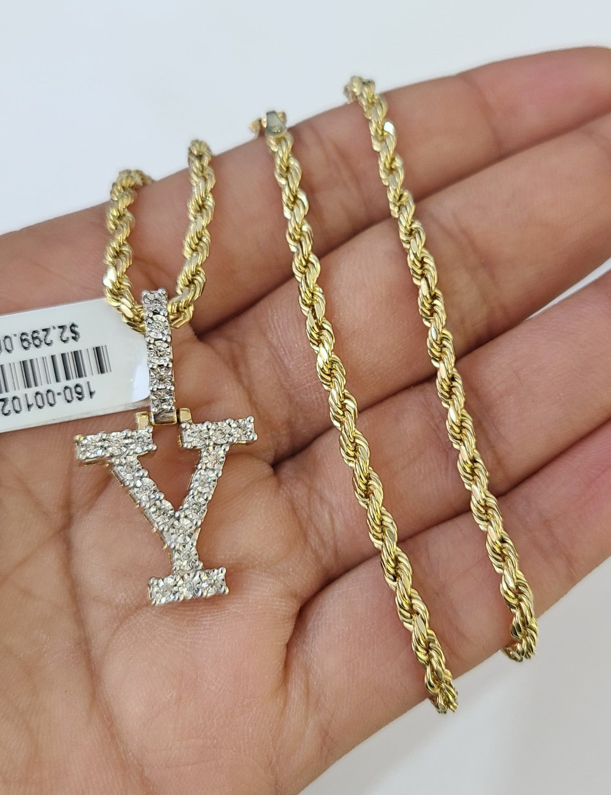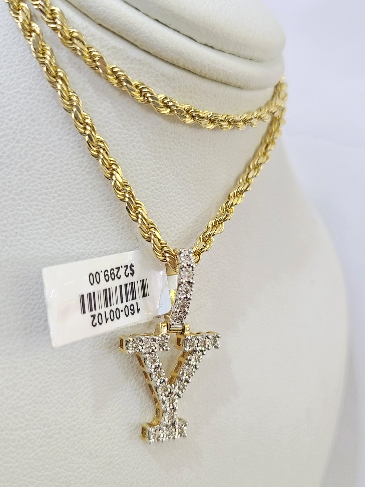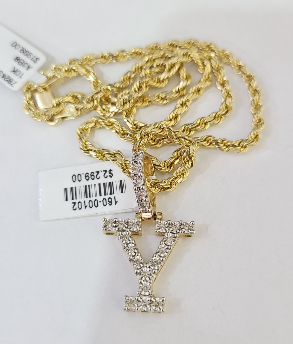 10k Rope Chain Y Diamond Initial Charm Necklace Pendant Set 2mm 18"-24" Gold - 22 inch with charm