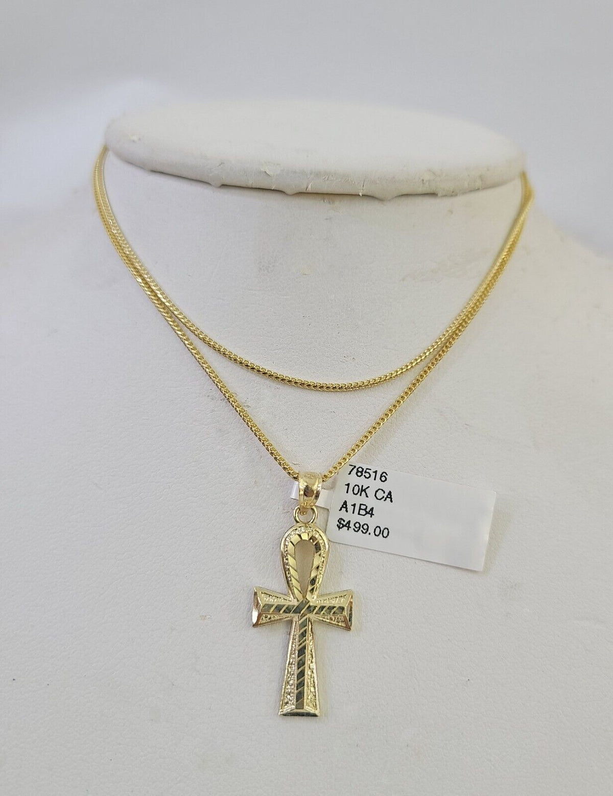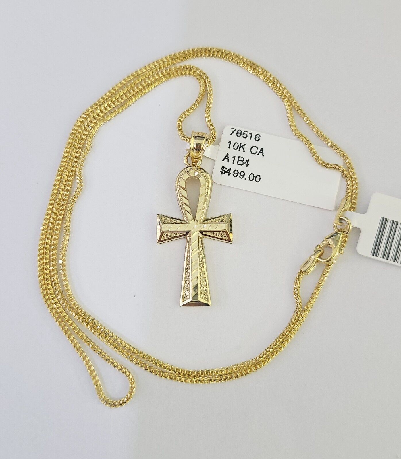 10K Solid Franco Chain Ankh Cross Pendant Charm Necklace 18"-24" 1.5mm Gold - 18" chain with charm