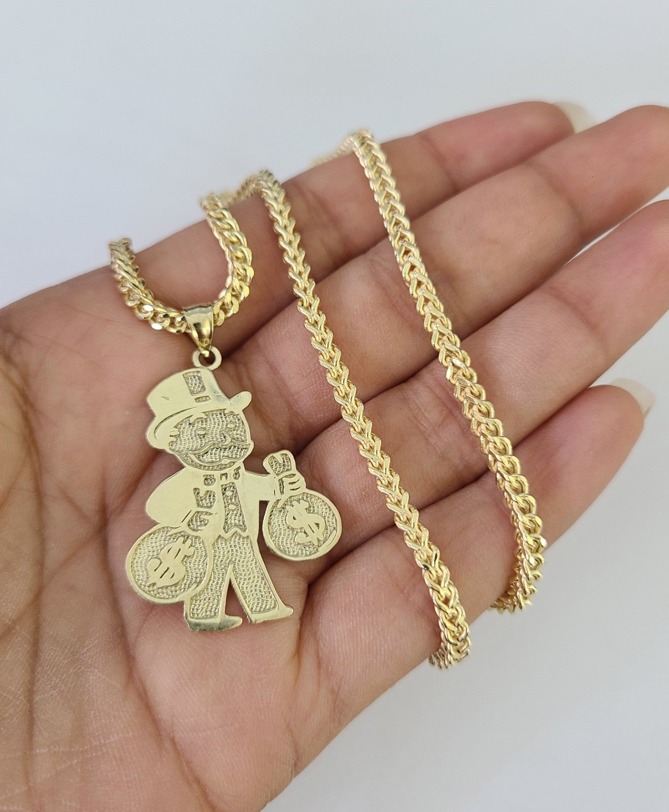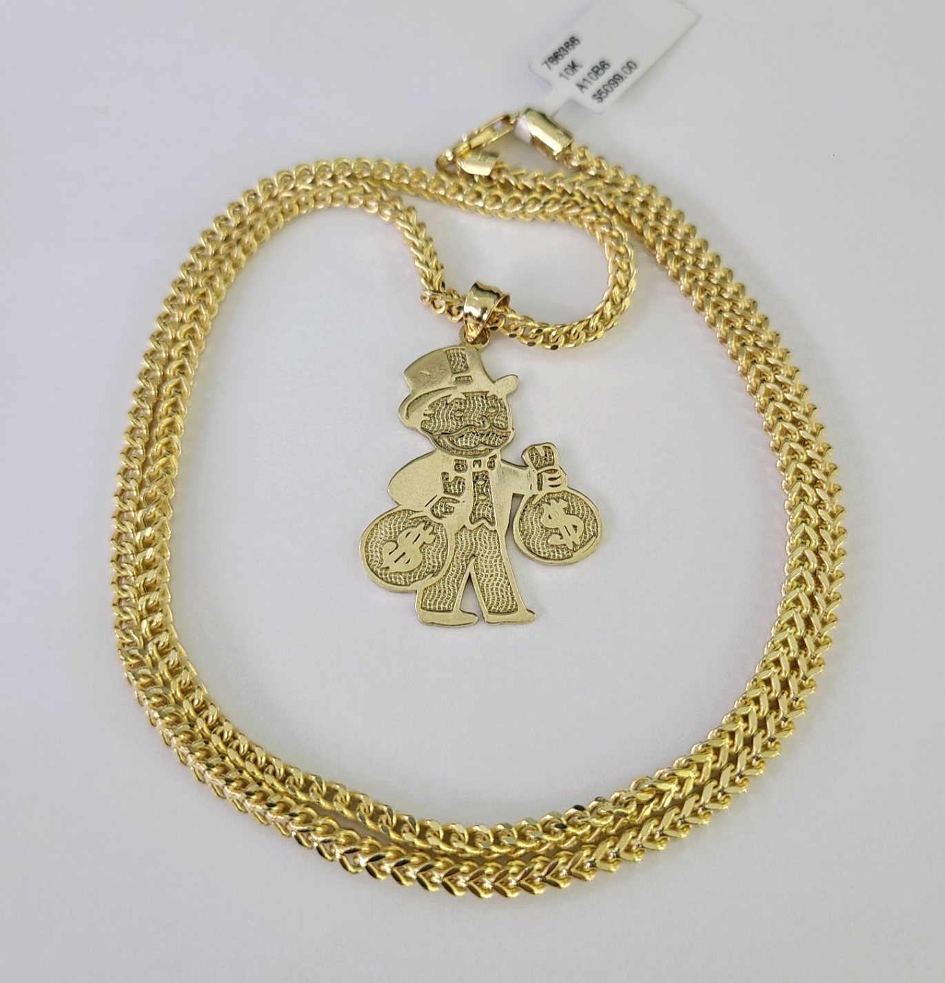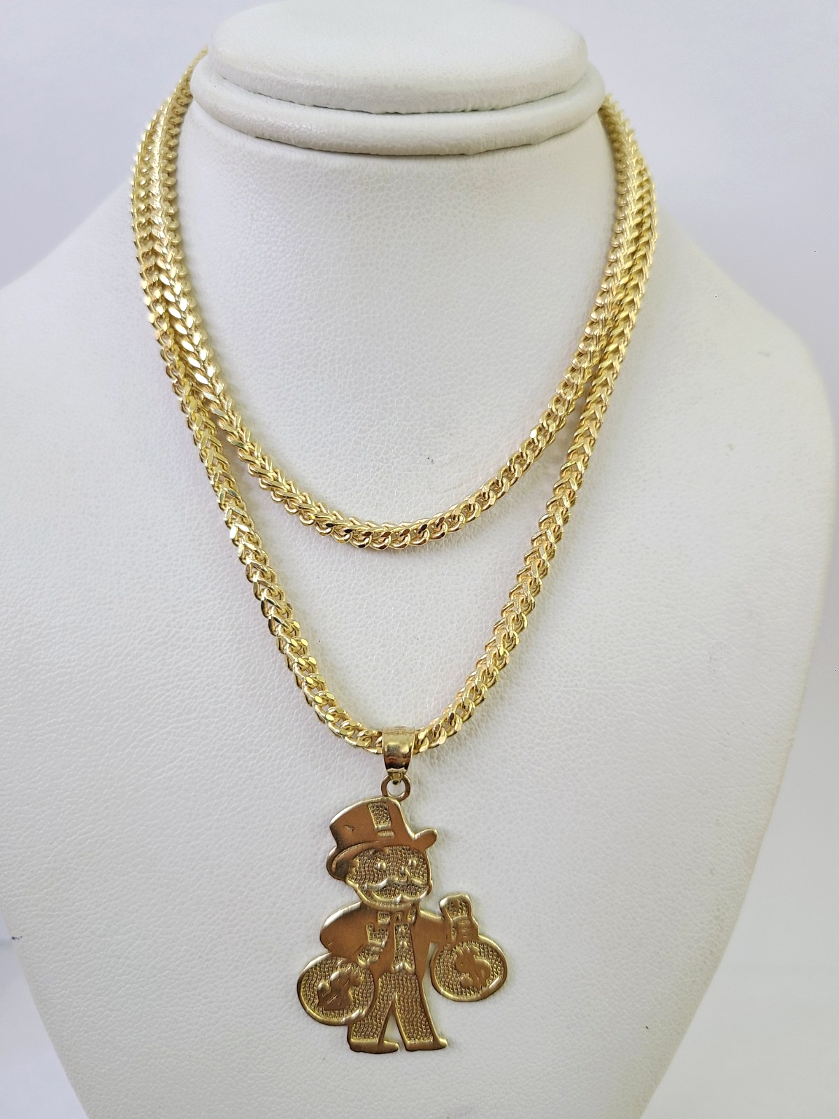 Genuine 10k Yellow Gold Franco Necklace 3mm Chain with Grandpa Money Bag Charm. The Various length of the Chain are 18"-28" inches. The pendants are unique in design and considered durable too. If you are not happy with the way it looks or feels, we do offer 30 - Days FREE Return shipping. Contact us for more information.