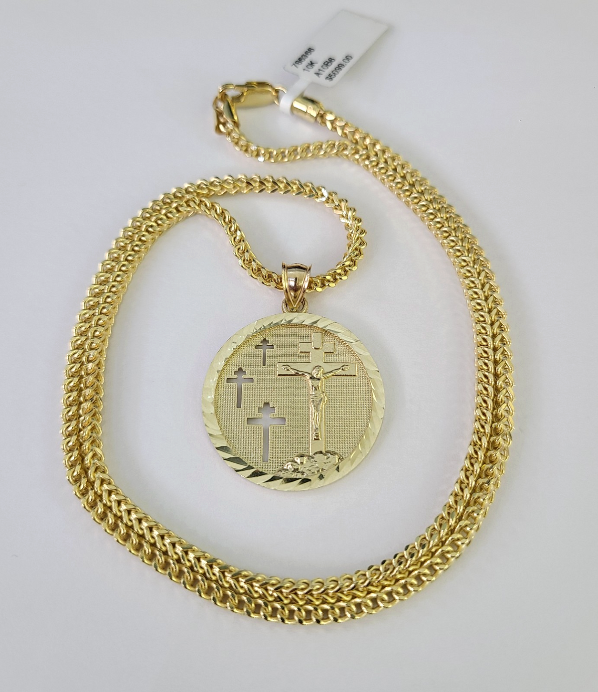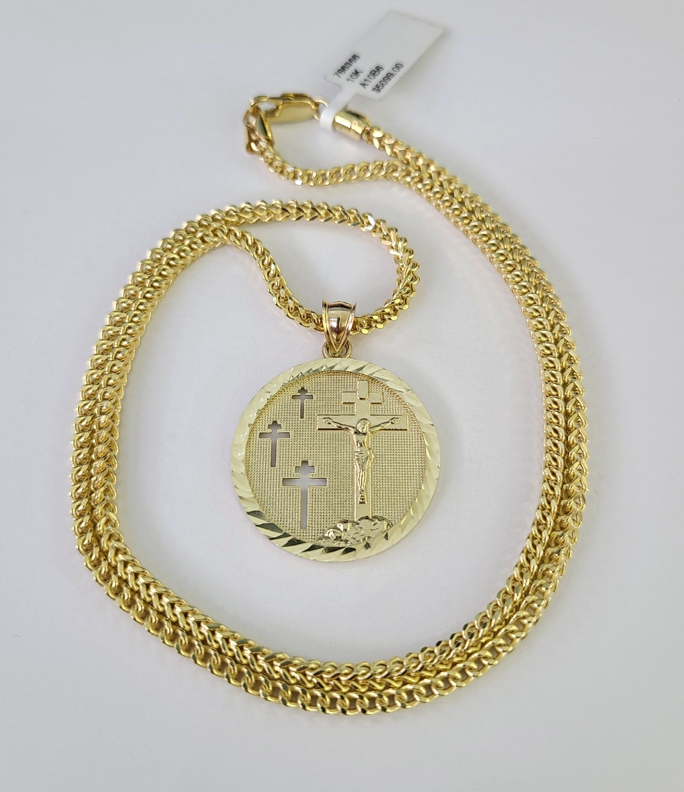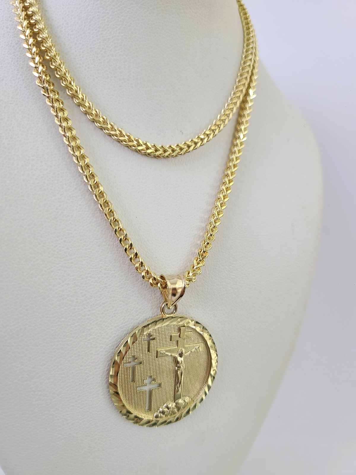 10kt Yellow Gold Franco Chain Necklace Jesus Medallion Charm Pendant 3mm 18-28 inches