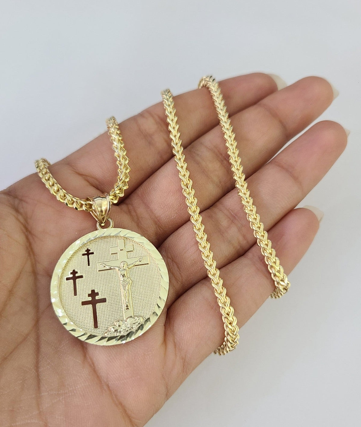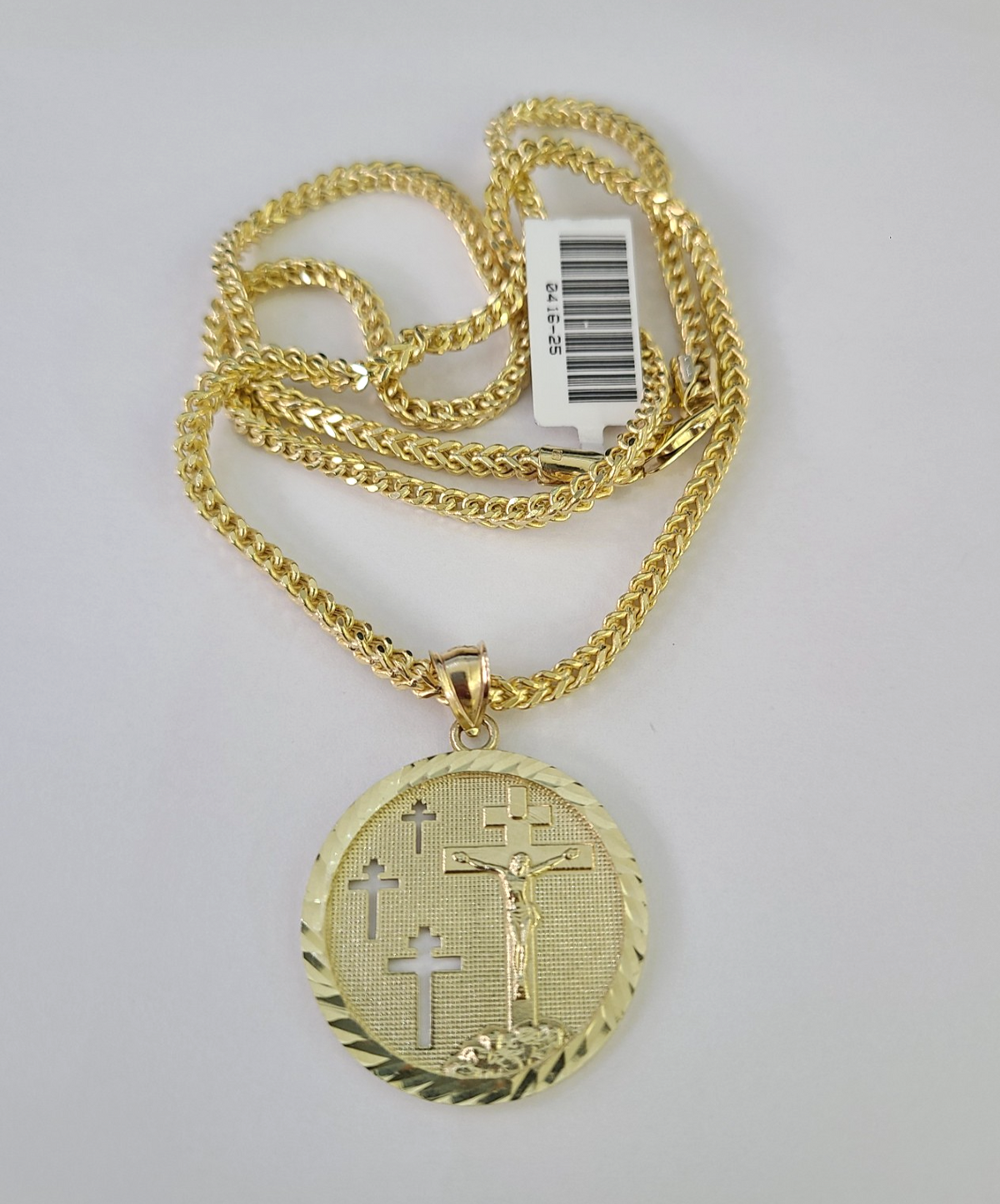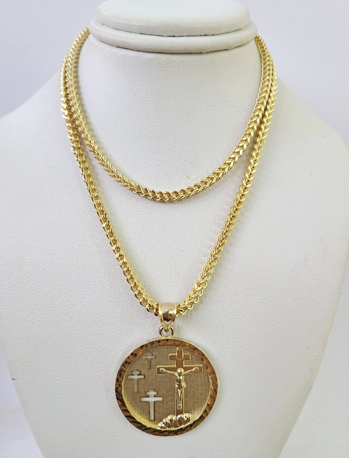Genuine 10k Yellow Gold Franco Necklace 3mm Chain with Jesus Medallion Charm. The Various length of the Chain are 18"-28" inches. The pendants are unique in design and considered durable too. If you are not happy with the way it looks or feels, we do offer 30 - Days FREE Return shipping. Contact us for more information.
