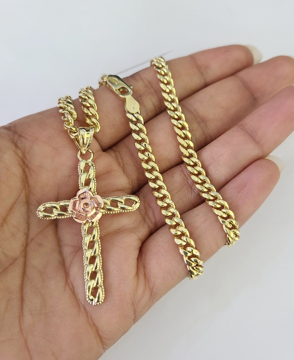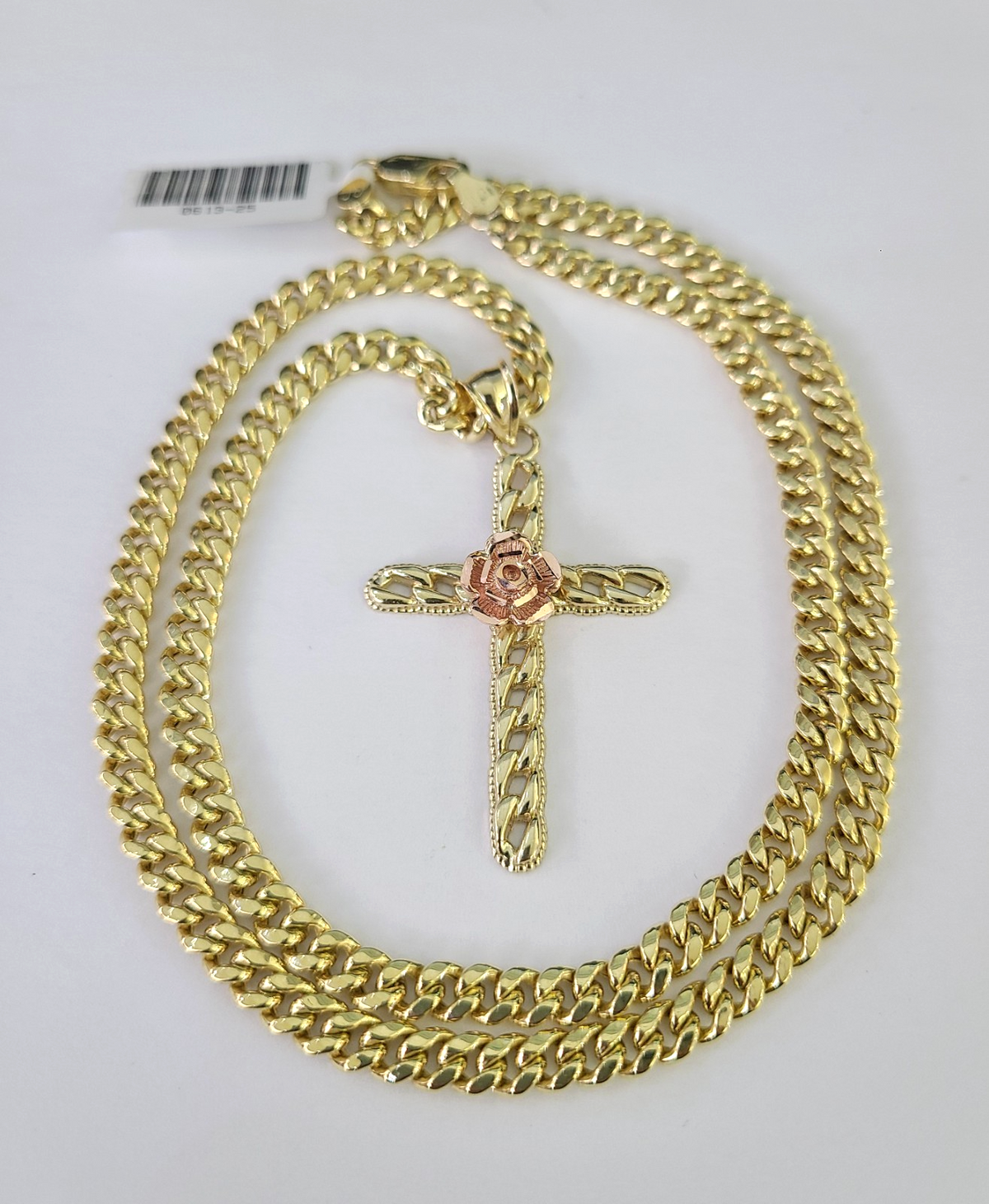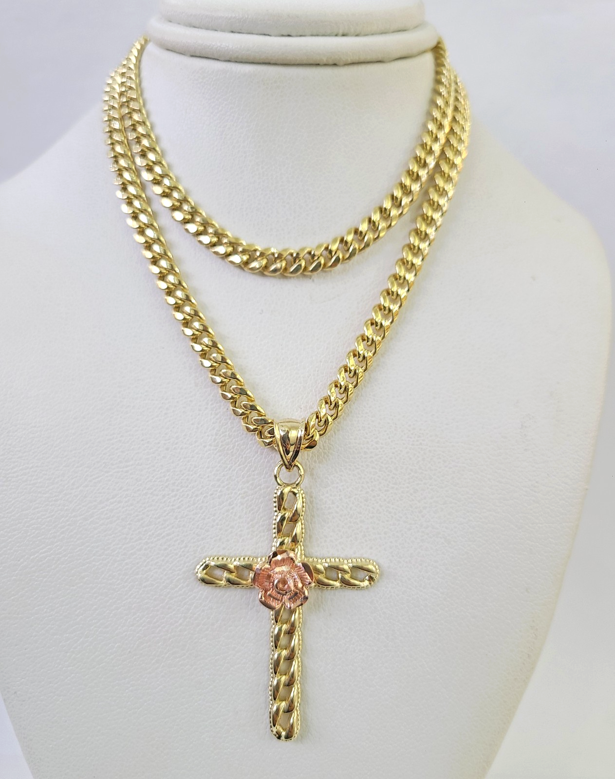 10kt Gold Miami Cuban Chain Jesus Rose Cross Charm Pendant 5mm 18-28 Inch Necklace SALE
