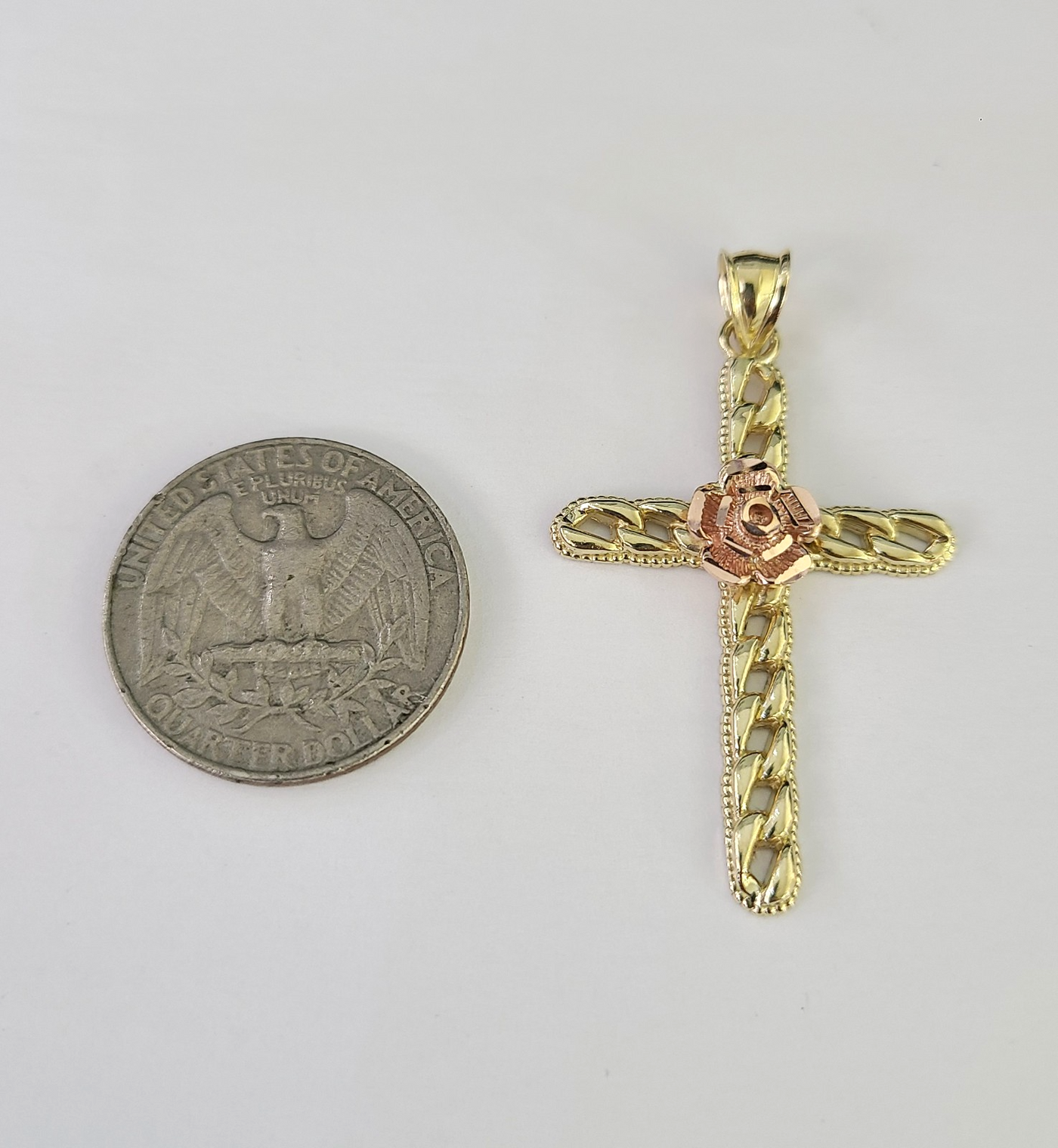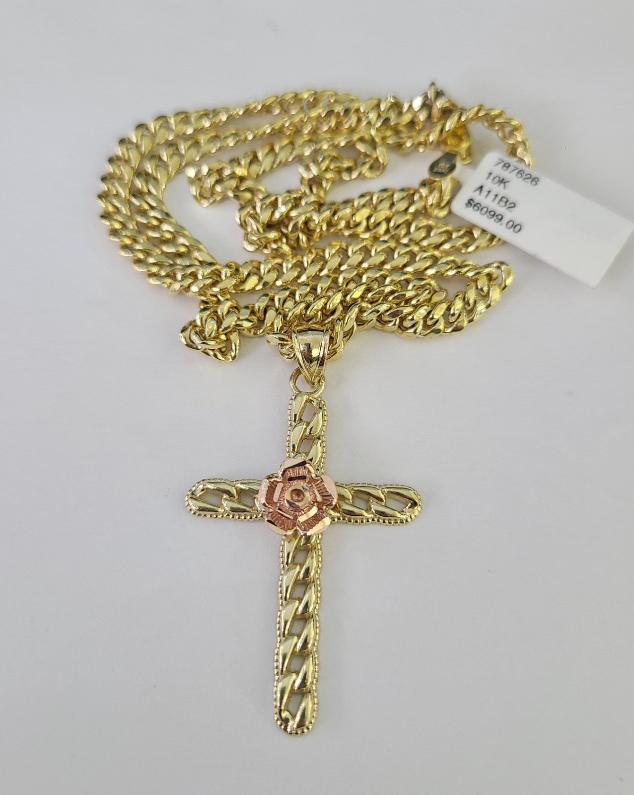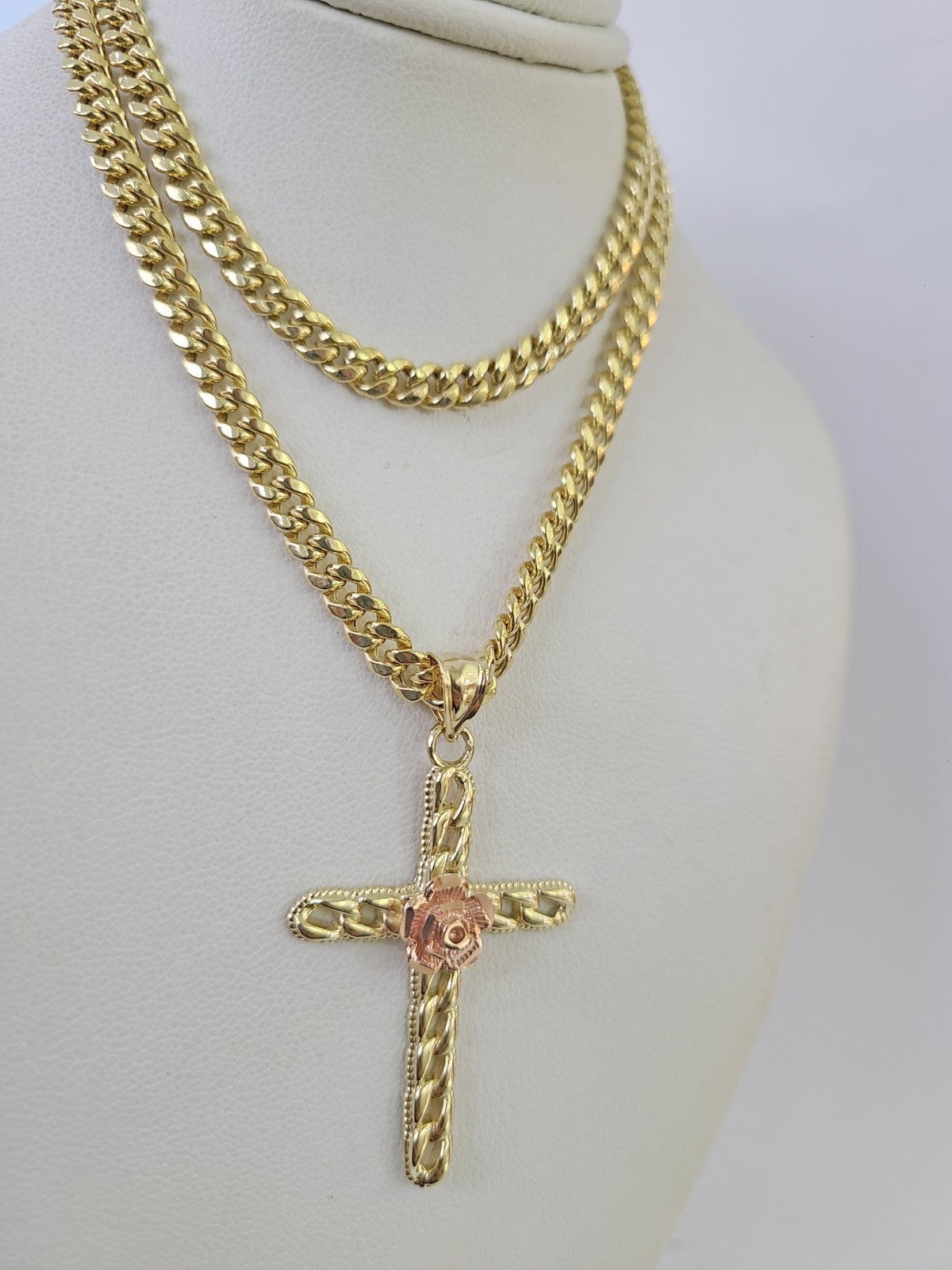 10kt Gold Miami Cuban Chain Jesus Rose Cross Charm Pendant 5mm 18-28 Inch Necklace SALE