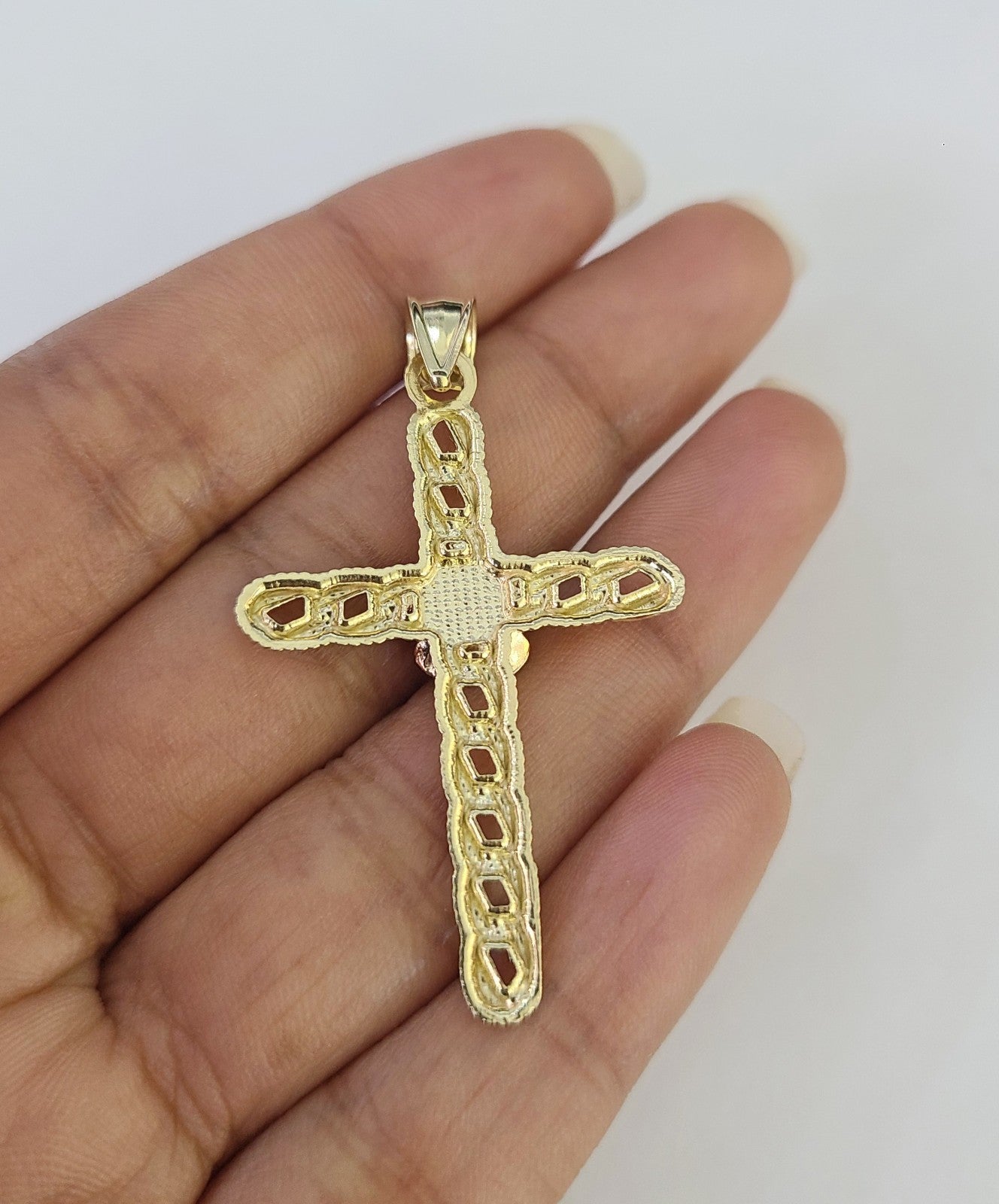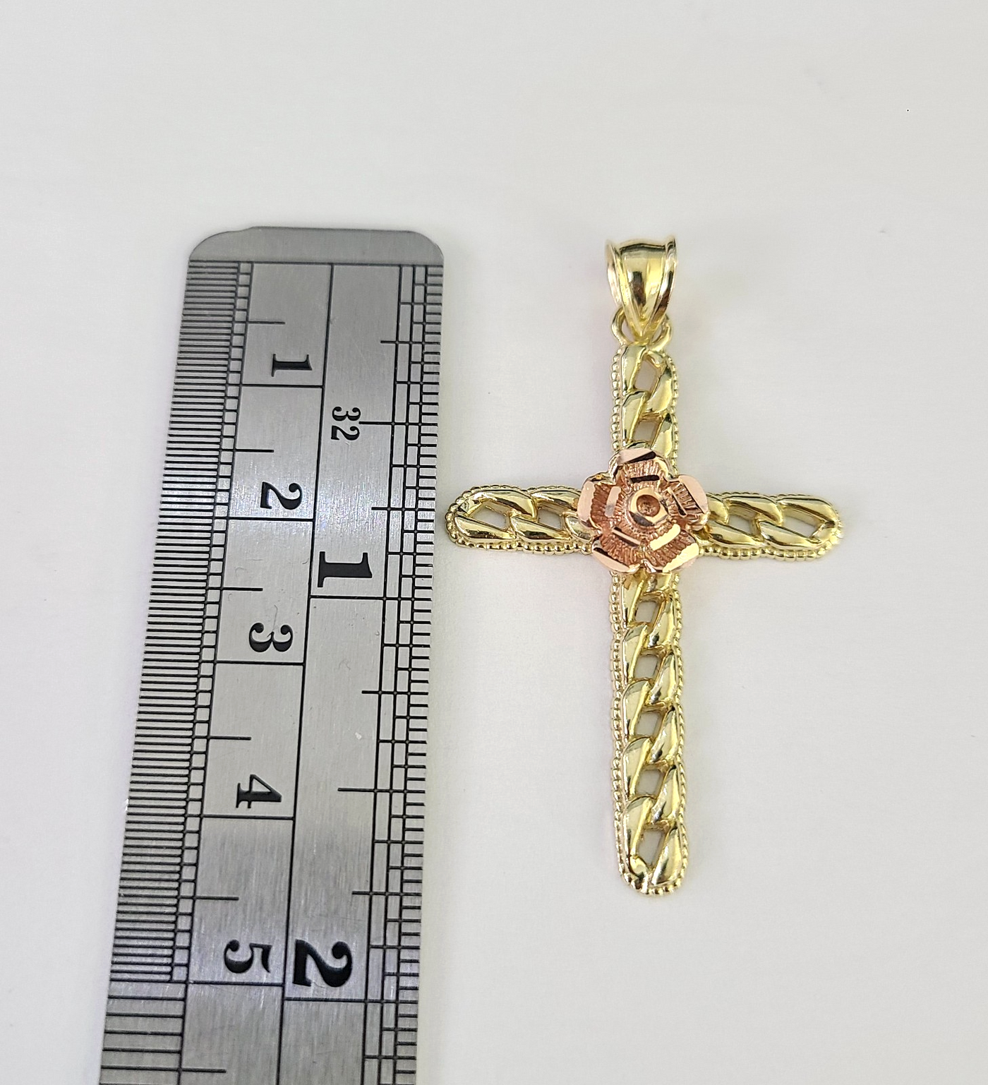 Genuine 10k Yellow Gold Miami Cuban Necklace 5mm Chain with Jesus Rose Cross Charm. The Various length of the Chain are 18"-28" with Jesus Rose Cross Charm. The pendants are unique in design and considered durable too. If you are not happy with the way it looks or feels, we do offer 30 - Days FREE Return shipping. Contact us for more information.