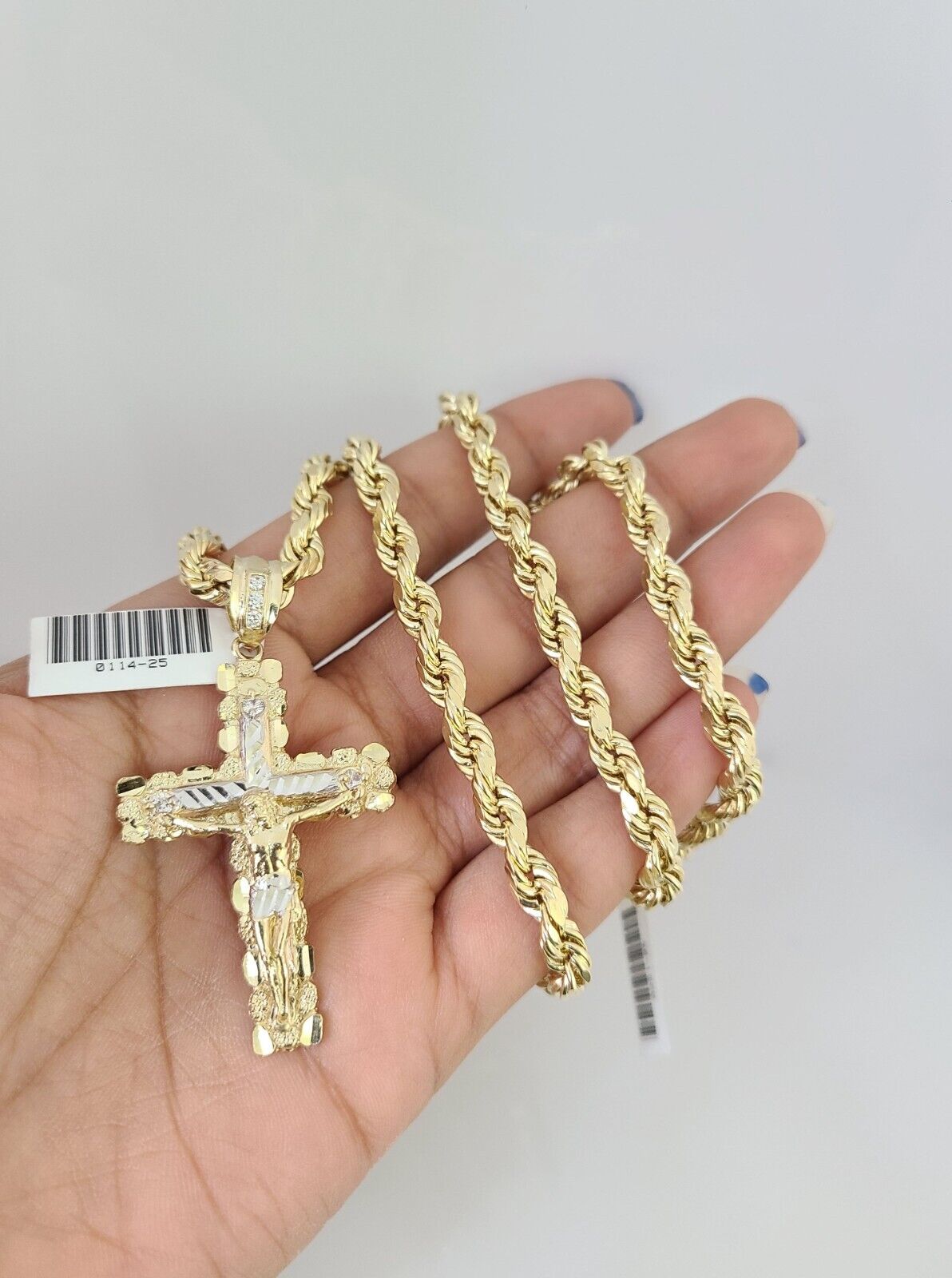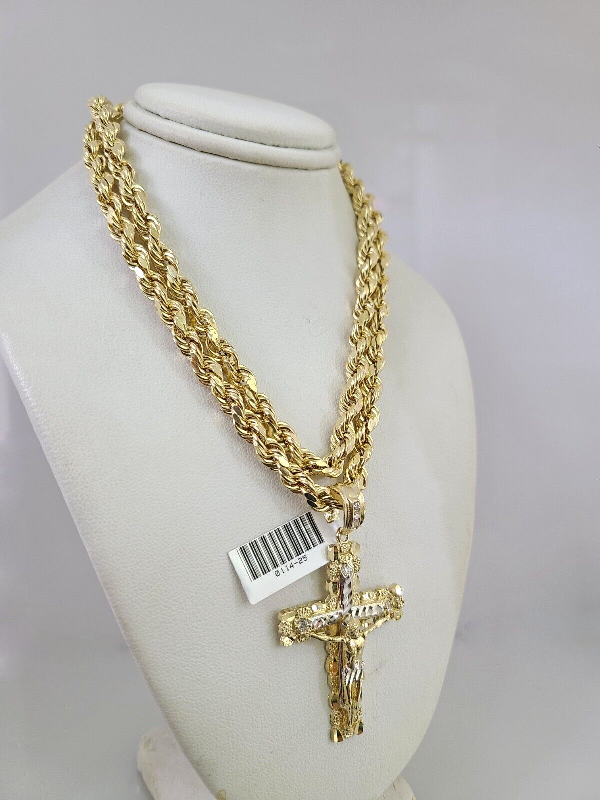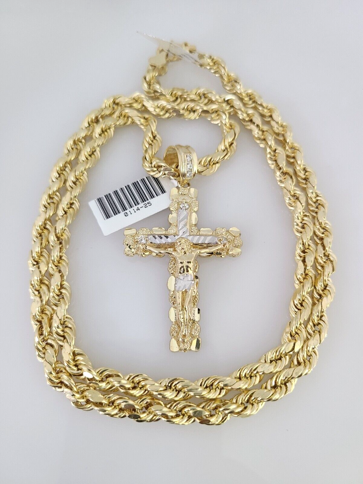 10kt Gold Rope Chain Nugget Cross Charm Set 18"-30'' Inch 6mm Necklace Pendant - 22 inch with charm