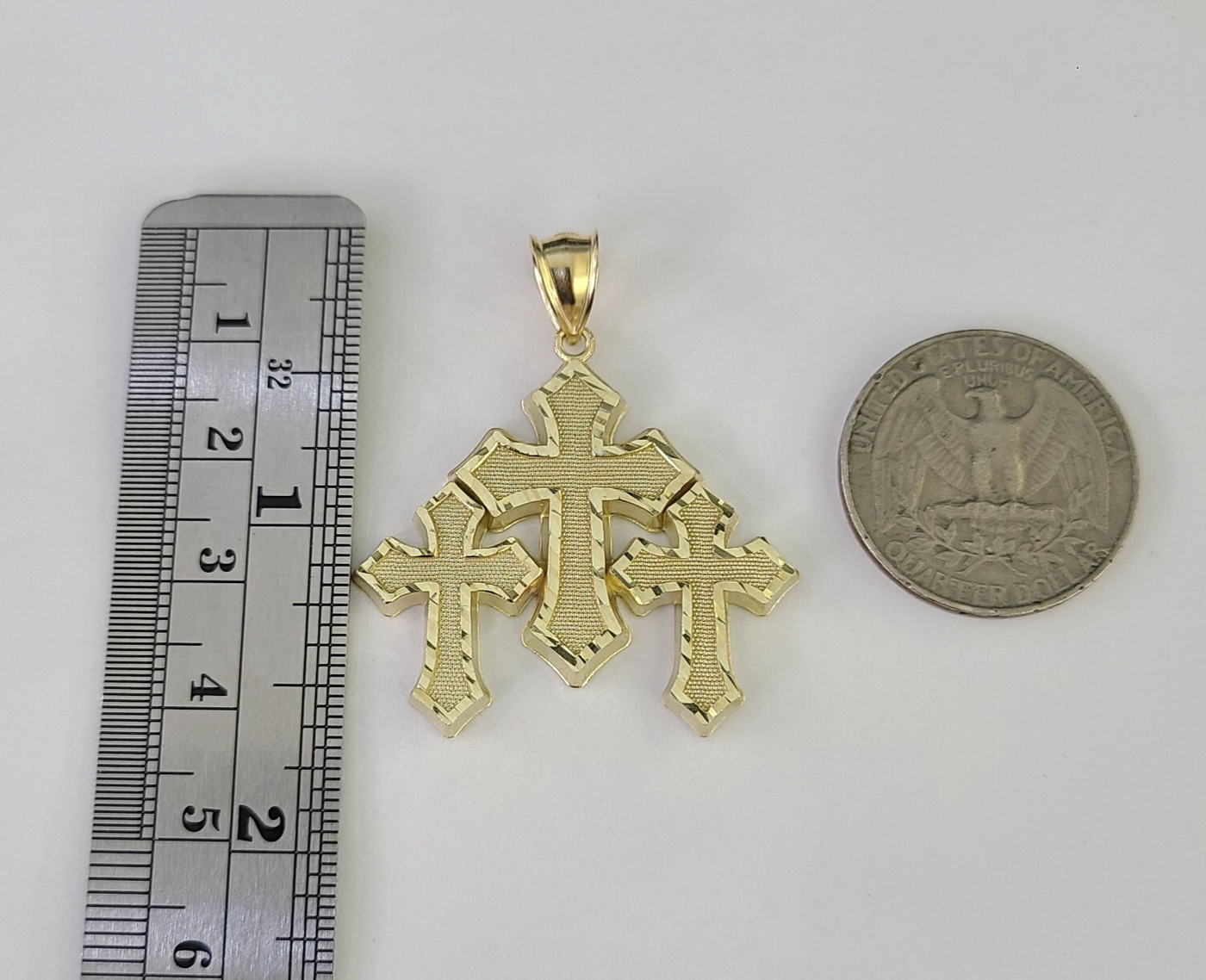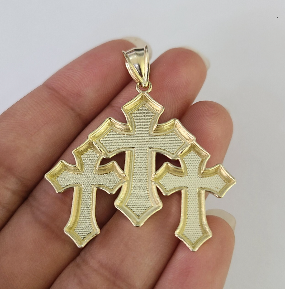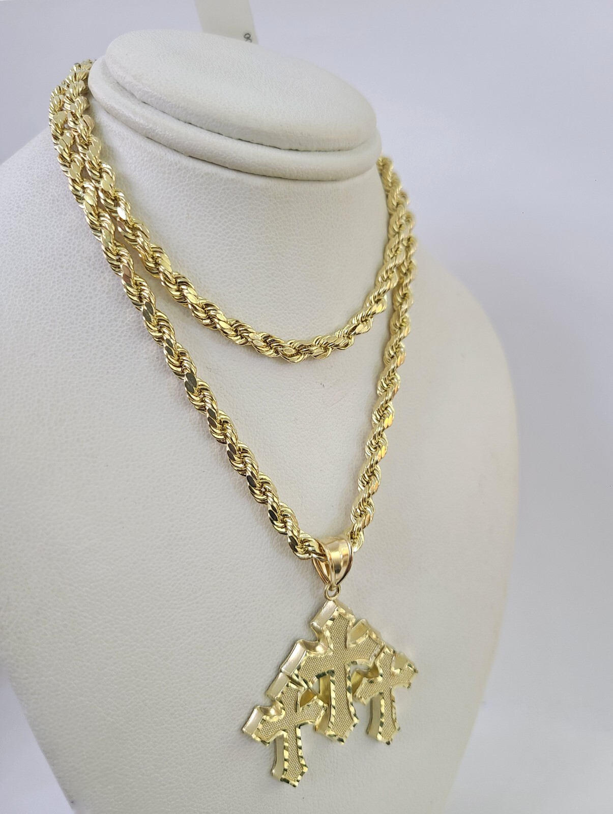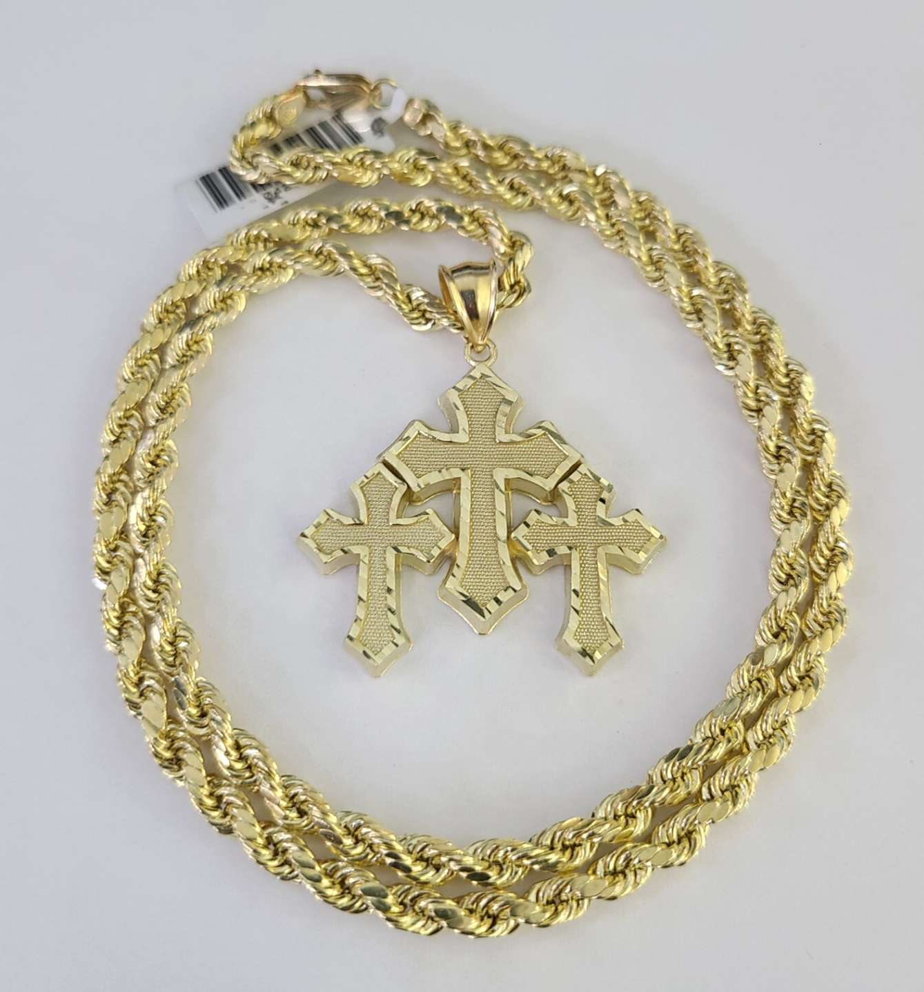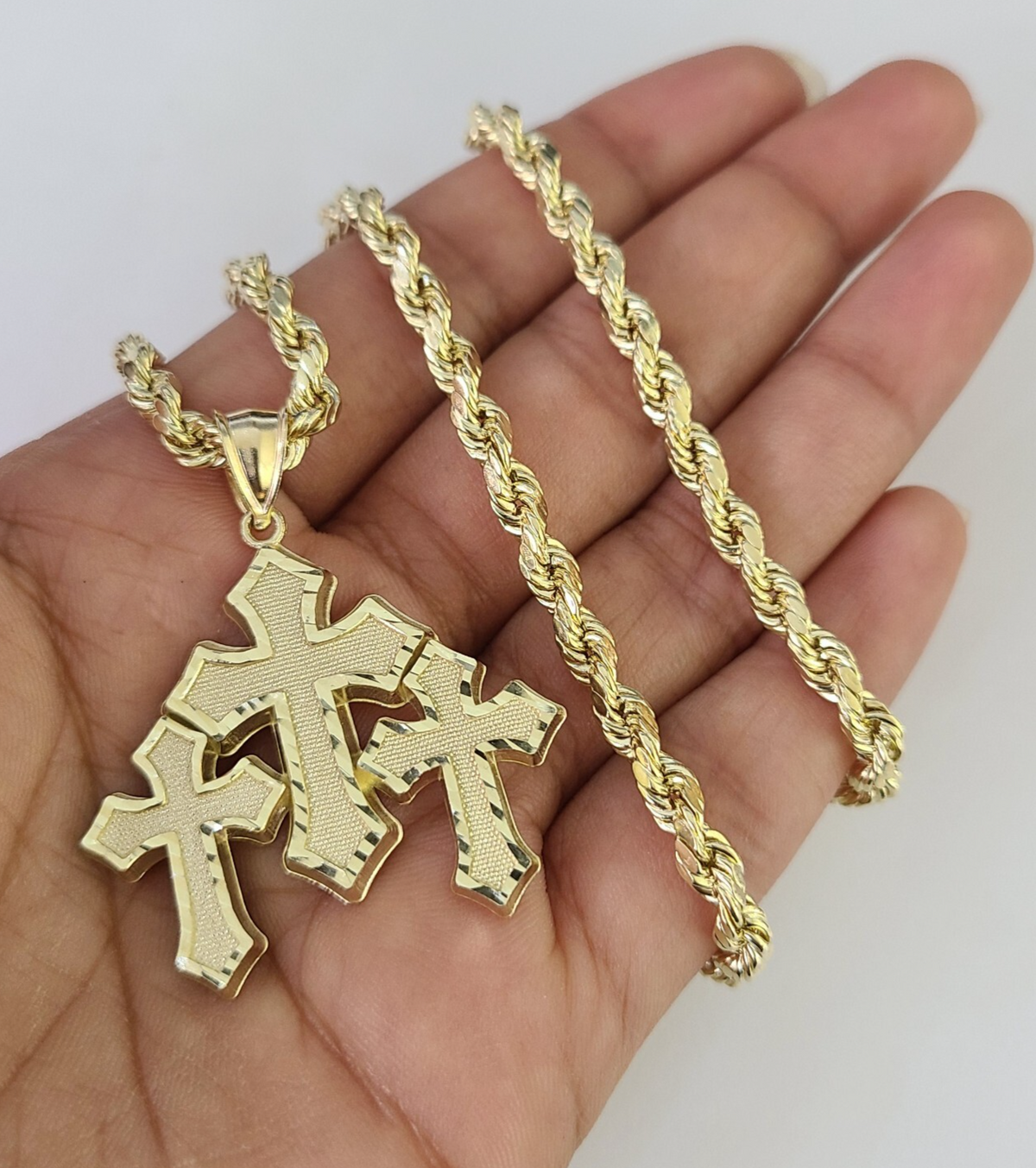 REAL 10k Jesus Triple Cross Charm Rope Chain Pendant 4mm Necklace Set 18"-28"