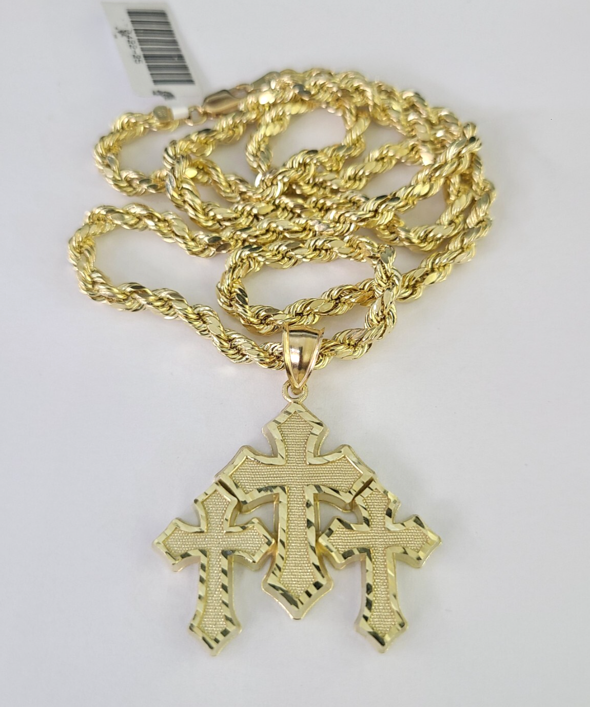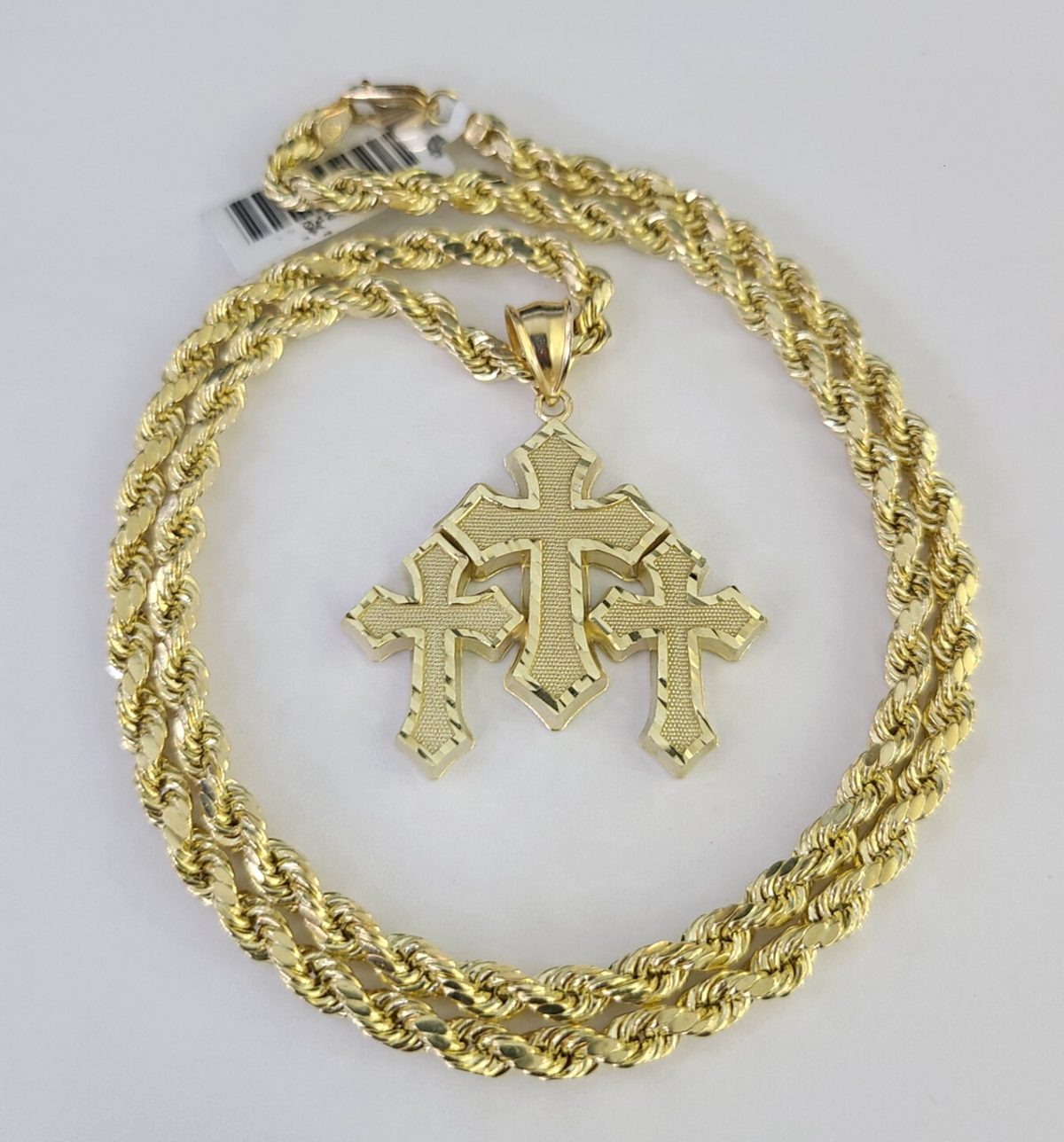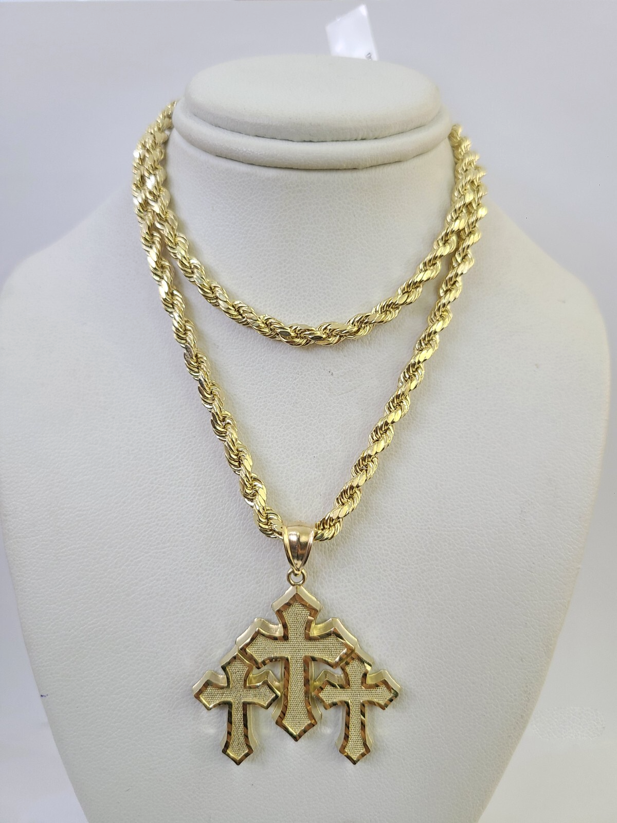 REAL 10k Jesus Triple Cross Charm Rope Chain Pendant 4mm Necklace Set – Goldenlinq index