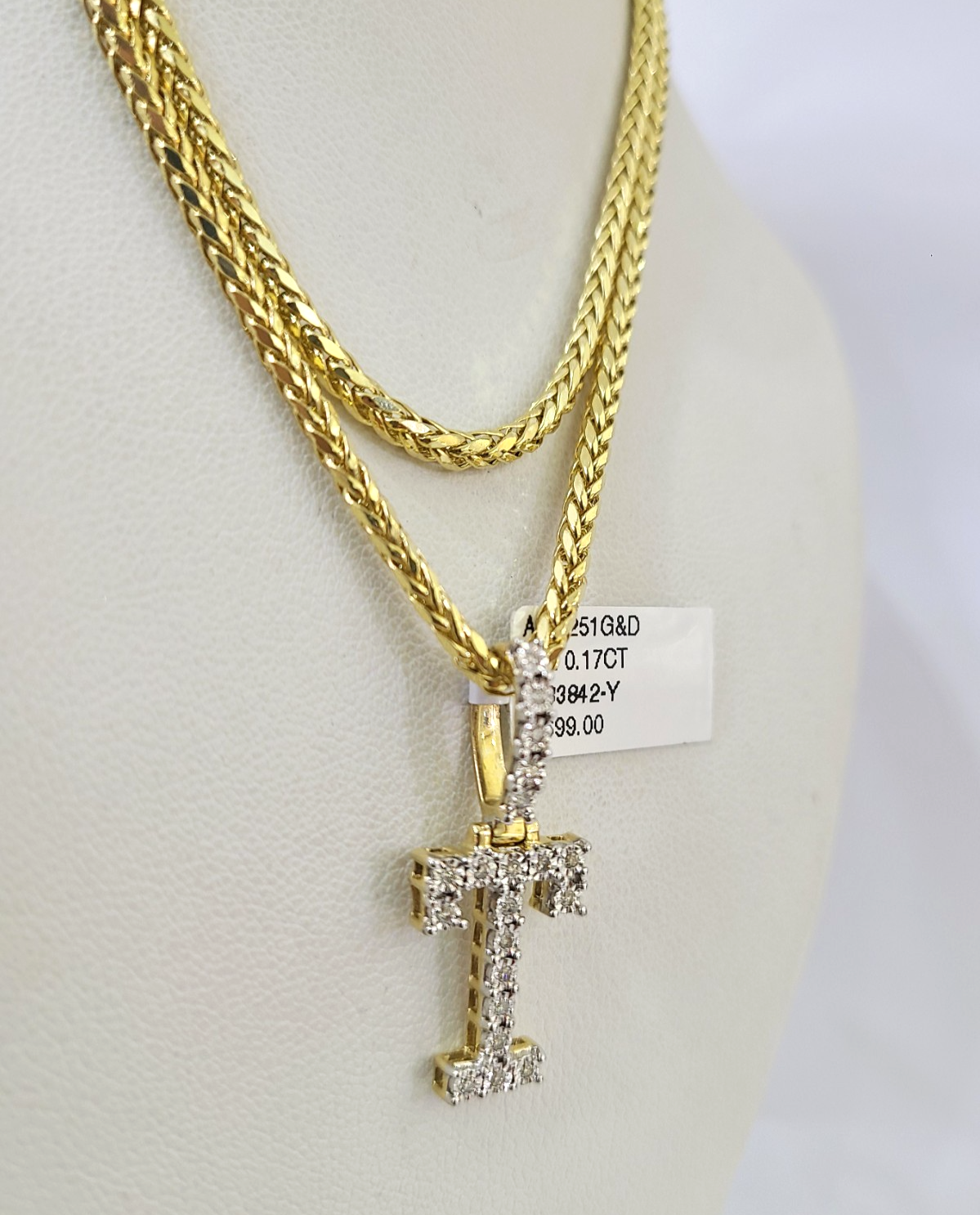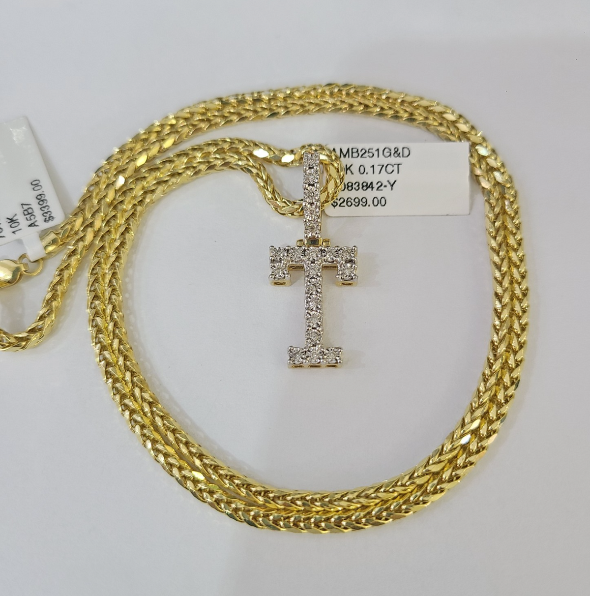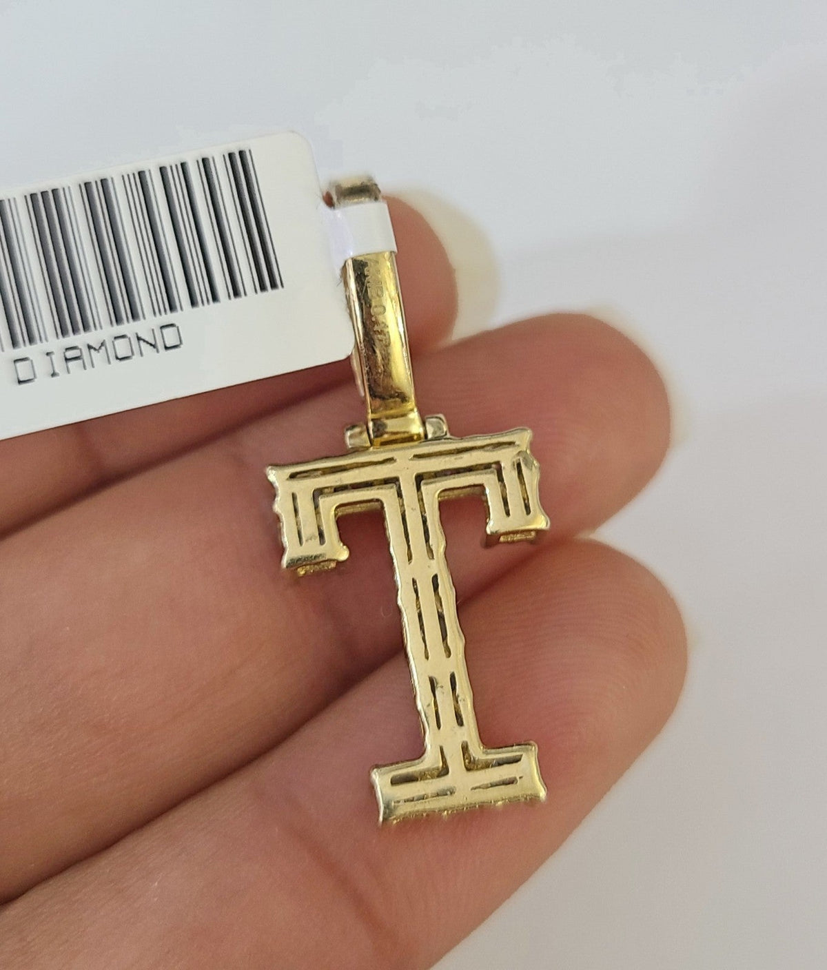 REAL 10k Yellow Gold Palm Chain T Diamond Initial Pendant Charm 3mm SET Necklace - 20 Inch with Chain