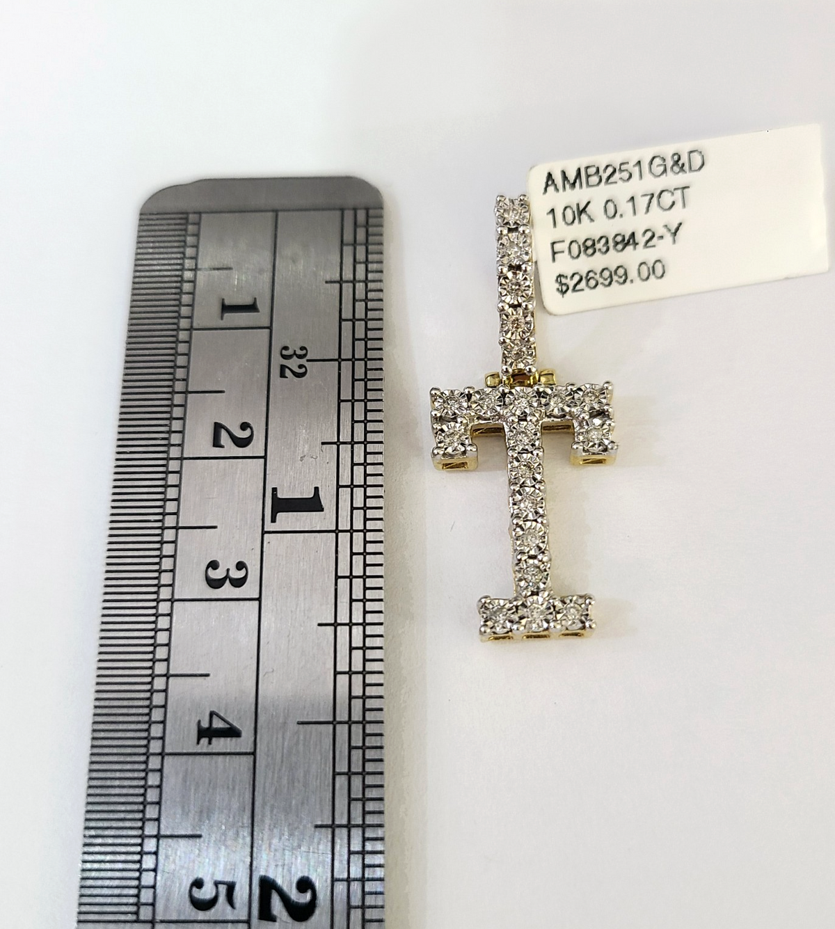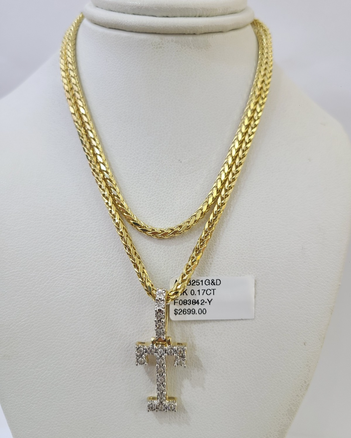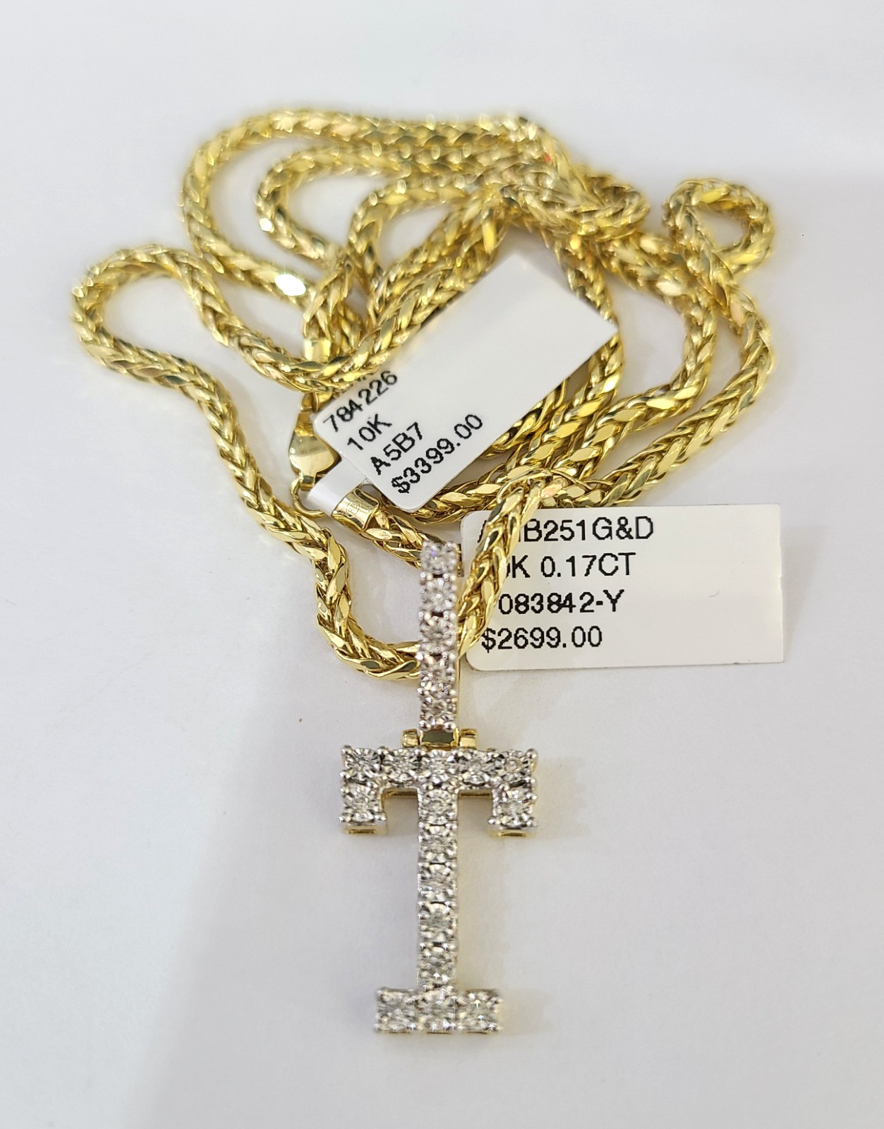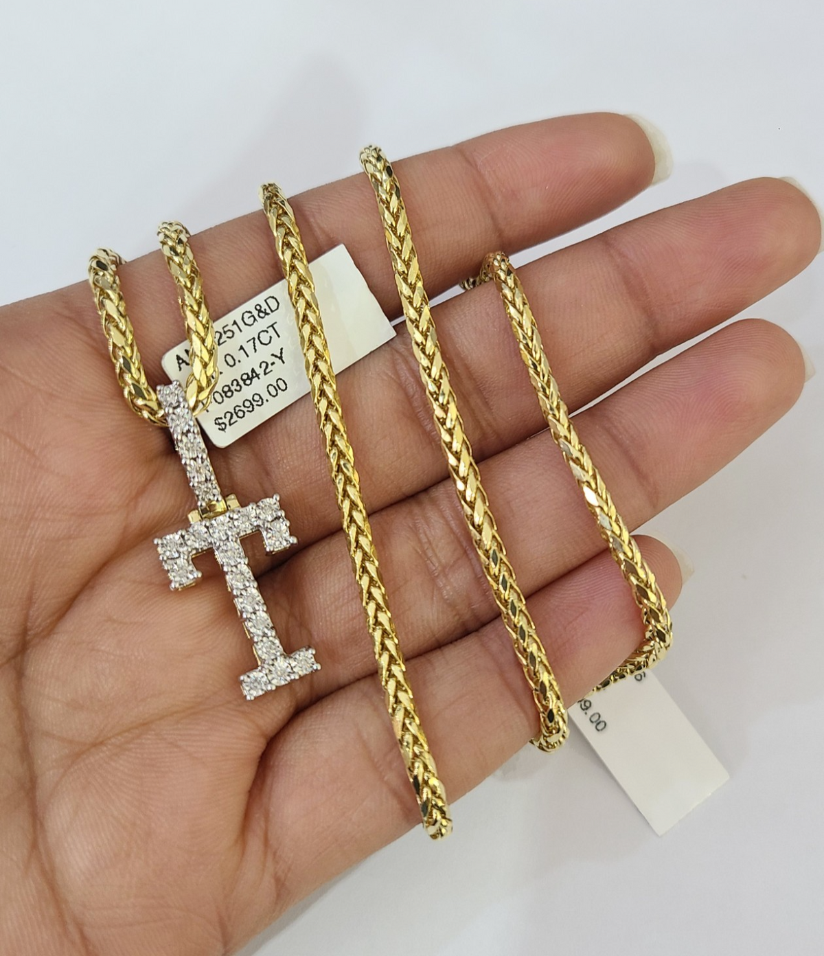 REAL 10k Yellow Gold Palm Chain T Diamond Initial Pendant Charm 3mm SET Necklace - 20 Inch with Chain