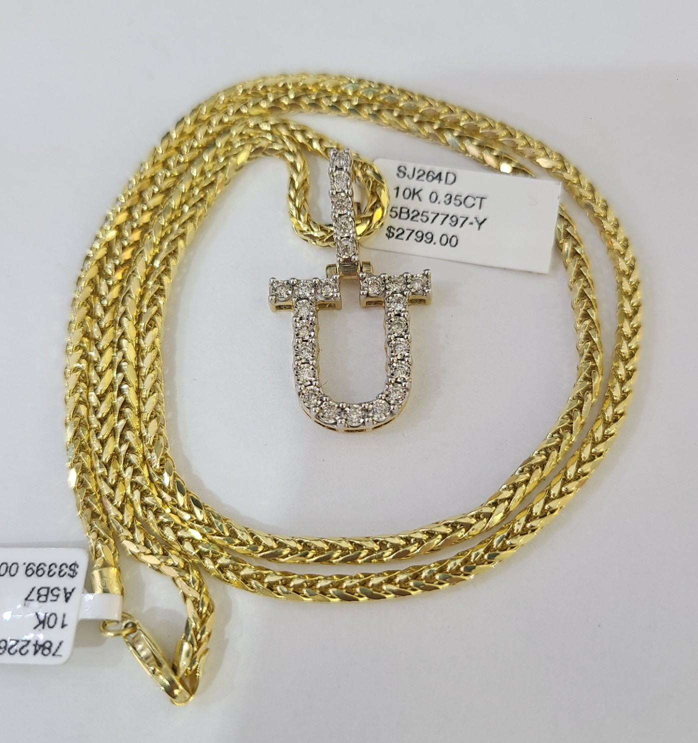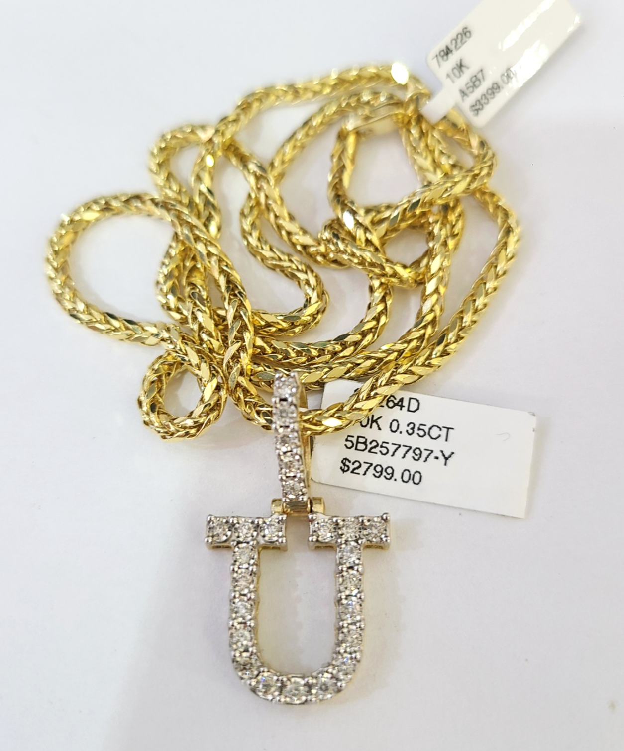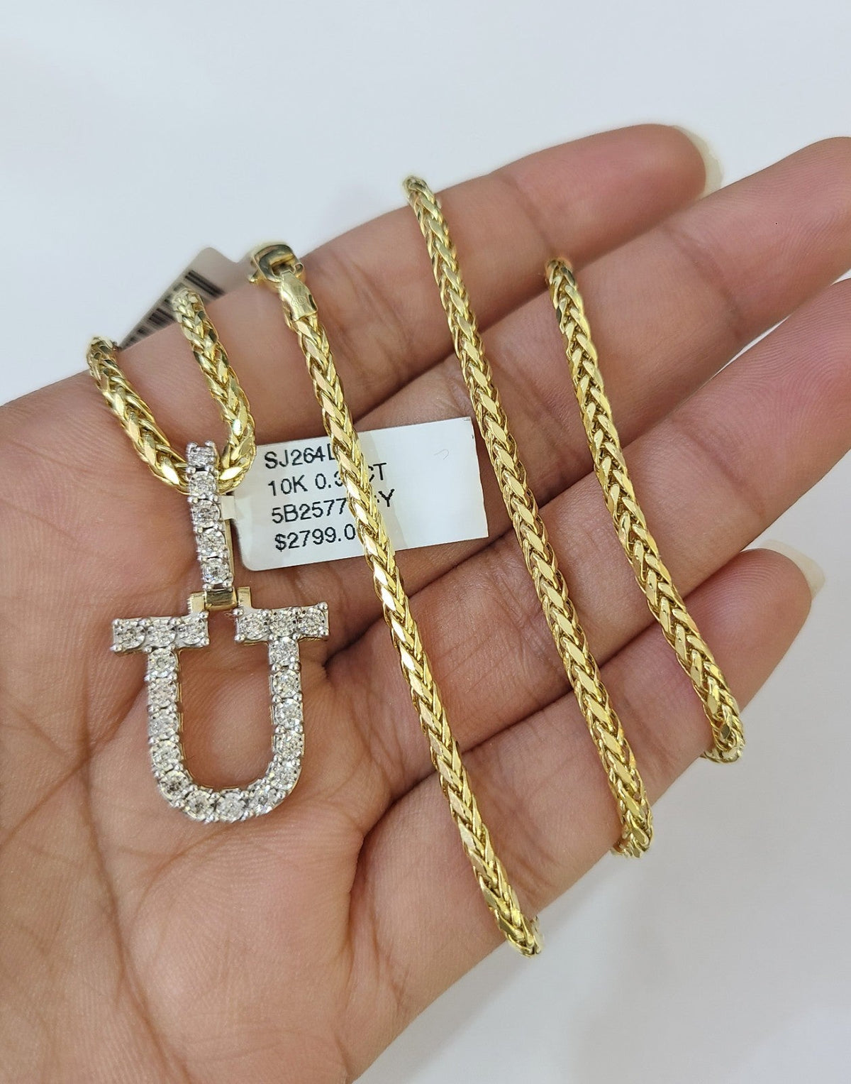 REAL 10k Yellow Gold Palm Chain U Diamond Initial Pendant Charm 3mm SET Necklace - 20 Inch with Chain