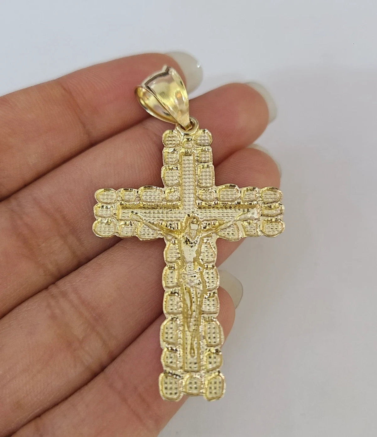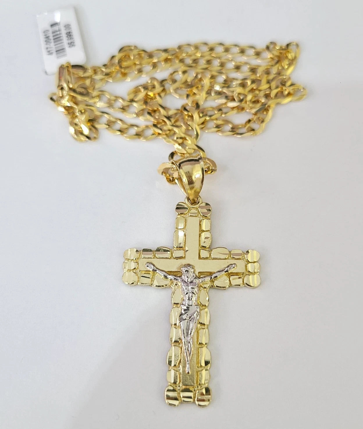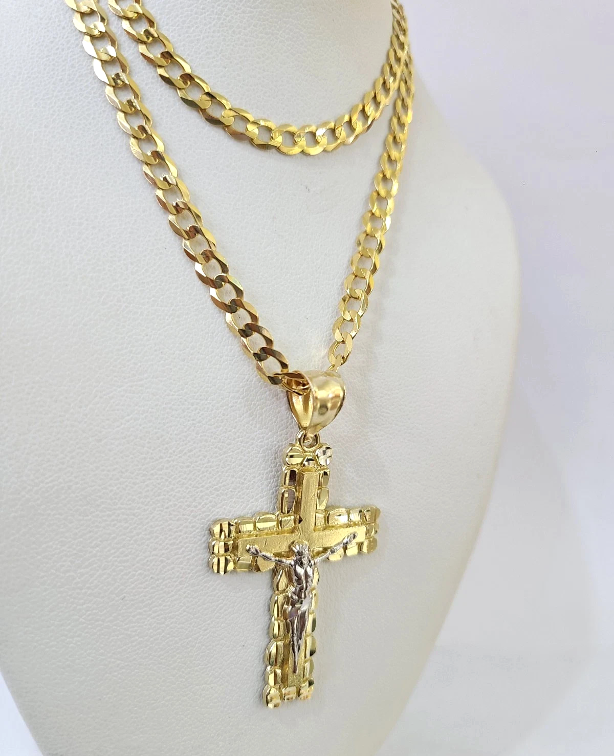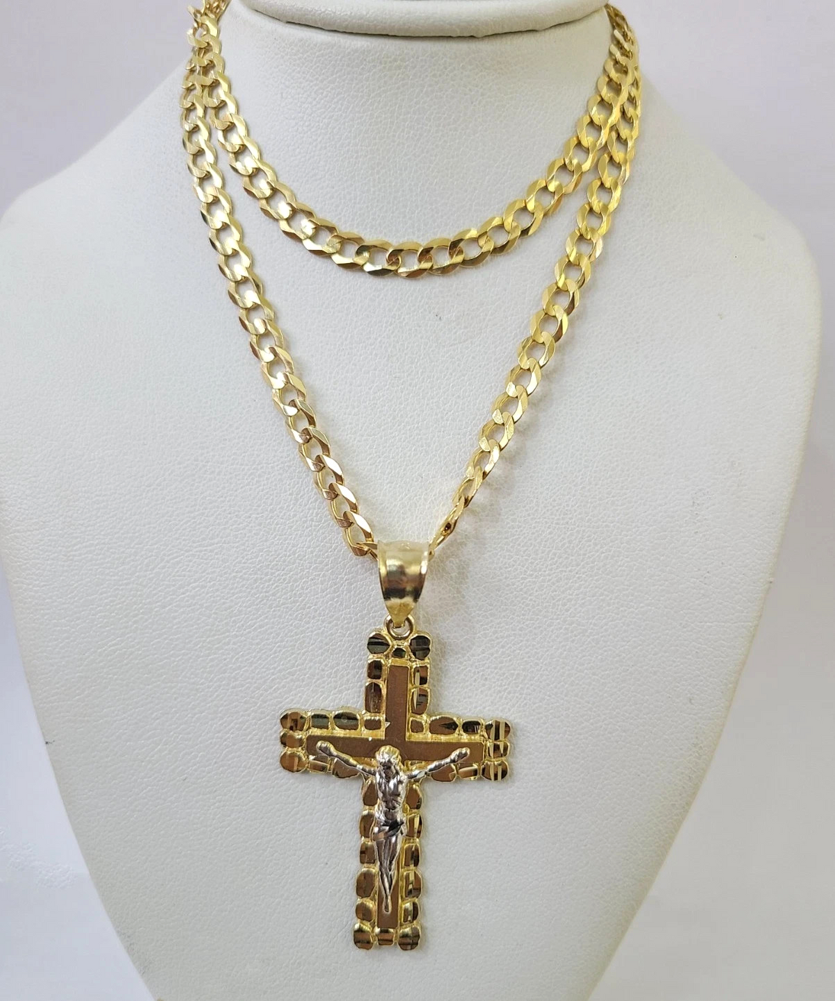 10k Gold Chain Cuban Curb Jesus Cross Charm Pendant Link 5mm 18"-28" Inch SET