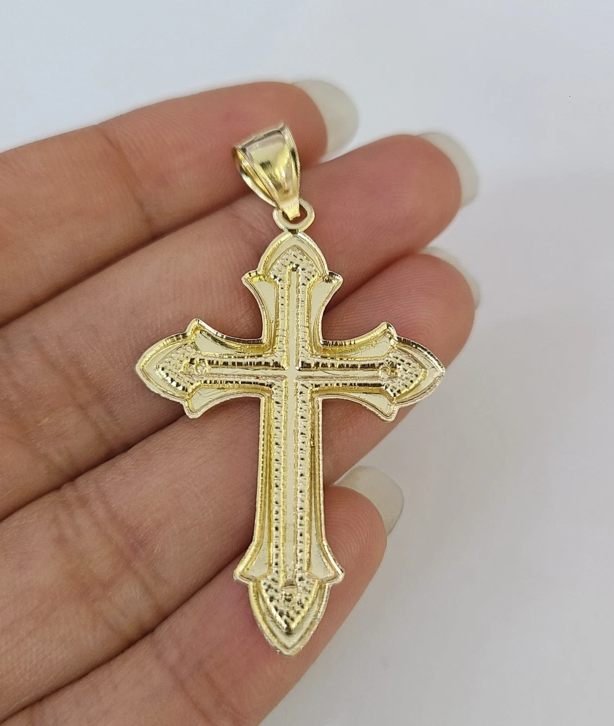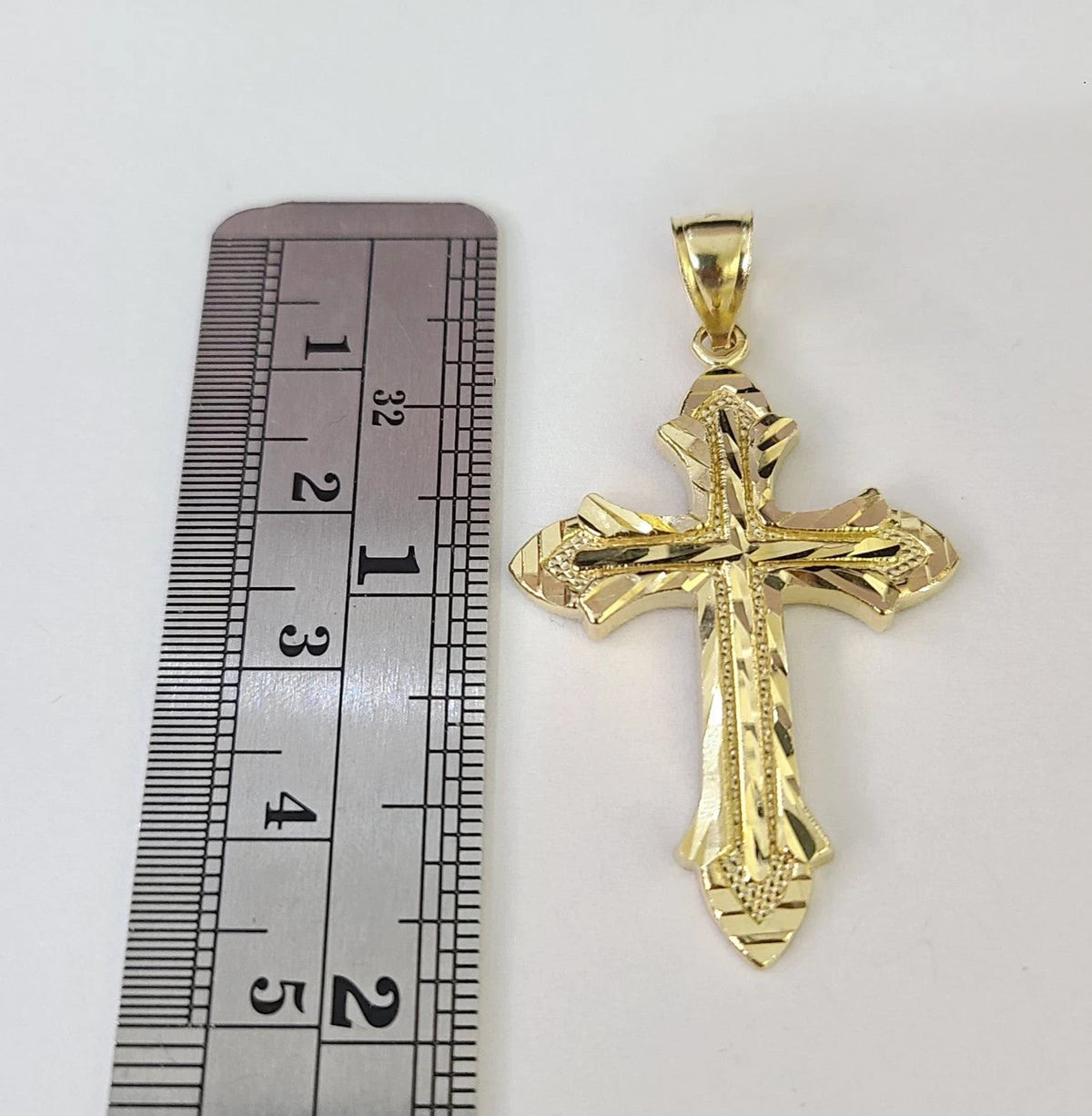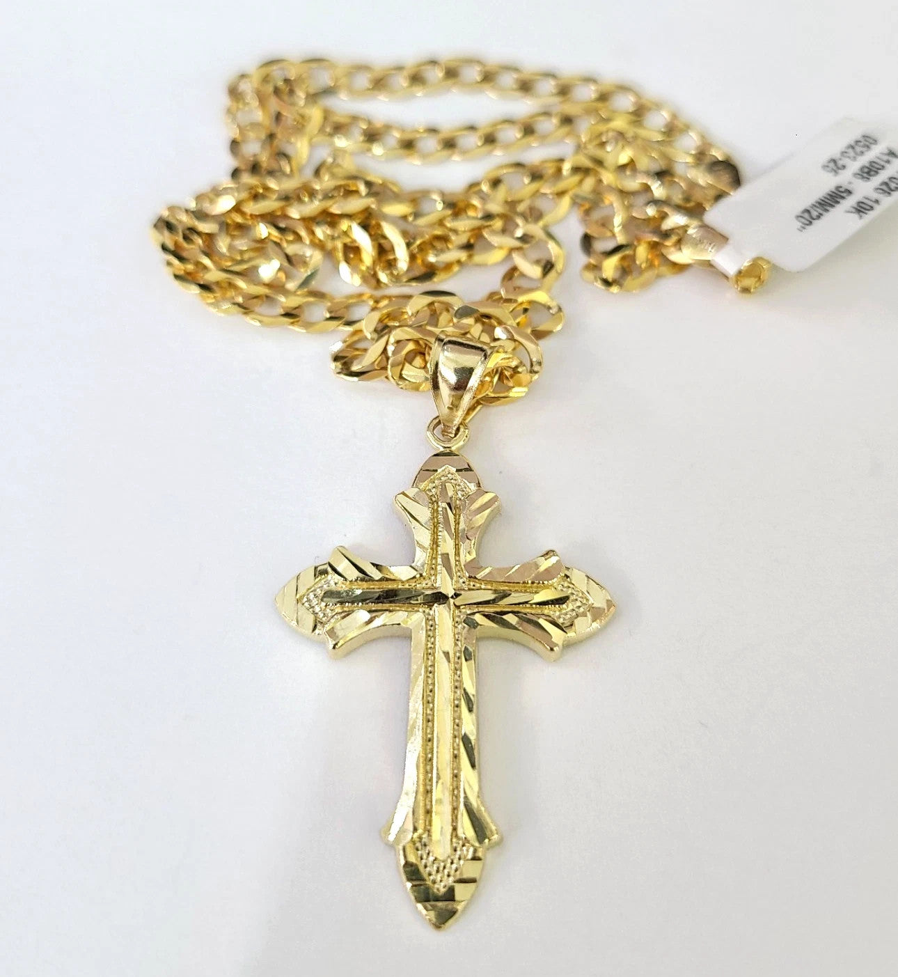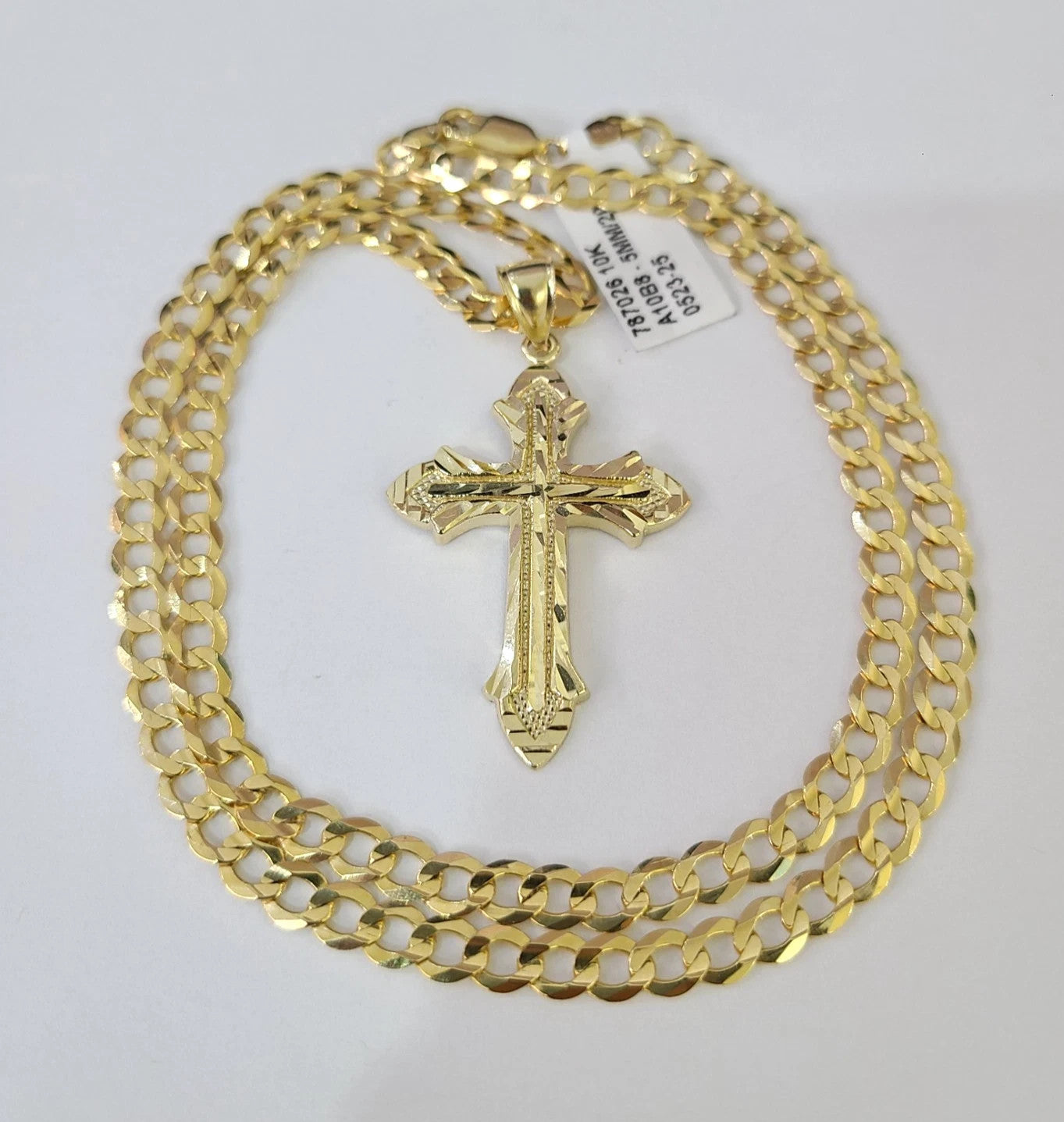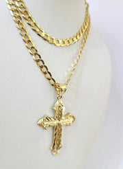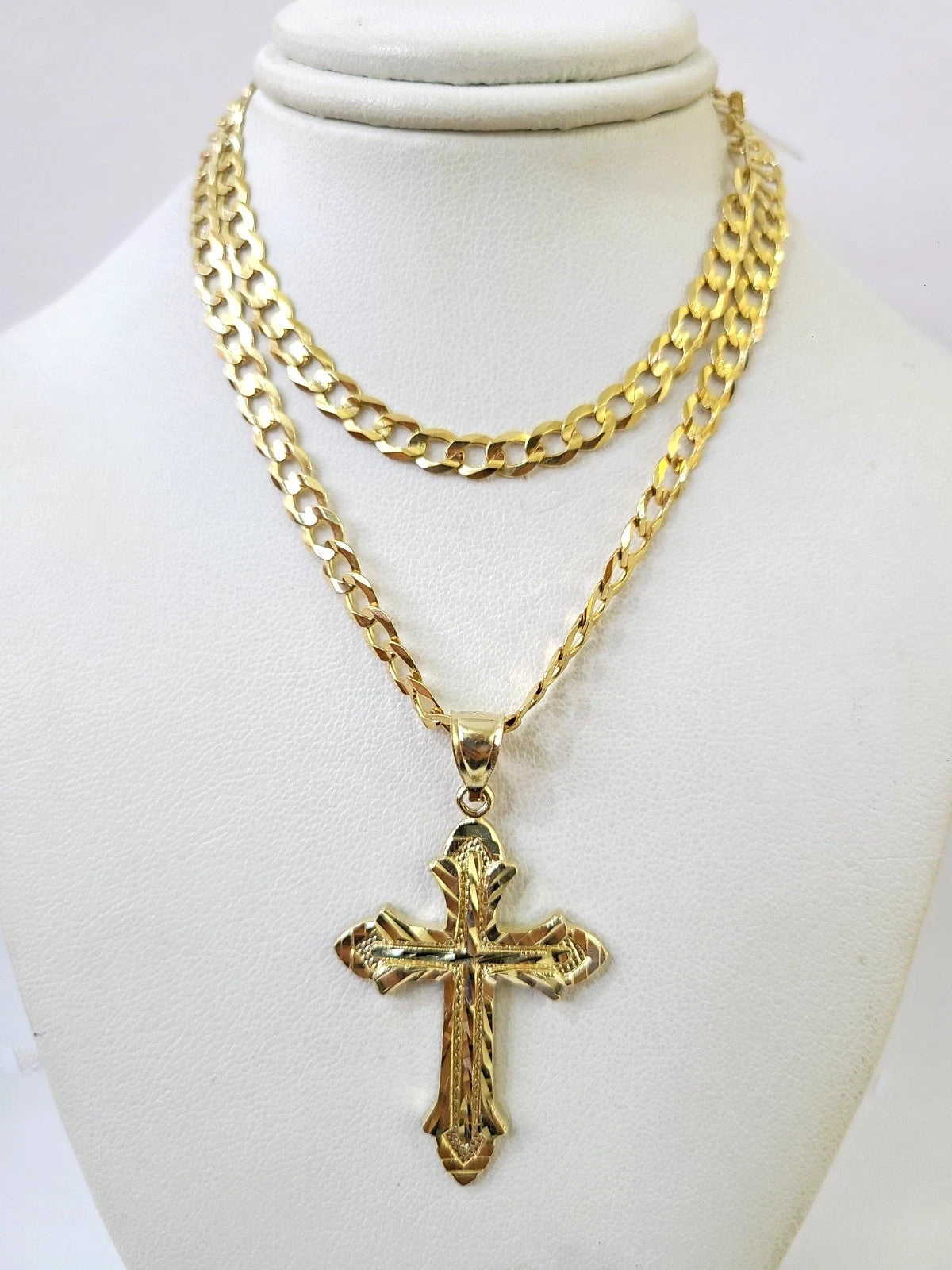 10k Gold Chain Jesus Cross Charm Pendant Cuban Curb Link 5mm 18"-28" Inch SET