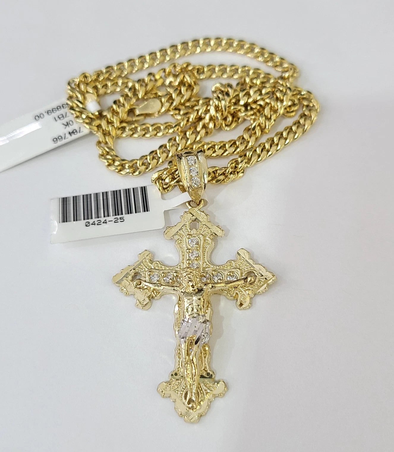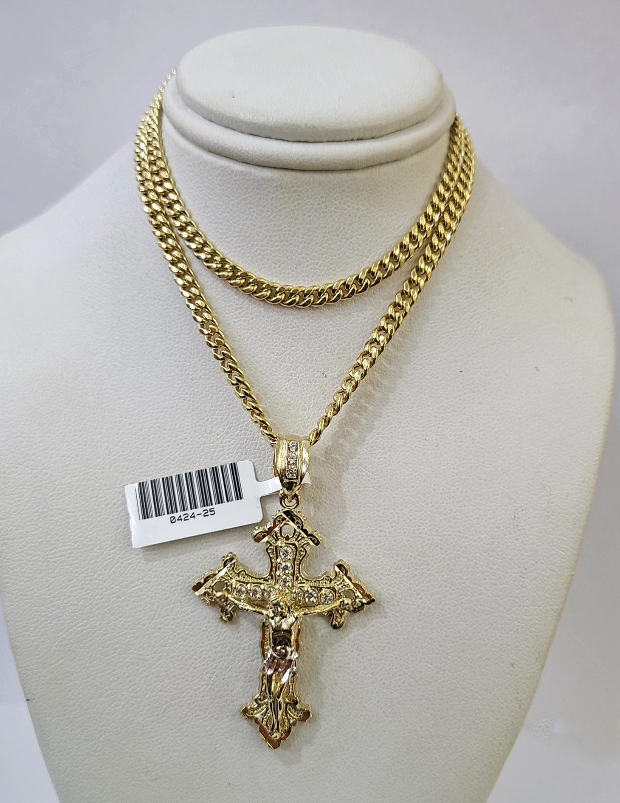 10k Gold Chain Miami Cuban Jesus Cross Charm Pendant Set 4mm 18"-28" Necklace - 20 Inch
