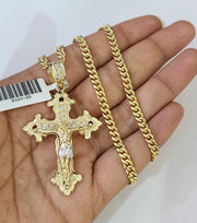 10k Gold Chain Miami Cuban Jesus Cross Charm Pendant Set 4mm 18"-28" Necklace