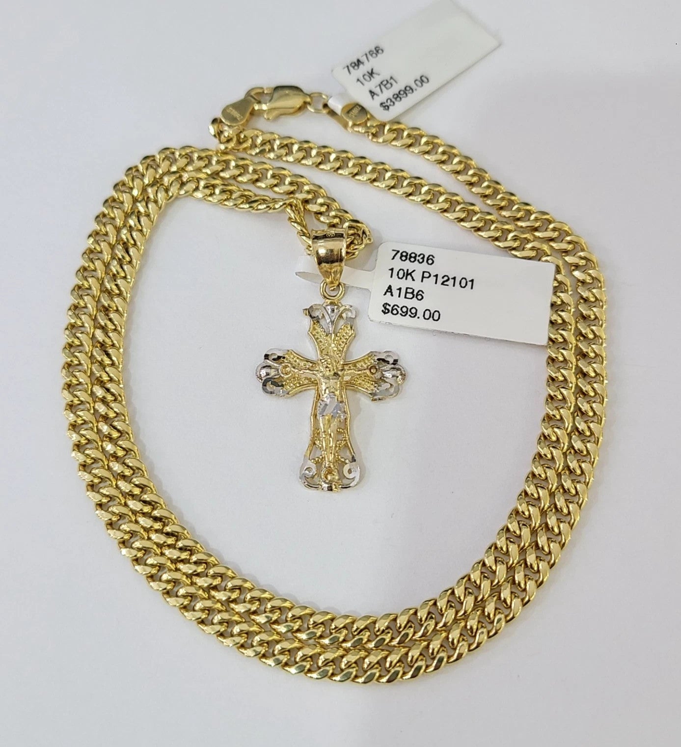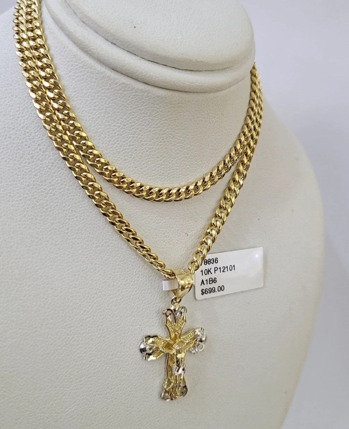 10k Gold Chain Miami Cuban Jesus Cross Charm Pendant Set 4mm 18"-28" Necklace - 20 Inch