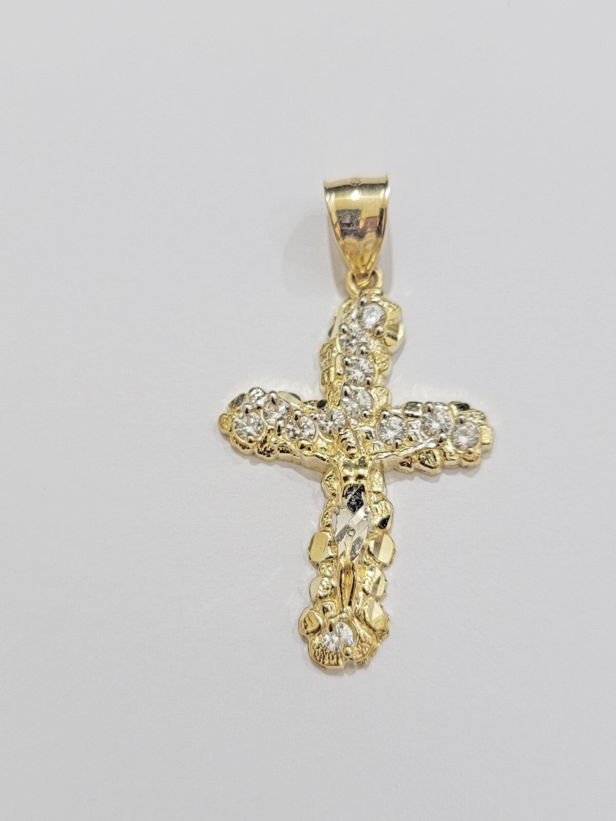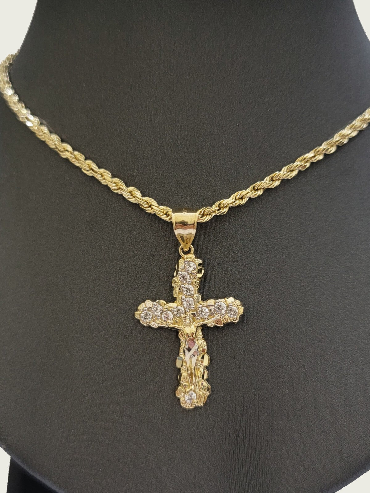 Genuine 10 k Yellow Gold Rope Chain 3mm With Jesus Crucifix Cross diamond cuts design. The Various length of the Chain are 18"-28" with Jesus Crucifix Cross 1.5 inches. The pendants are unique in design and considered durable too. The stones are cubic zirconia If you are not happy with the way it looks or feels, we do offer 30 - Days FREE Return shipping. Contact us for more information.