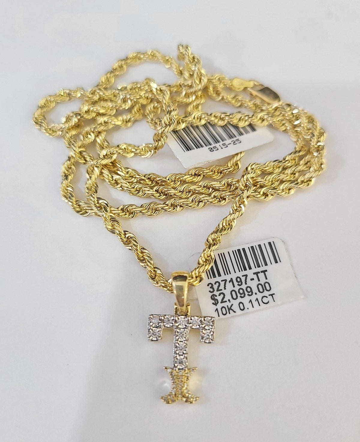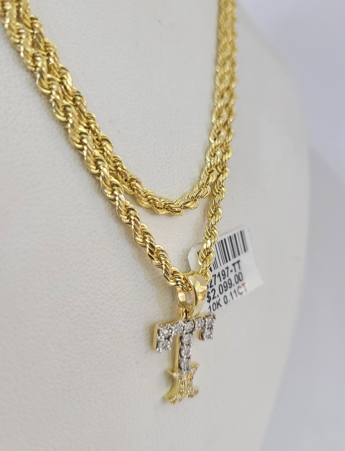 10k Gold Rope Chain T Diamond Alphabet Charm Necklace SET 3mm 18"-28" Pendant