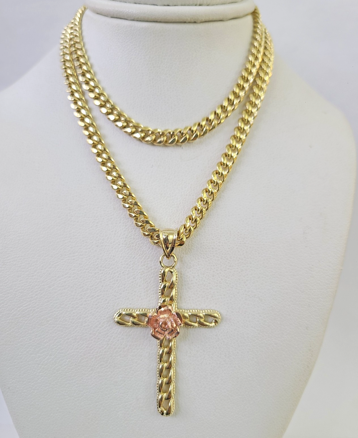 10k Jesus Cross Charm Miami Cuban Chain Pendant Set 5mm 18"28" Necklace Gold - With 18 Inch Chain