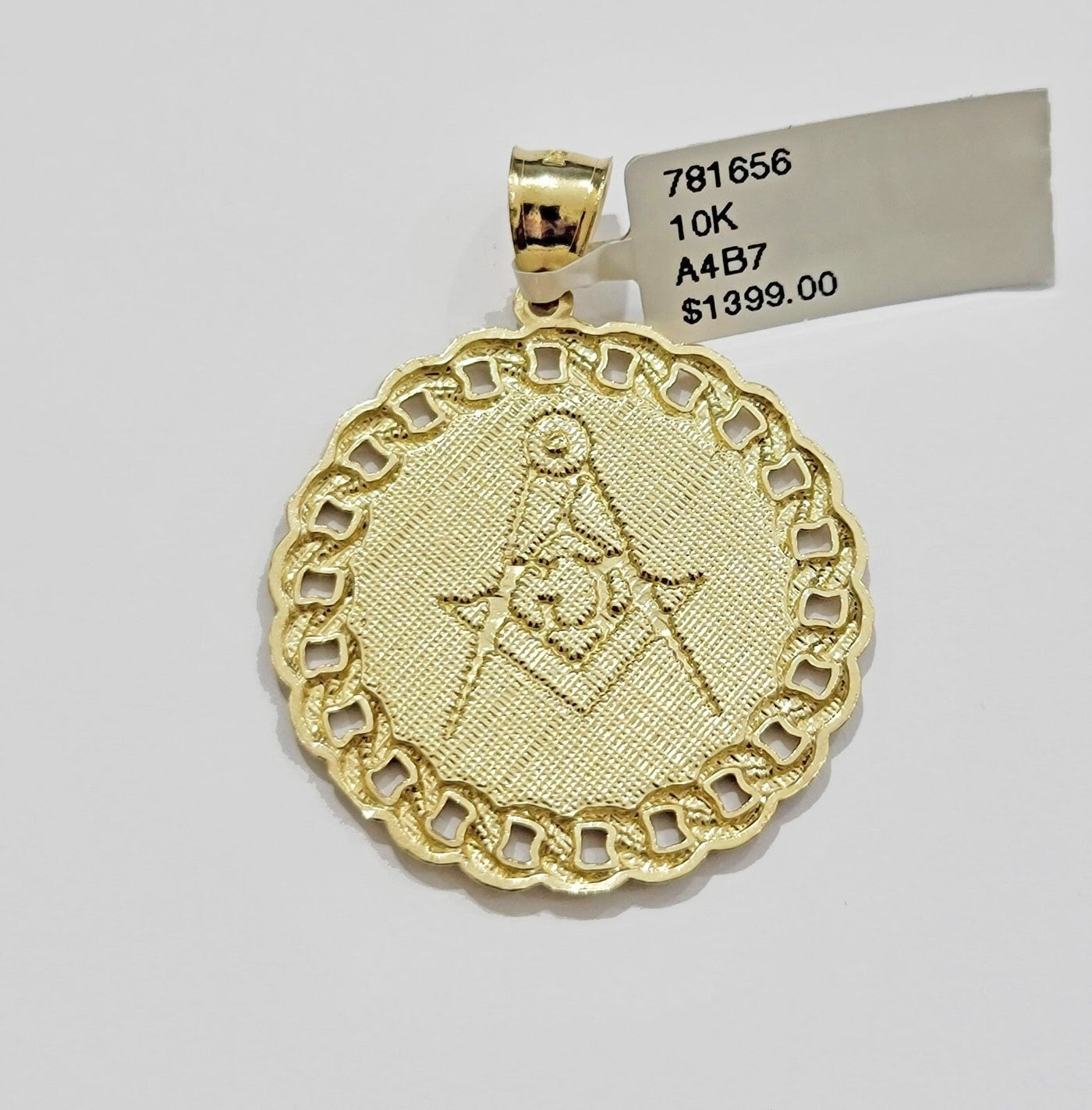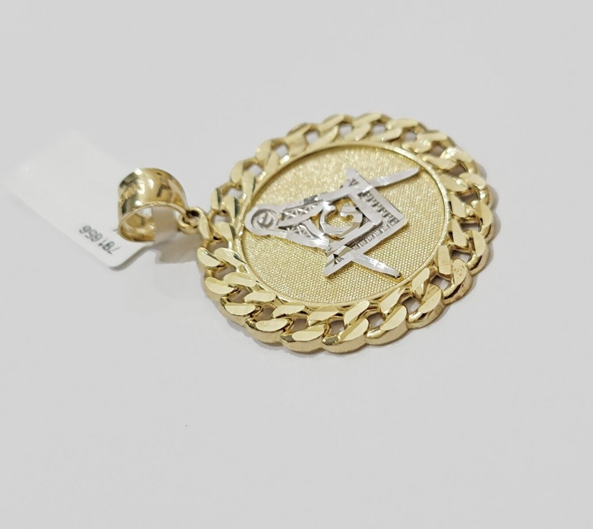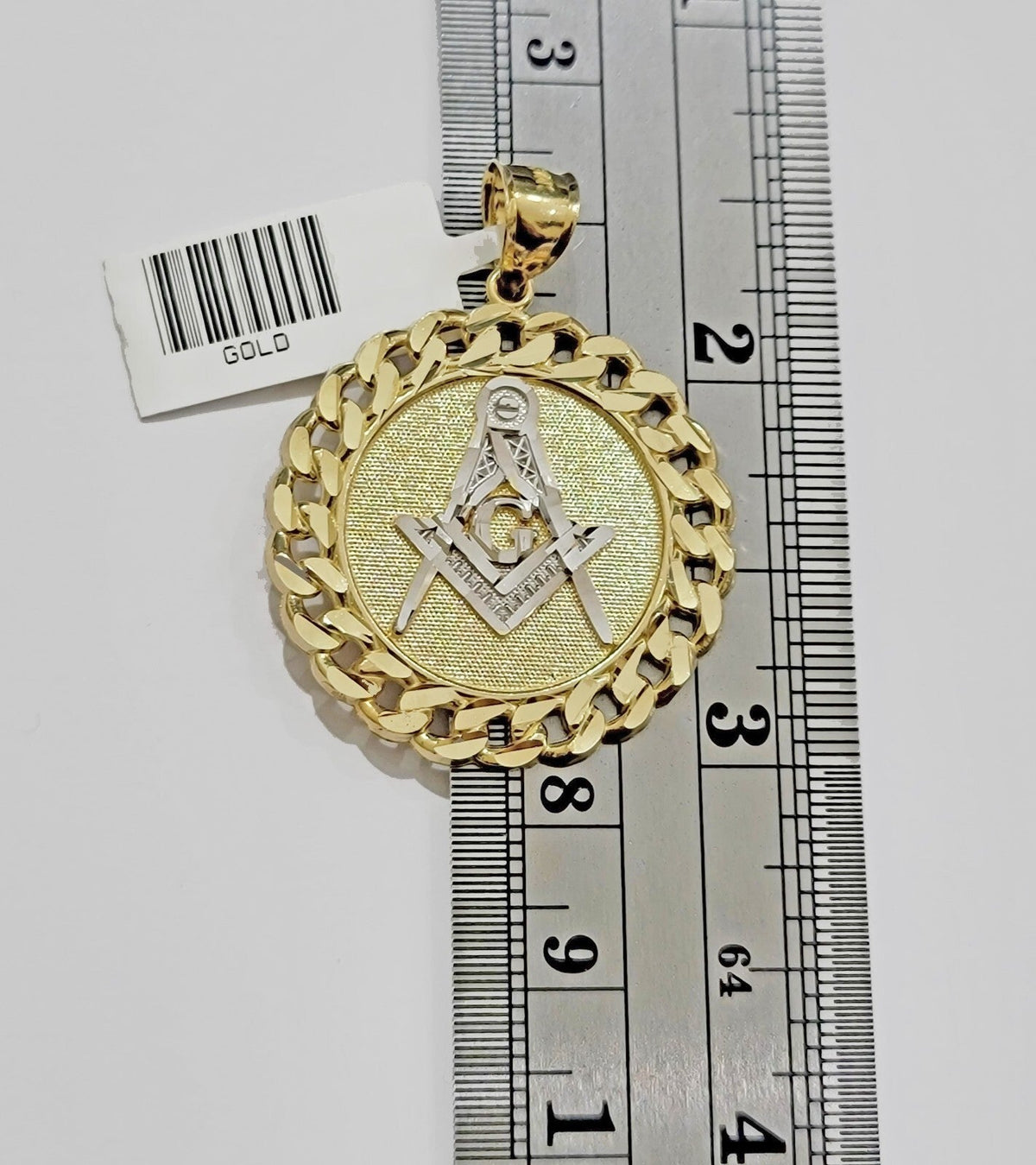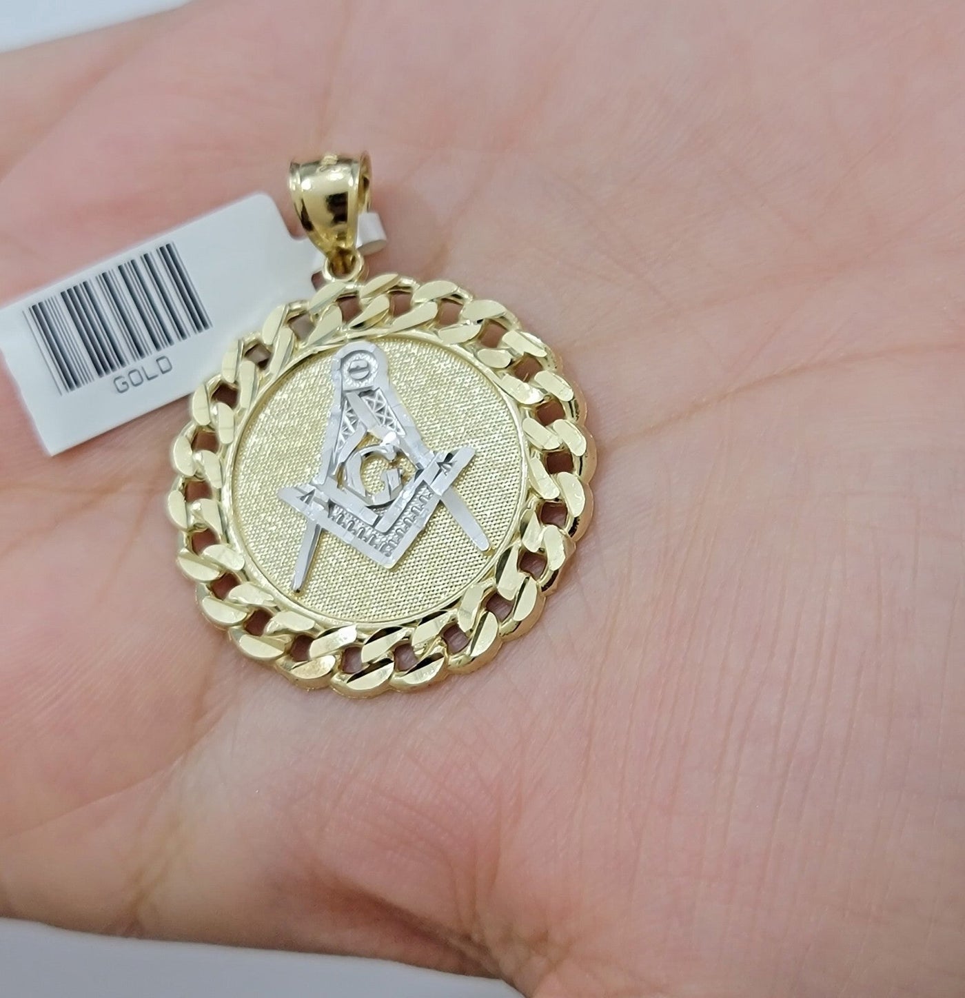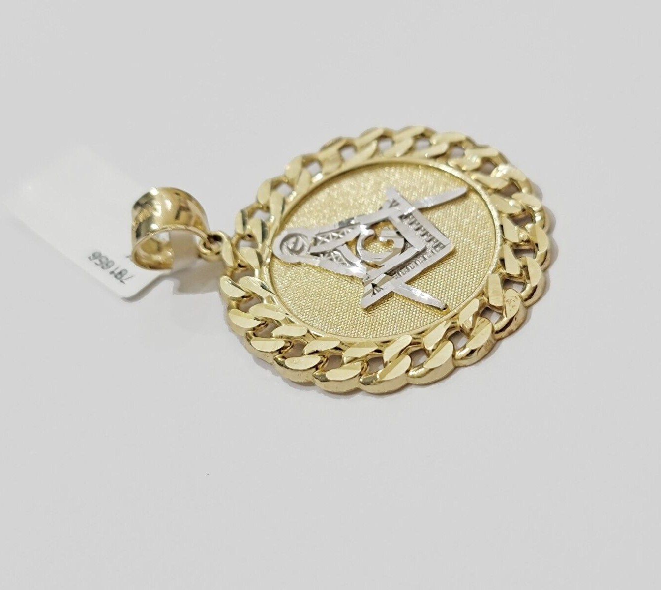 10k Yellow Gold masonic Charm pendant with Cuban link circular