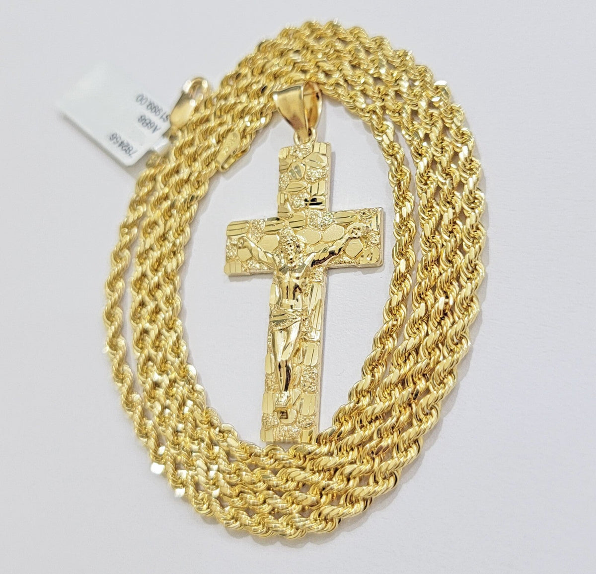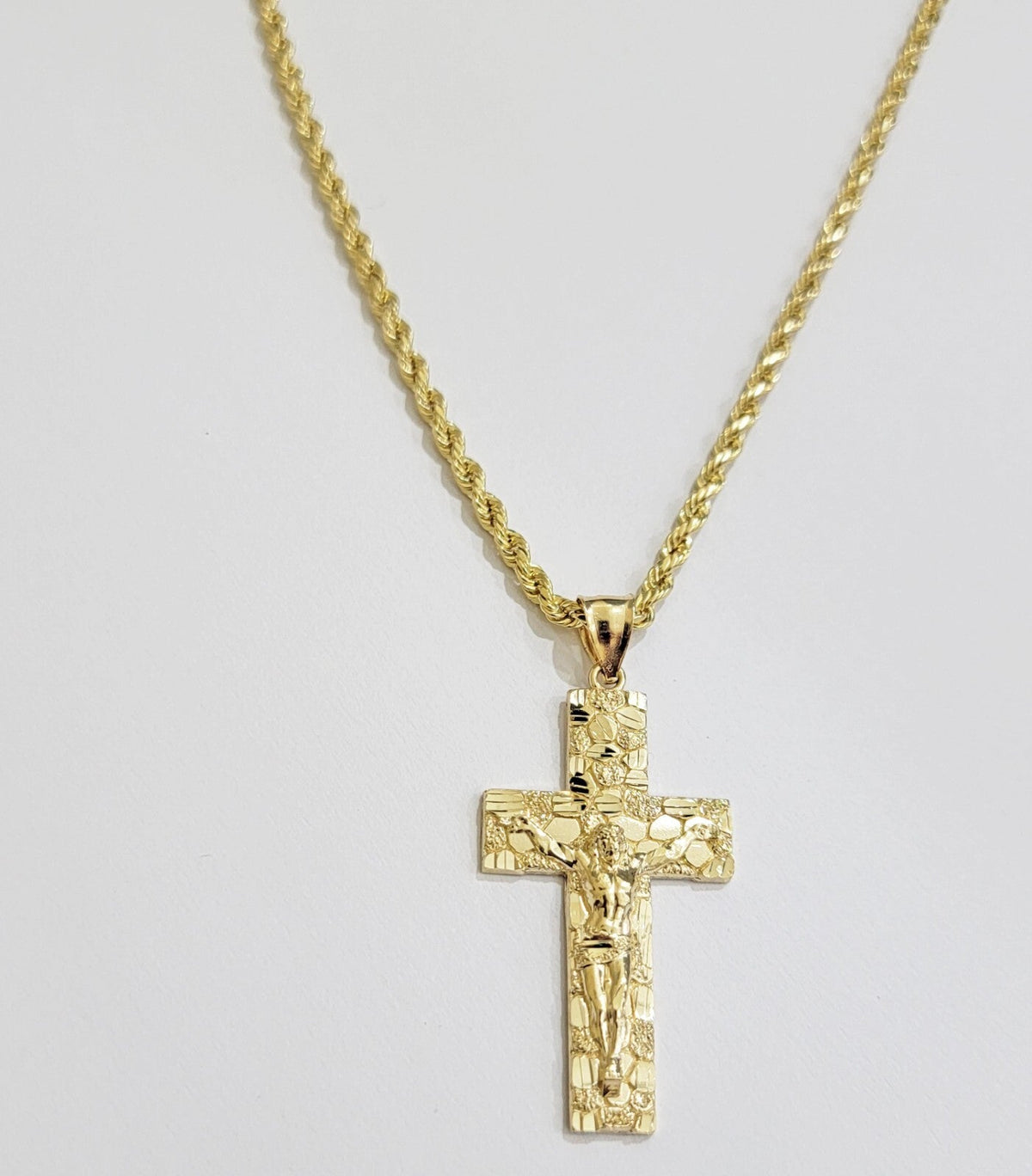 10k Yellow Gold Rope Chain Nugget Cross Charm Set 24 Inch necklace pendant, REAL