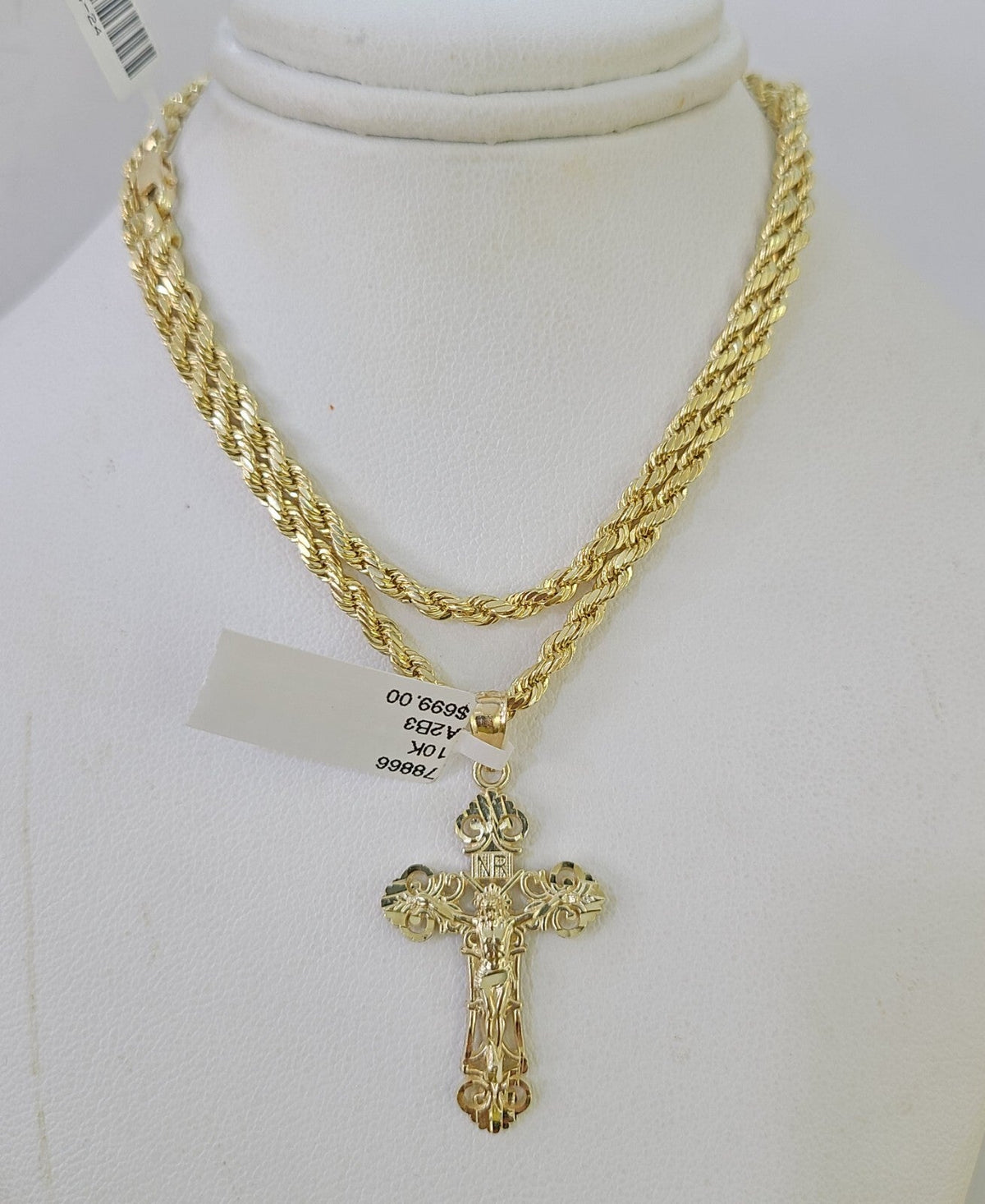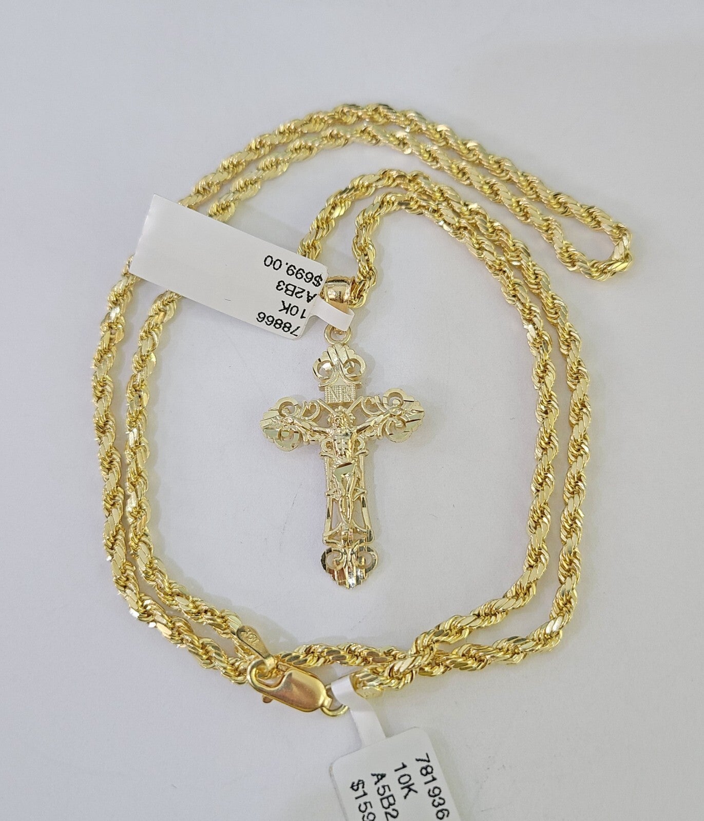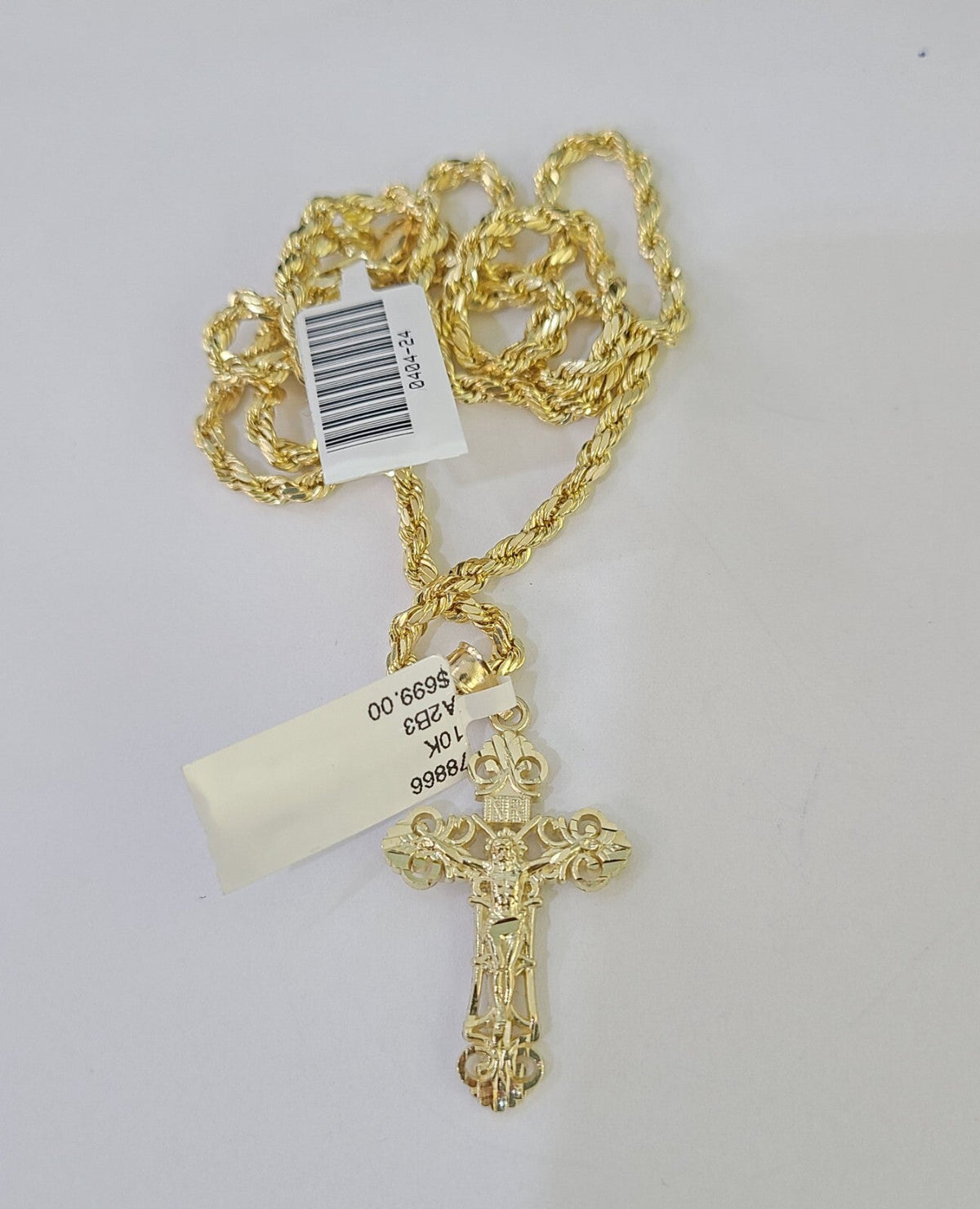 Real 10k 3mm Rope Chain Jesus Cross Pendant Charm 20" Set end Yellow - 20"