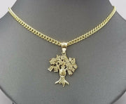 REAL 10k Miami Cuban Chain And Money Tree Charm Pendant 3mm Necklace Set 18"-28"