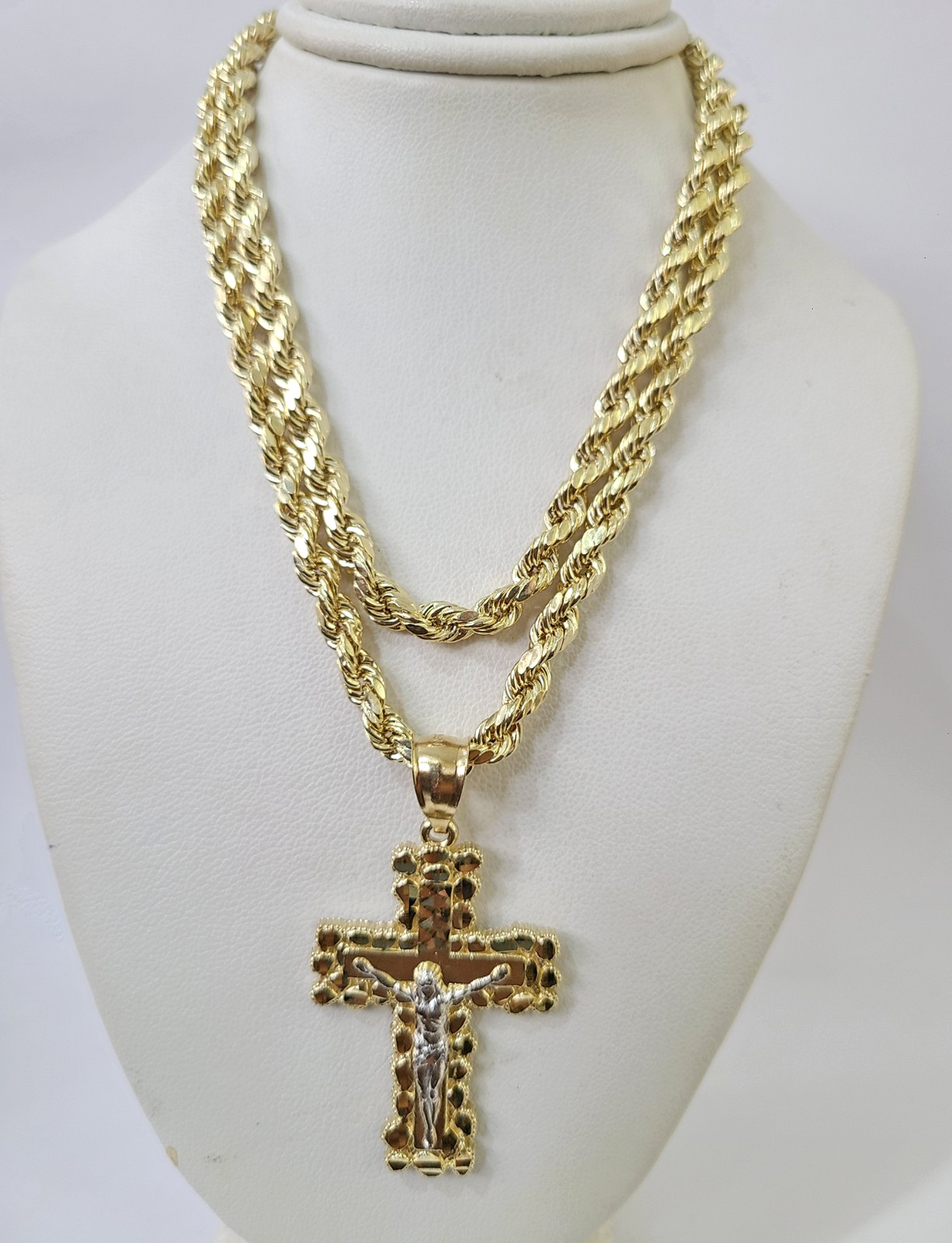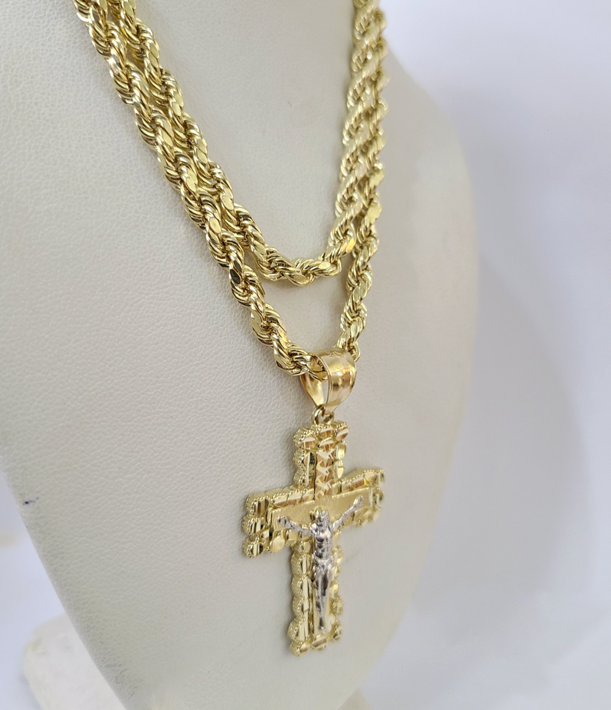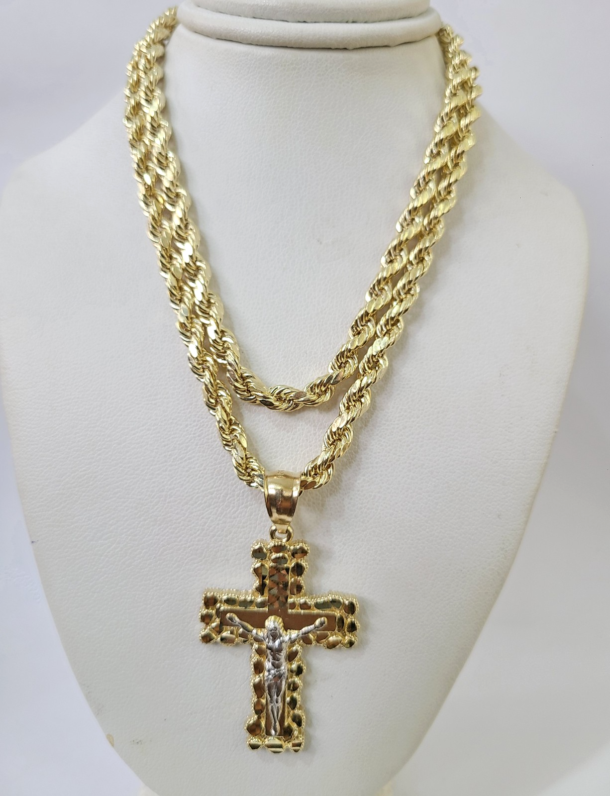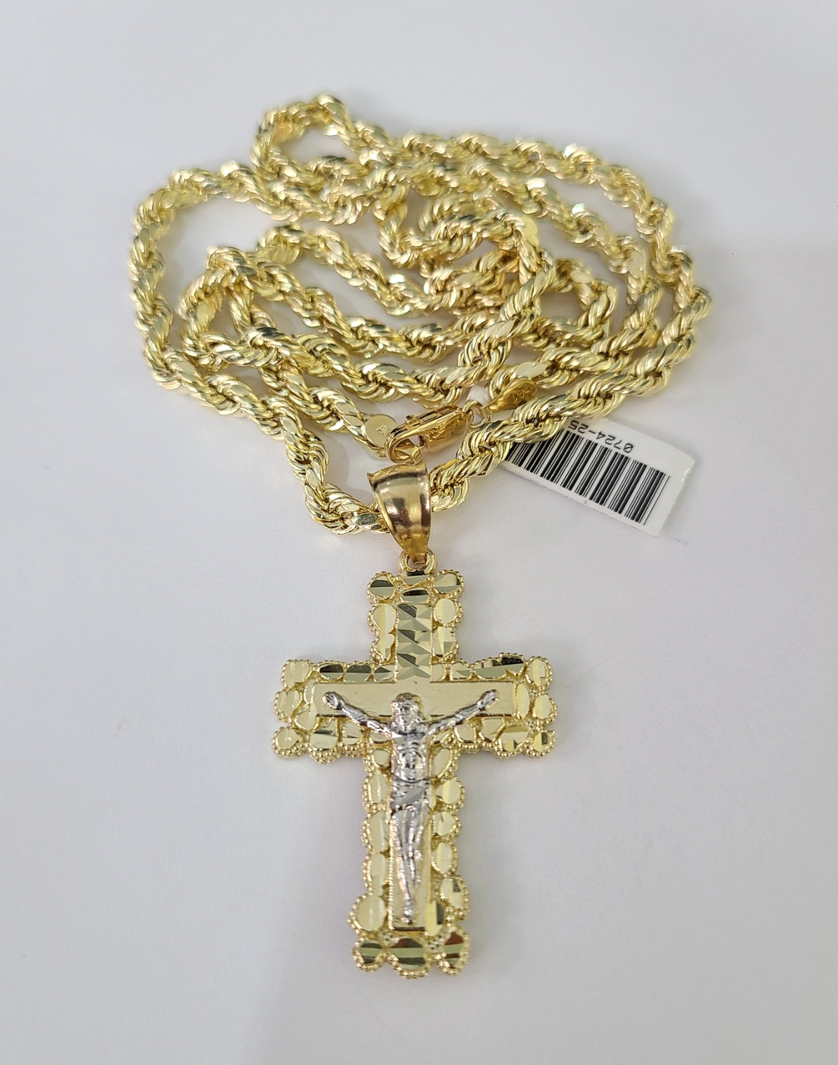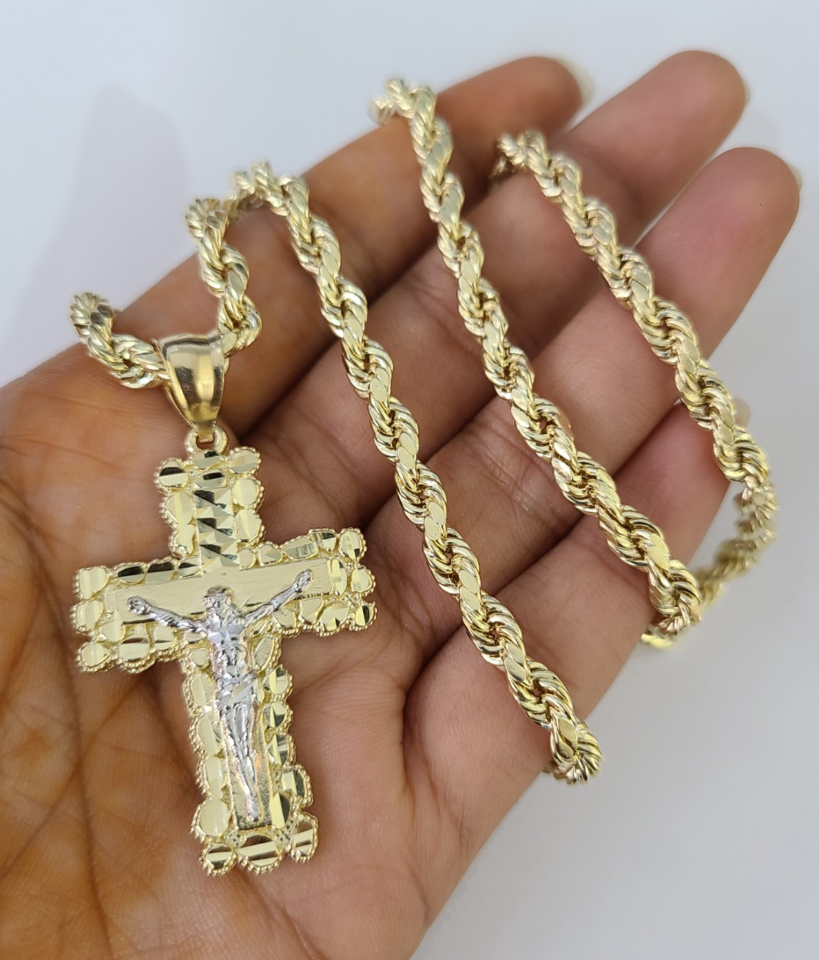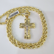 Real 10k Rope Chain Jesus Cross Charm Necklace Pendant Set 4mm 18"-28" Gold - 22 inch with charm