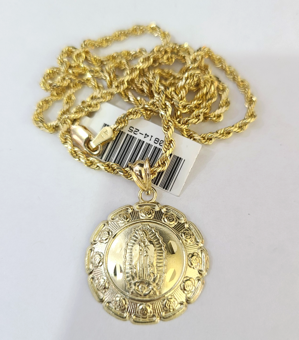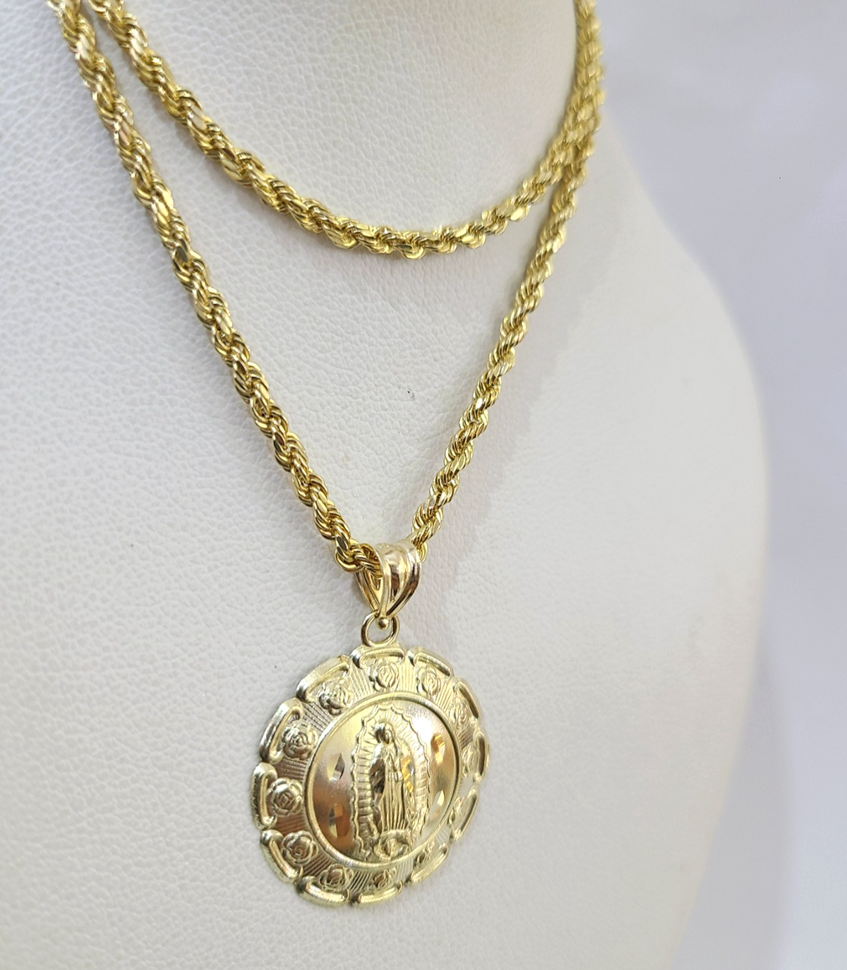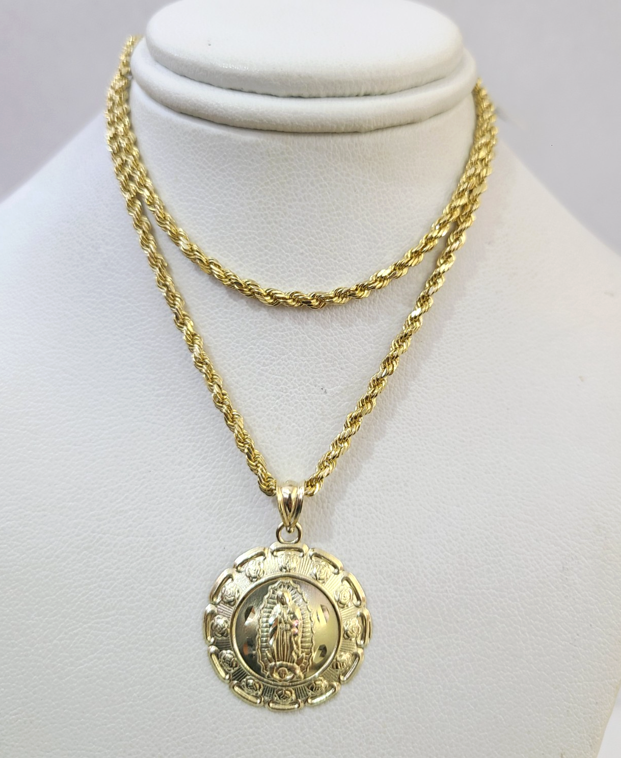 Real 10k Rope Chain Virgin Mary Charm Necklace SET 2mm 18"-28" end Pendant - 22 Inches