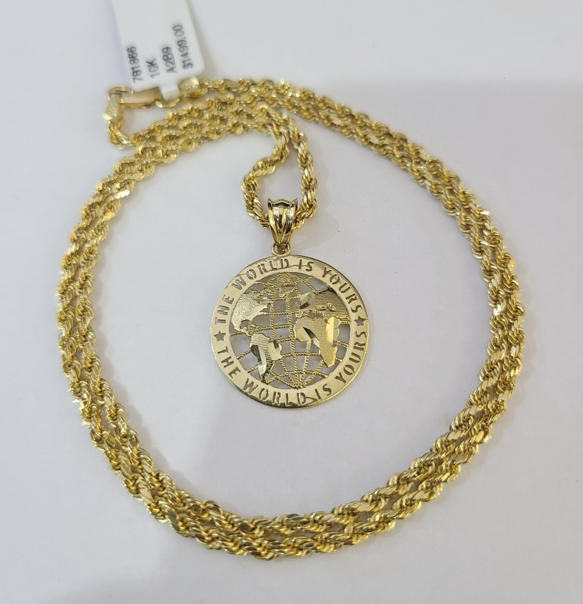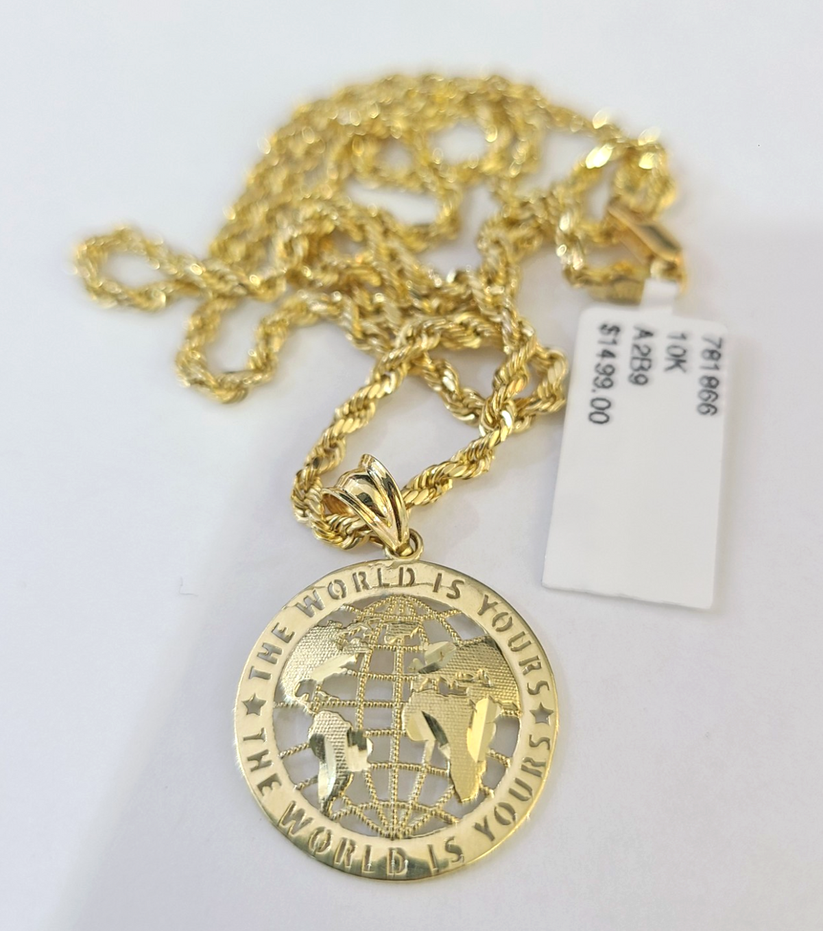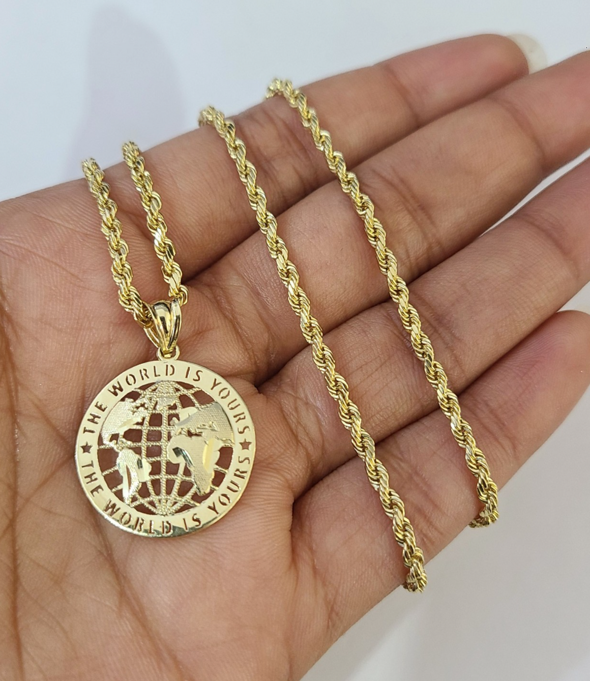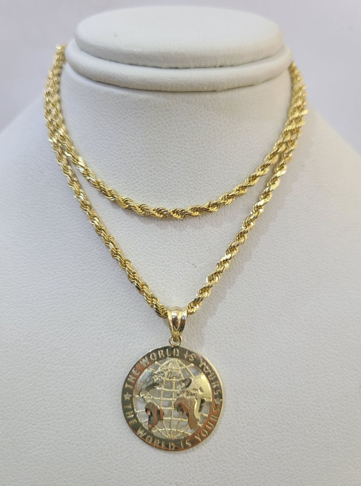 Real 10k Rope Chain World is Yours Charm Necklace SET 2mm 18"-28" Pend – Goldenlinq index