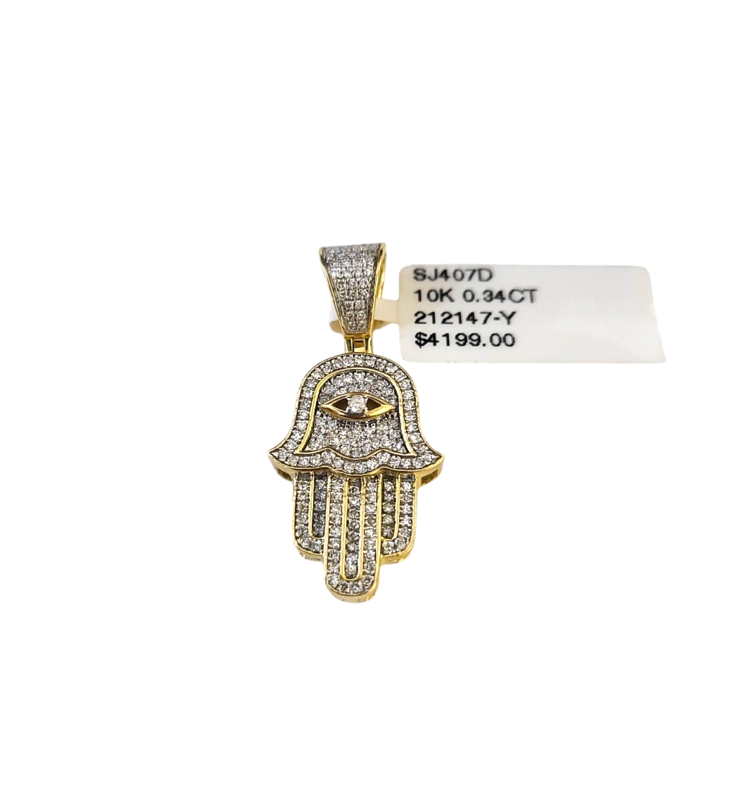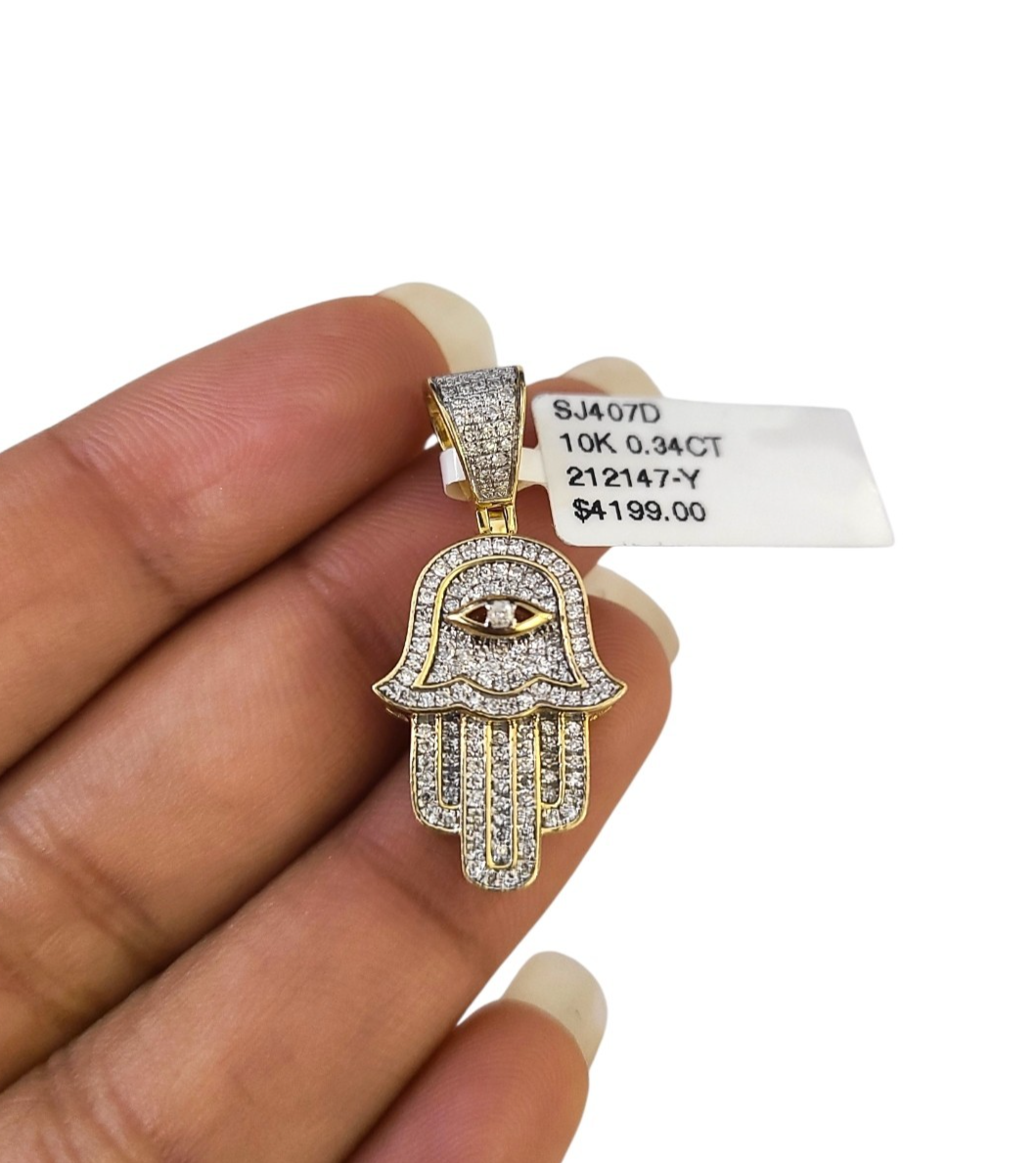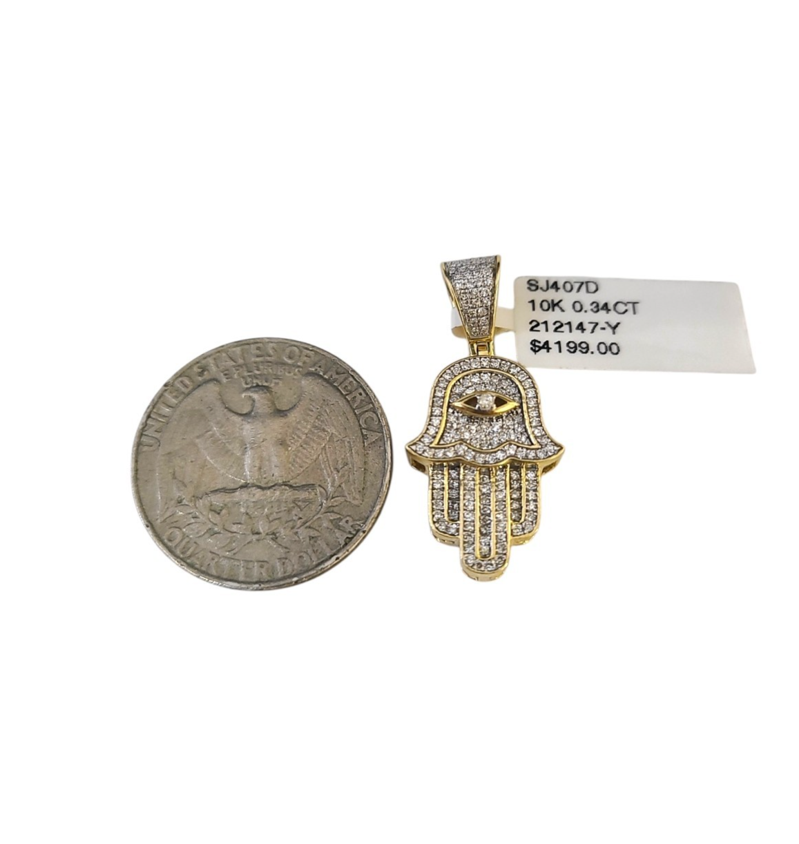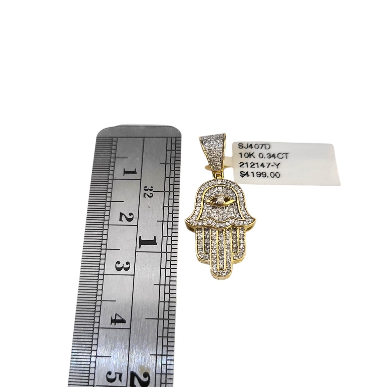 Real 10K Yellow Gold Hamza Hand Natural Diamond Charm Pendant | 1.2″ | Men & Women