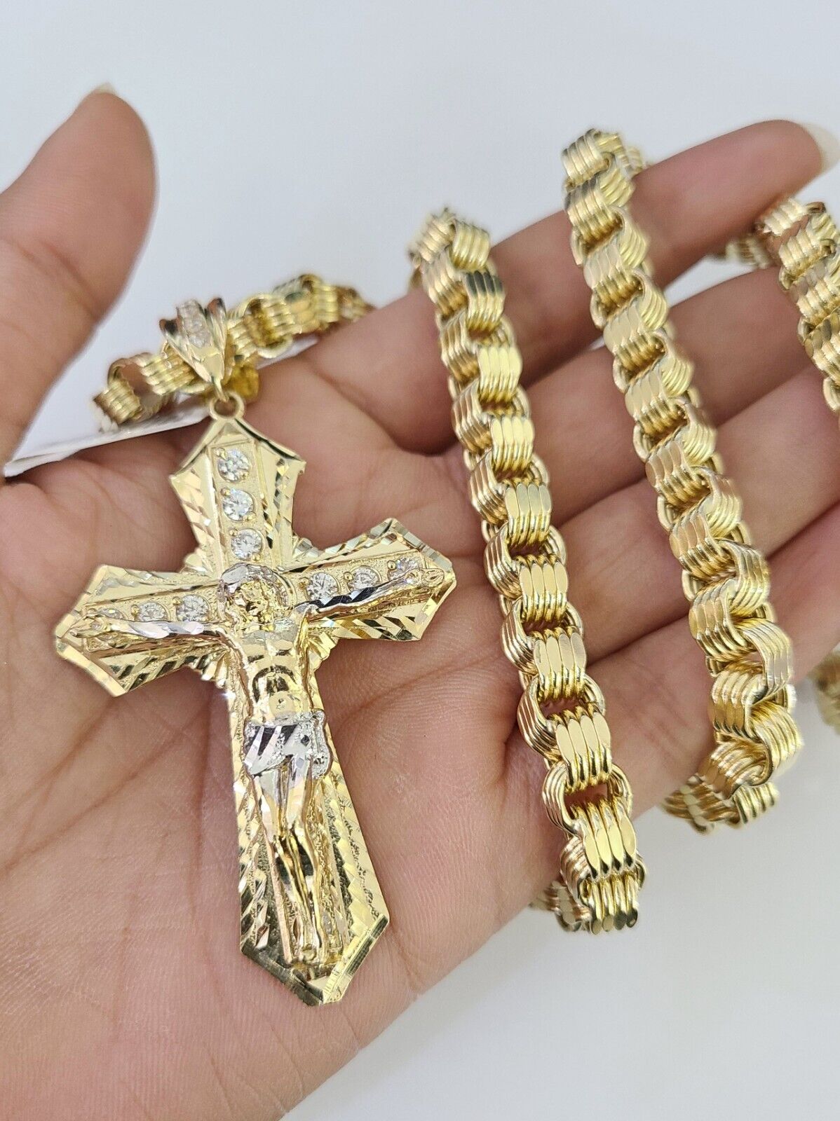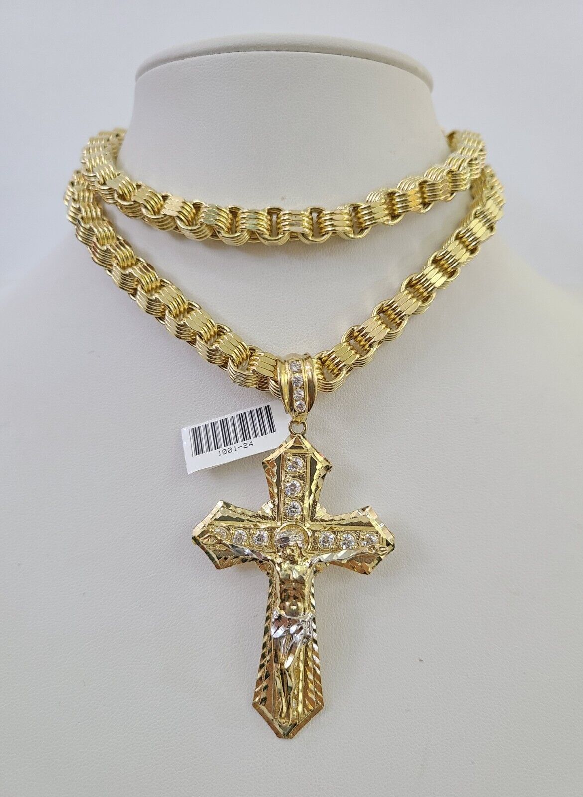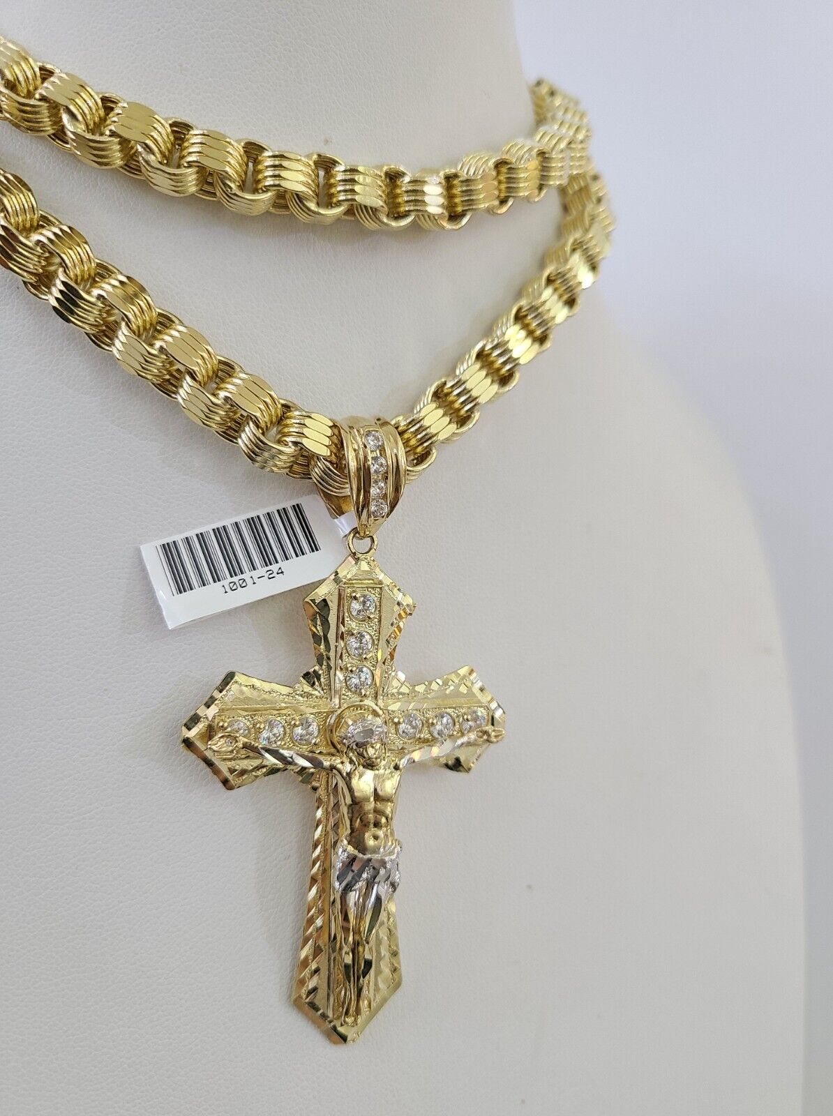 10k Gold Byzantine Chain Necklace Jesus Cross Pendant Charm SET 20"-30" 7.5mm - 22 inch with charm