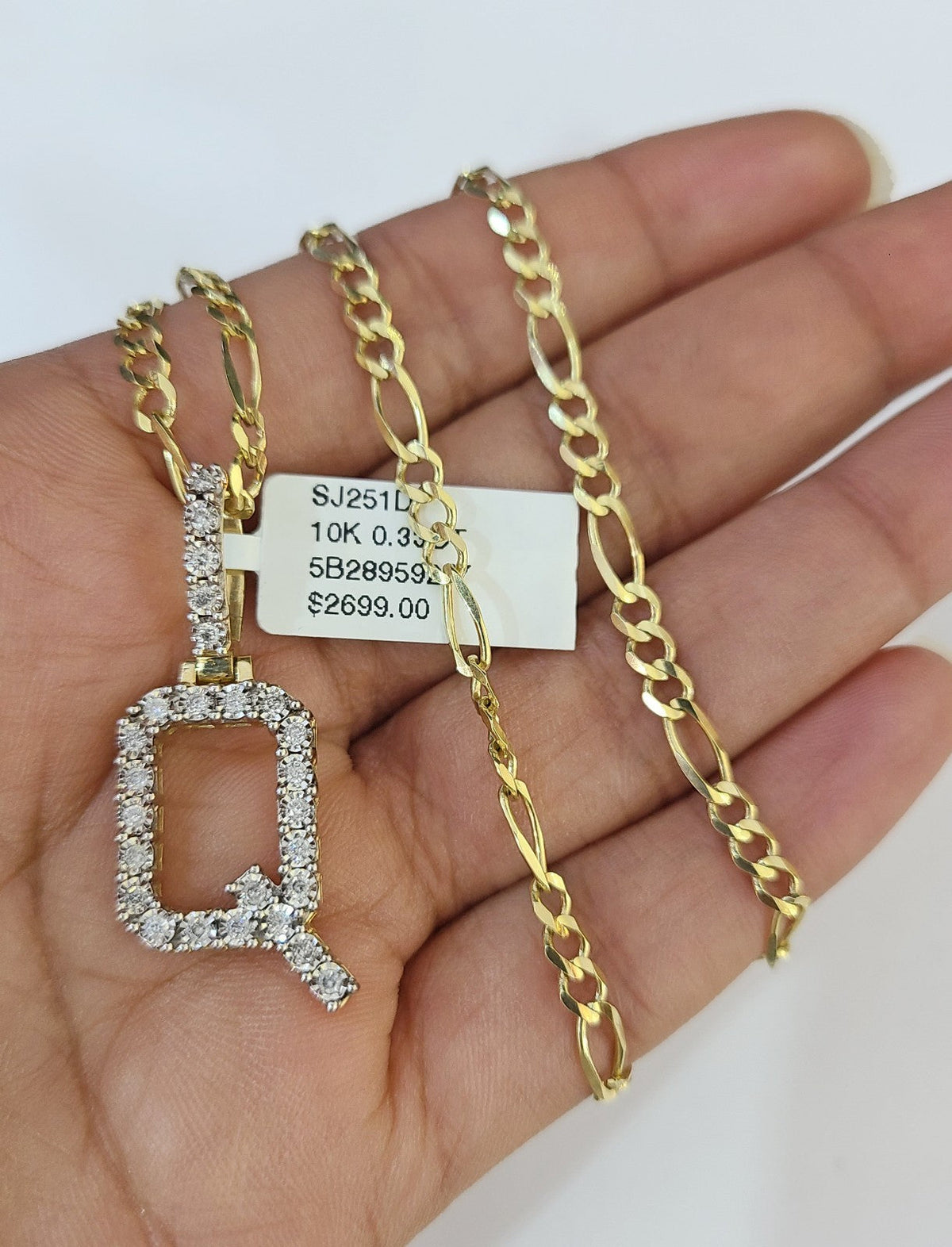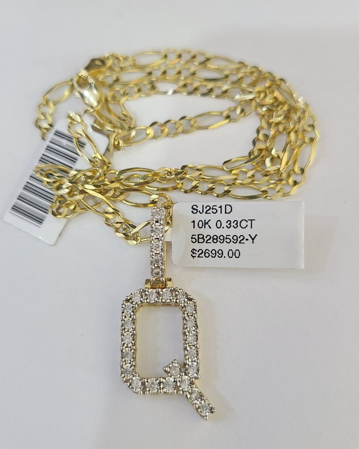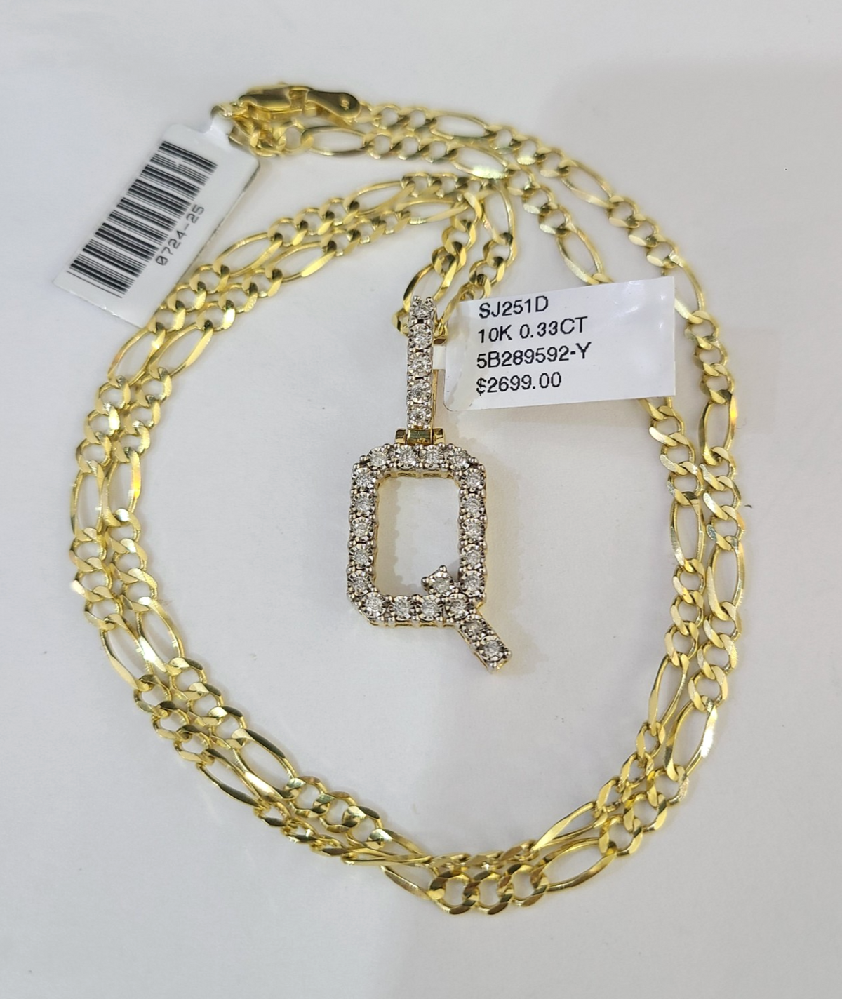 10k Gold Figaro Chain Q Diamond Initial Pendant 3mm 20-28 inch SET Necklace - 20 Inch with Chain