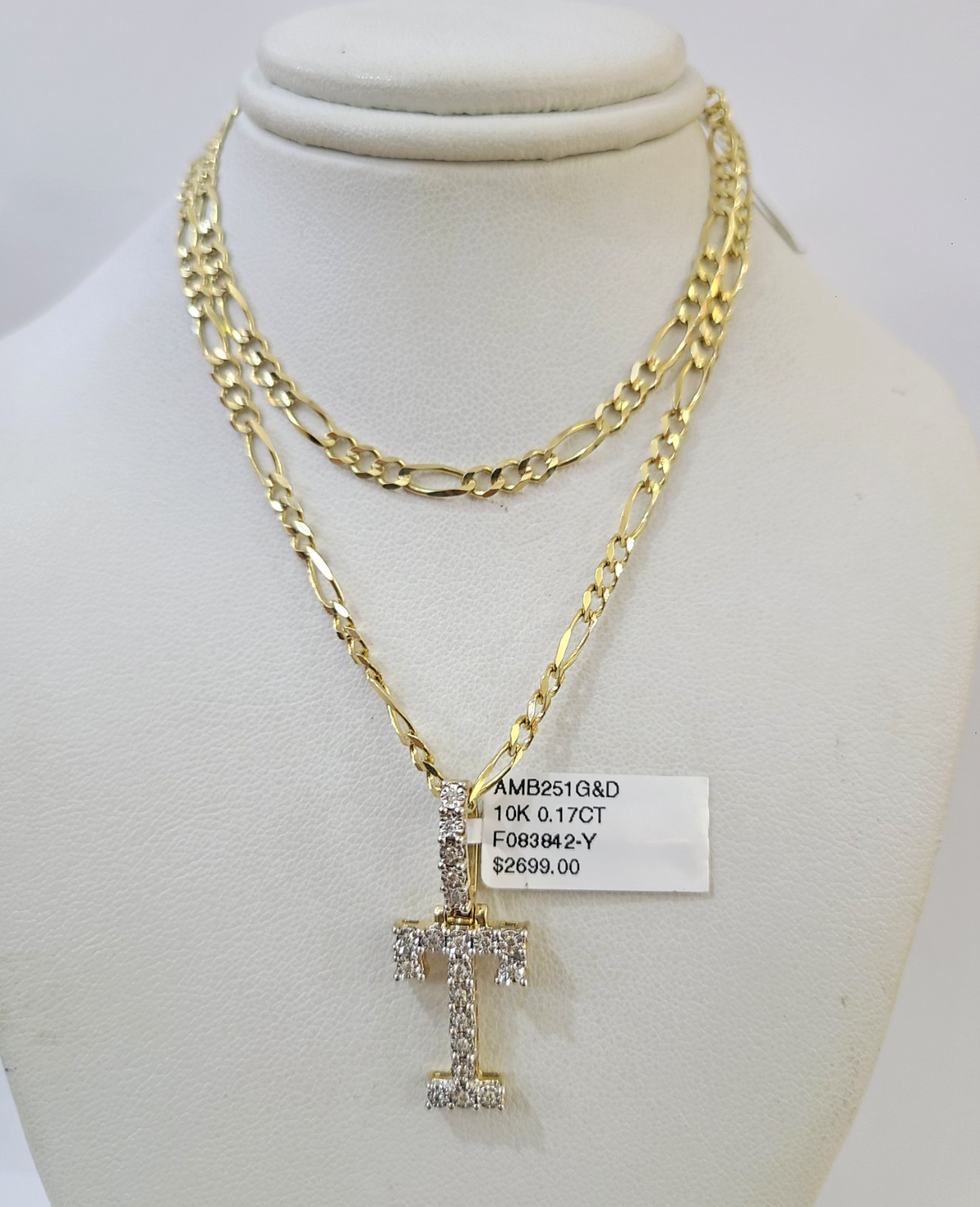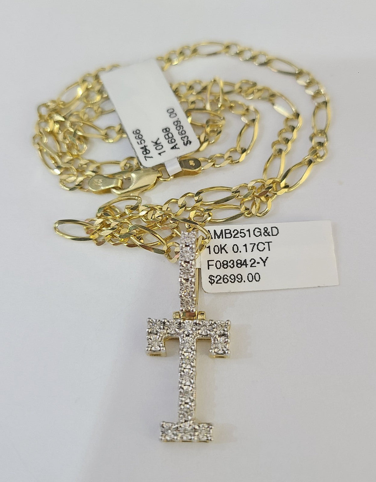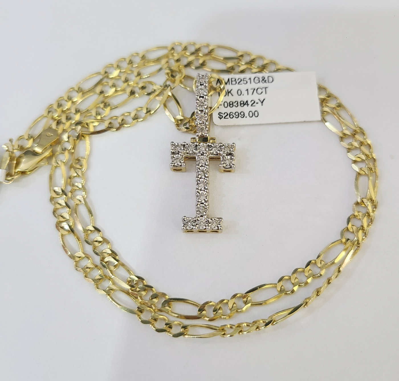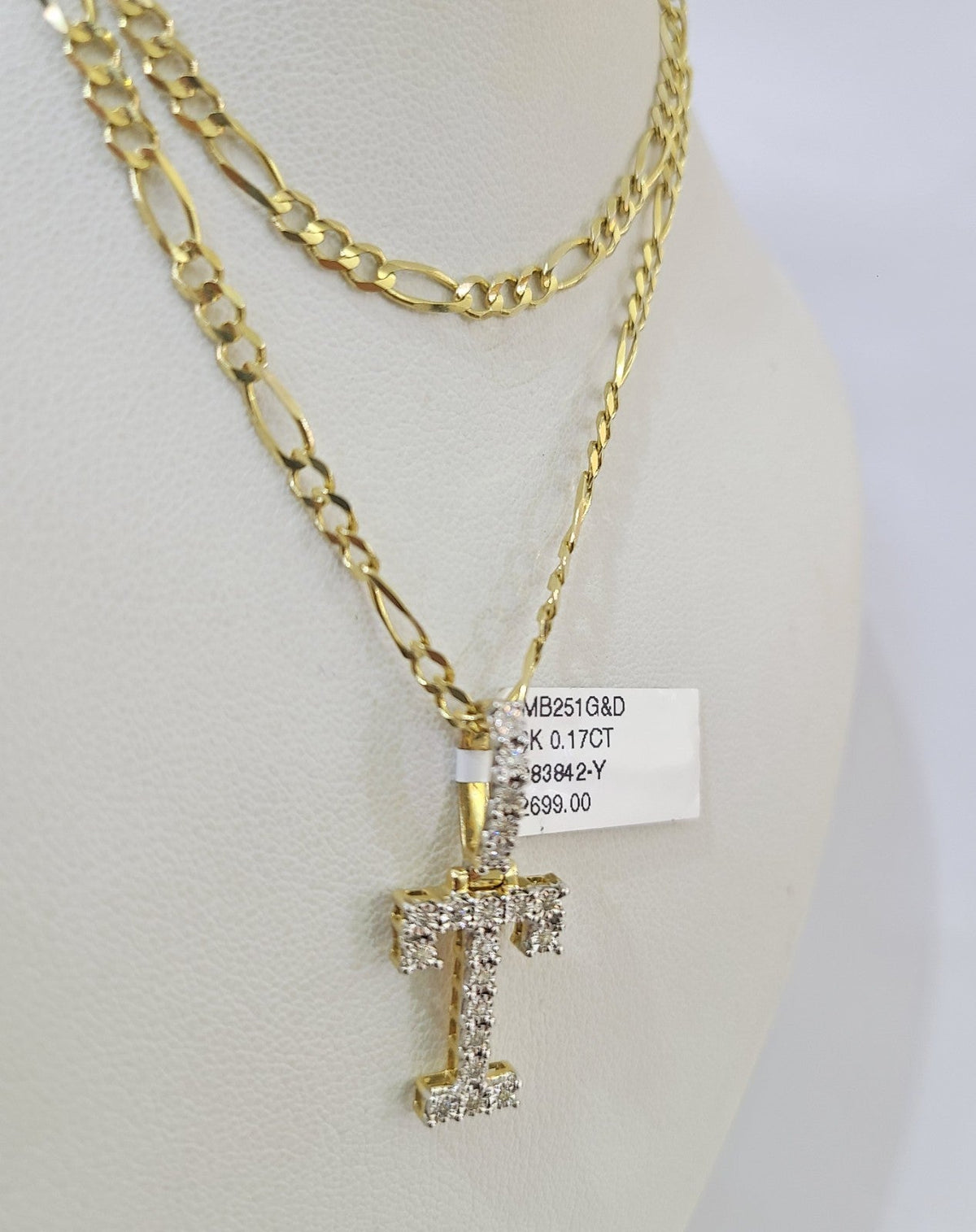 10k Gold Figaro Chain T Diamond Initial Pendant 3mm 20-28 inch SET Necklace - 20 Inch with Chain