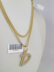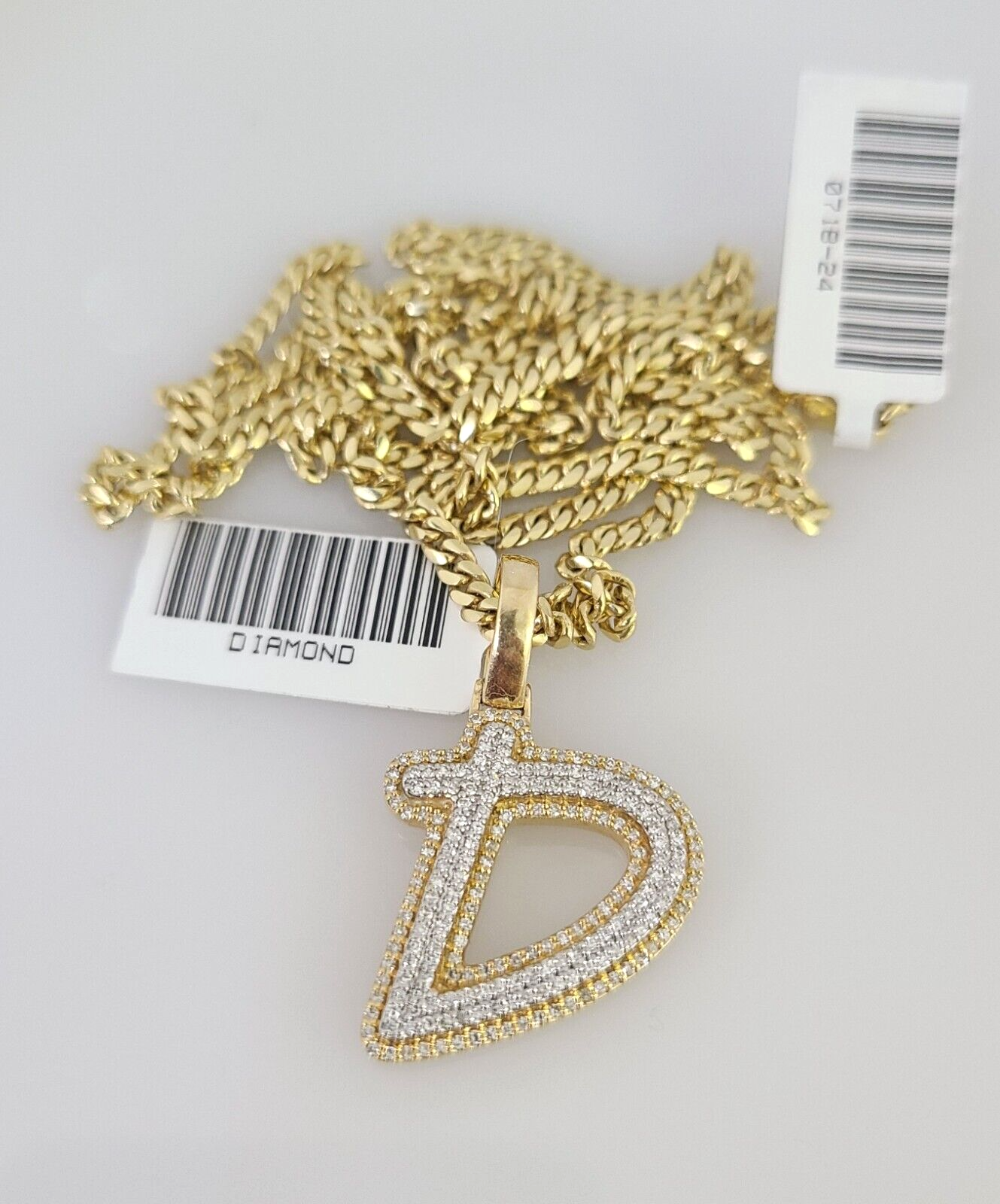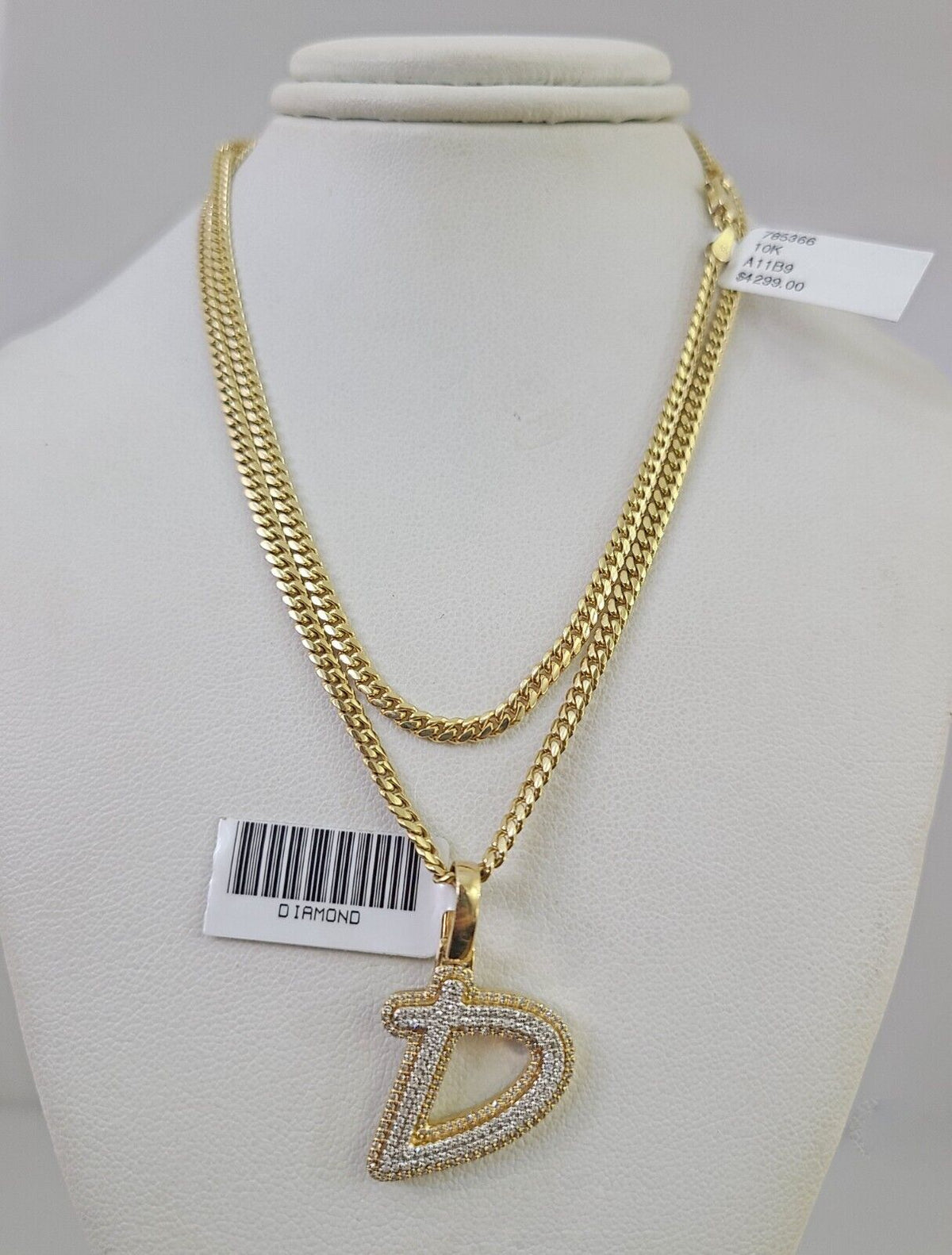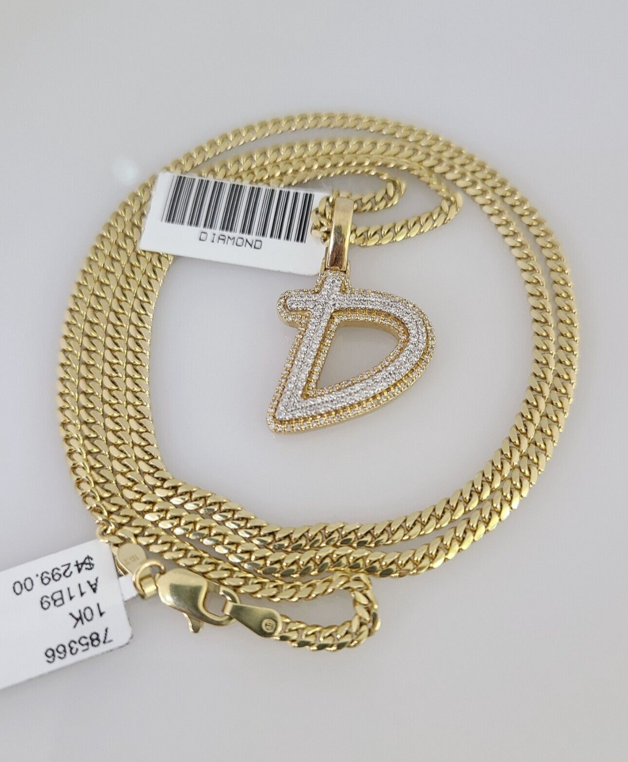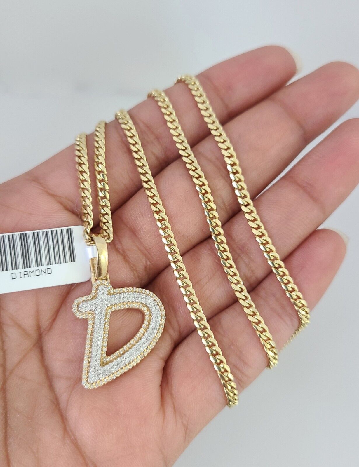 Genuine 10k Yellow Gold Miami Cuban Necklace 2.5mm Chain With Diamond D Alphabet or Initial Charm. The Various lengths of the Chain are 18"-24". The pendants are unique in design and considered durable too. If you are not happy with the way it looks or feels, we do offer 30 - Days FREE Return shipping. Contact us for more information.