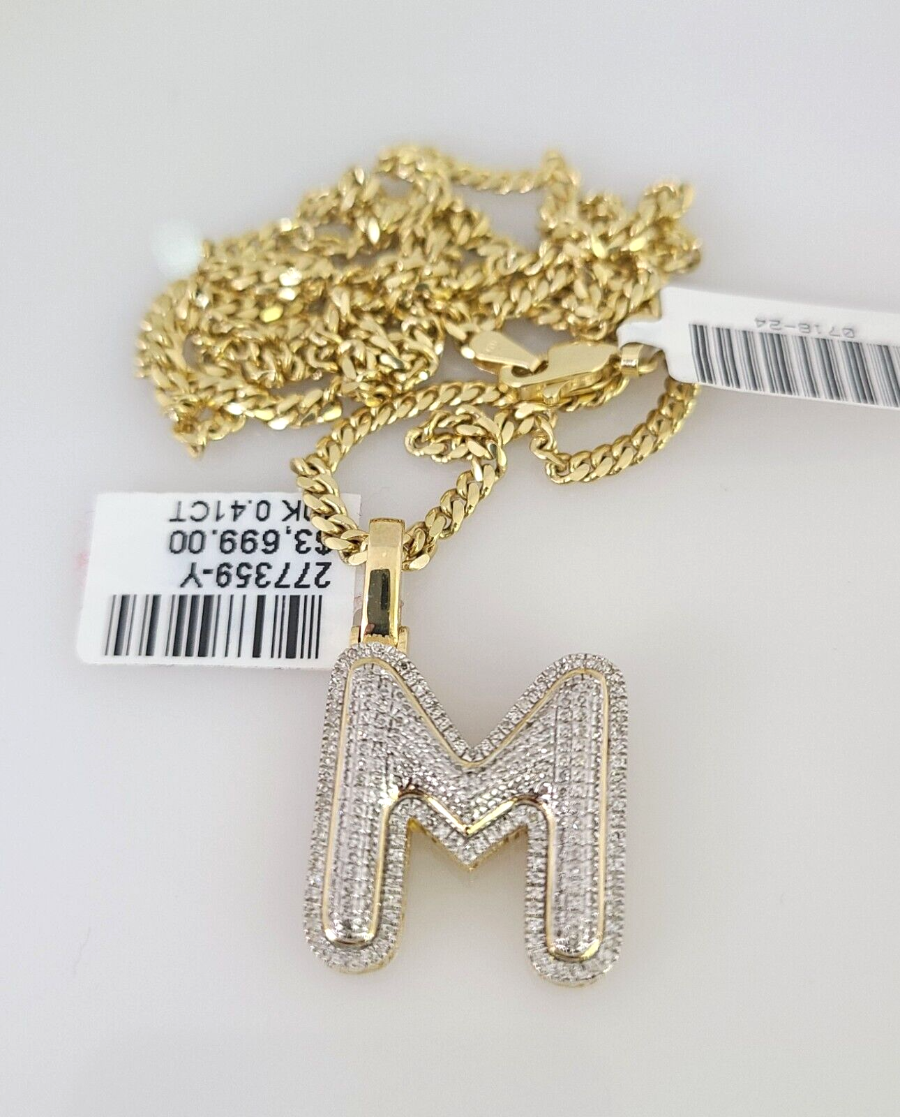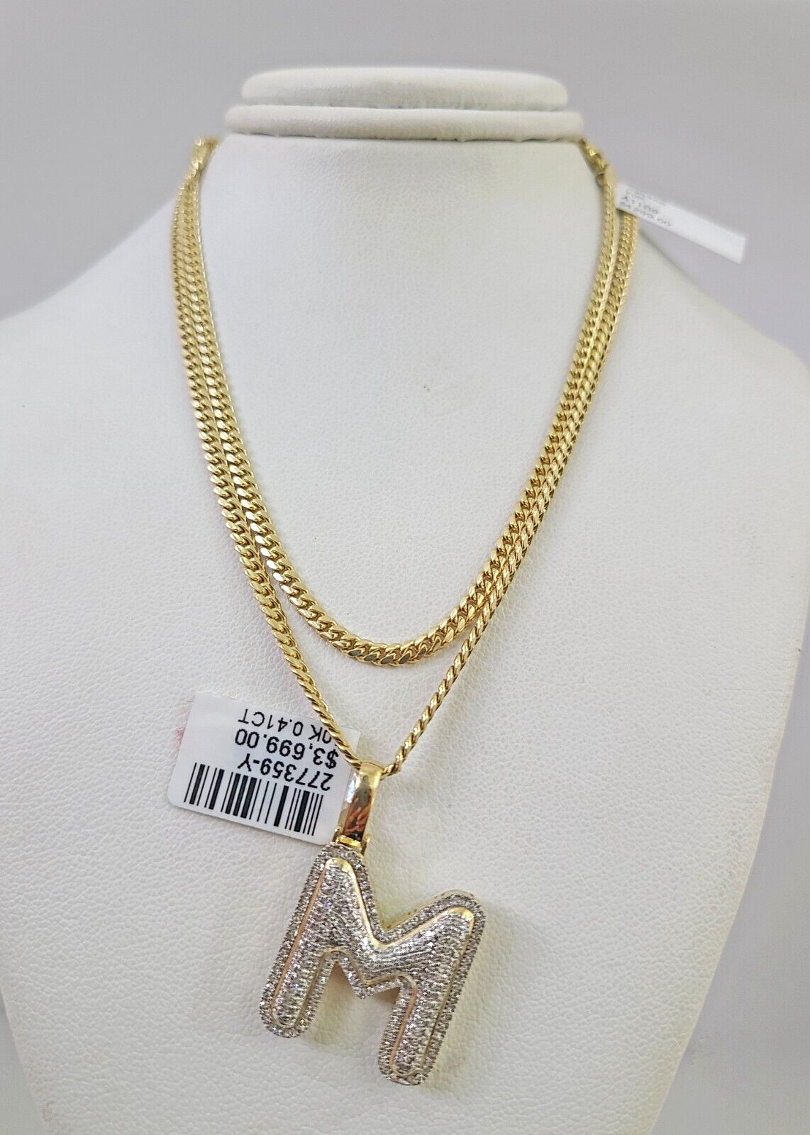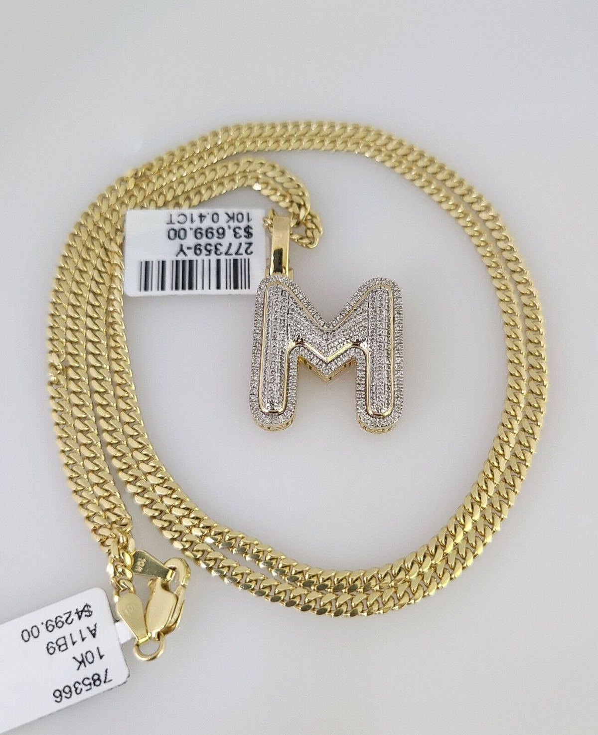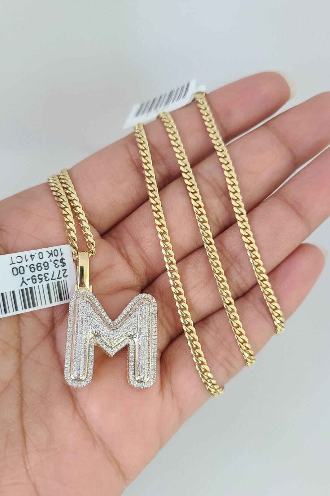 10k Gold Solid Miami Cuban Chain Diamond M Initial Pendant 2.5mm 18"-24" Set - 20 Inch