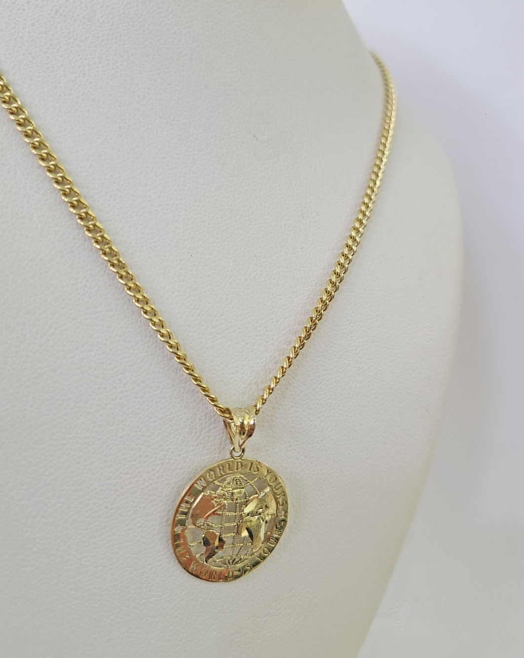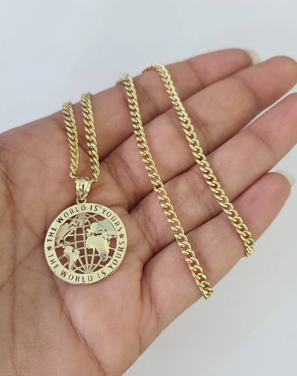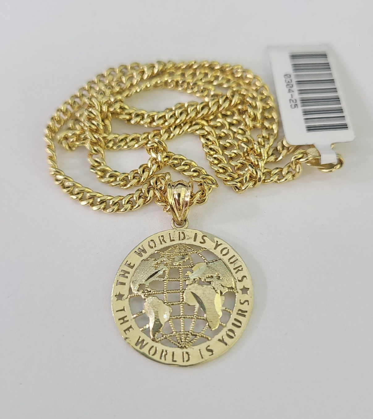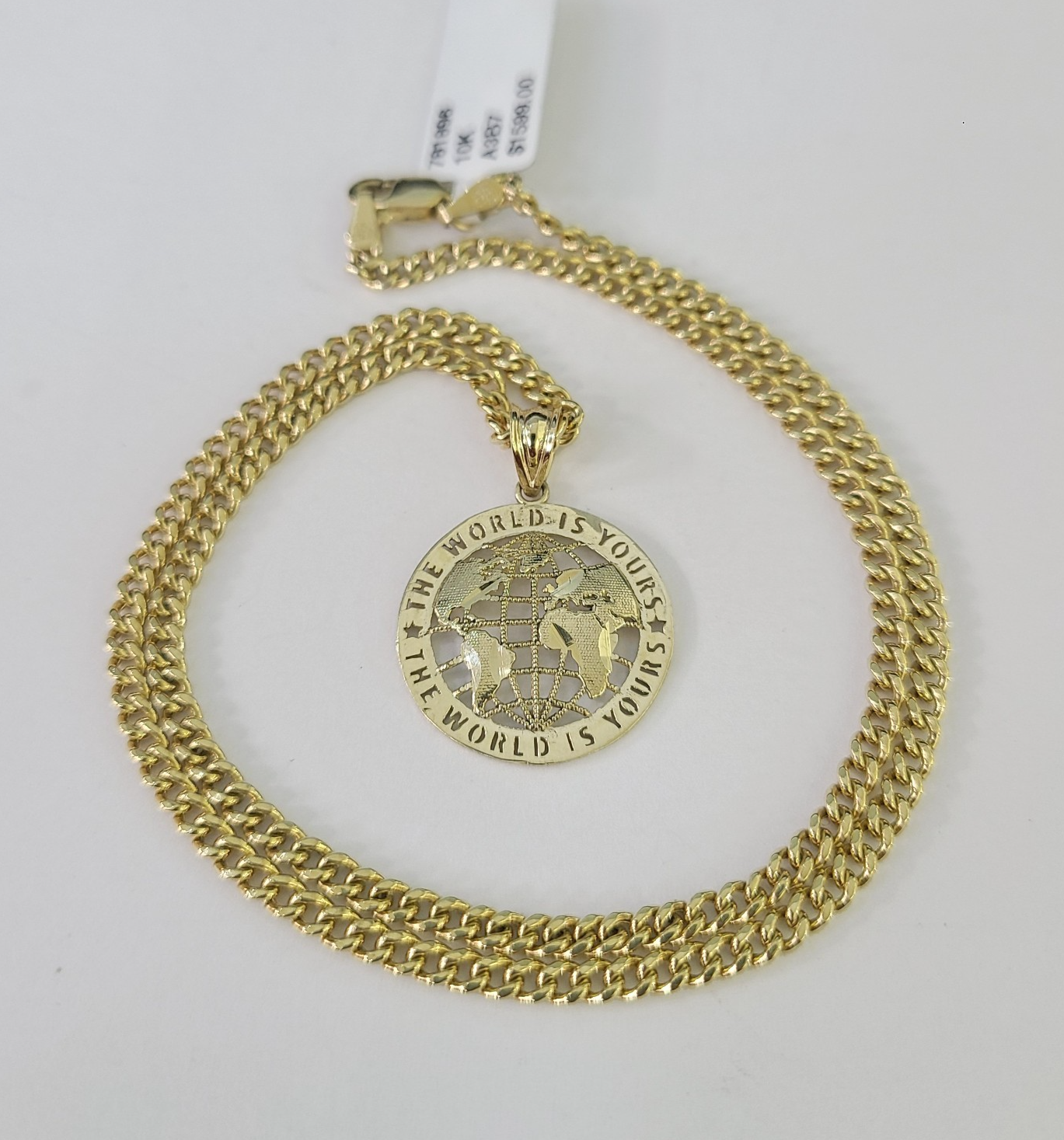 10kt Gold Miami Cuban Chain World is Yours Charm Pendant 3mm 18-28 Inch Necklace SALE