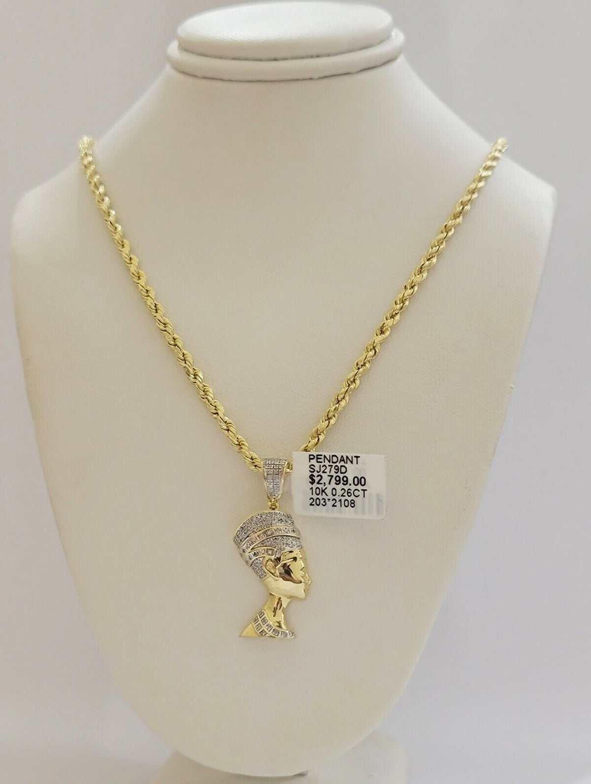 Genuine 10 k Yellow Gold Rope Chain 3mm With Real diamond Pharaoh Head design Pendant. The Various length of the Chain are 18"-28" with pendant 1.3 inches. The pendants are unique in design and considered durable too. The stones are Diamonds. If you are not happy with the way it looks or feels, we do offer 30 - Days FREE Return shipping. Contact us for more information.