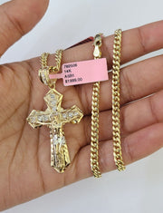 Real 14k Chain Cross Charm Set Miami Cuban Link 4mm Necklace Pendant Yellow Gold - With 18 Inch Chain