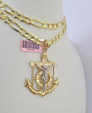14k Figaro Chain Jesus Anchor Charm Pendant Gold 7mm 20-30 inch SET Necklace - 20" Chain with Charm