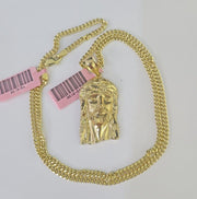14k Miami Cuban Chain Jesus Head Charm Yellow Gold Set 3mm 18"-28" Necklace - With 18 Inch Chain