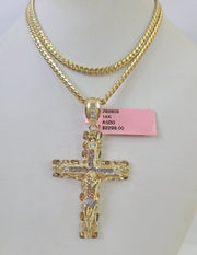 Real 14k Solid Chain Cross Charm Set Miami Cuban Link 3mm Necklace Pendant Gold