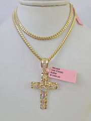 Real 14k Solid Chain Cross Charm Set Miami Cuban Link 3mm Necklace Pendant Gold - With 18 Inch Chain